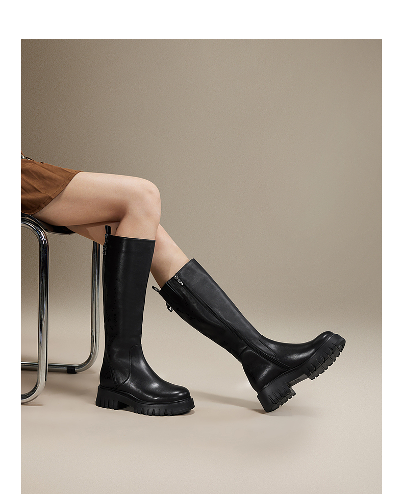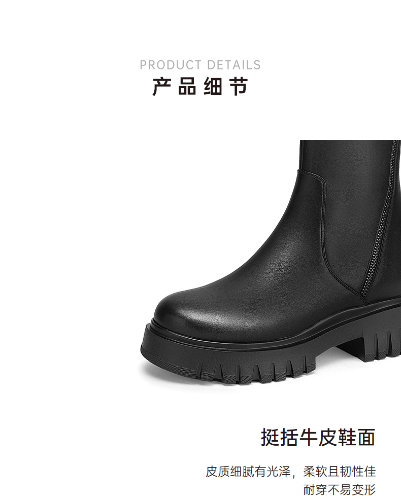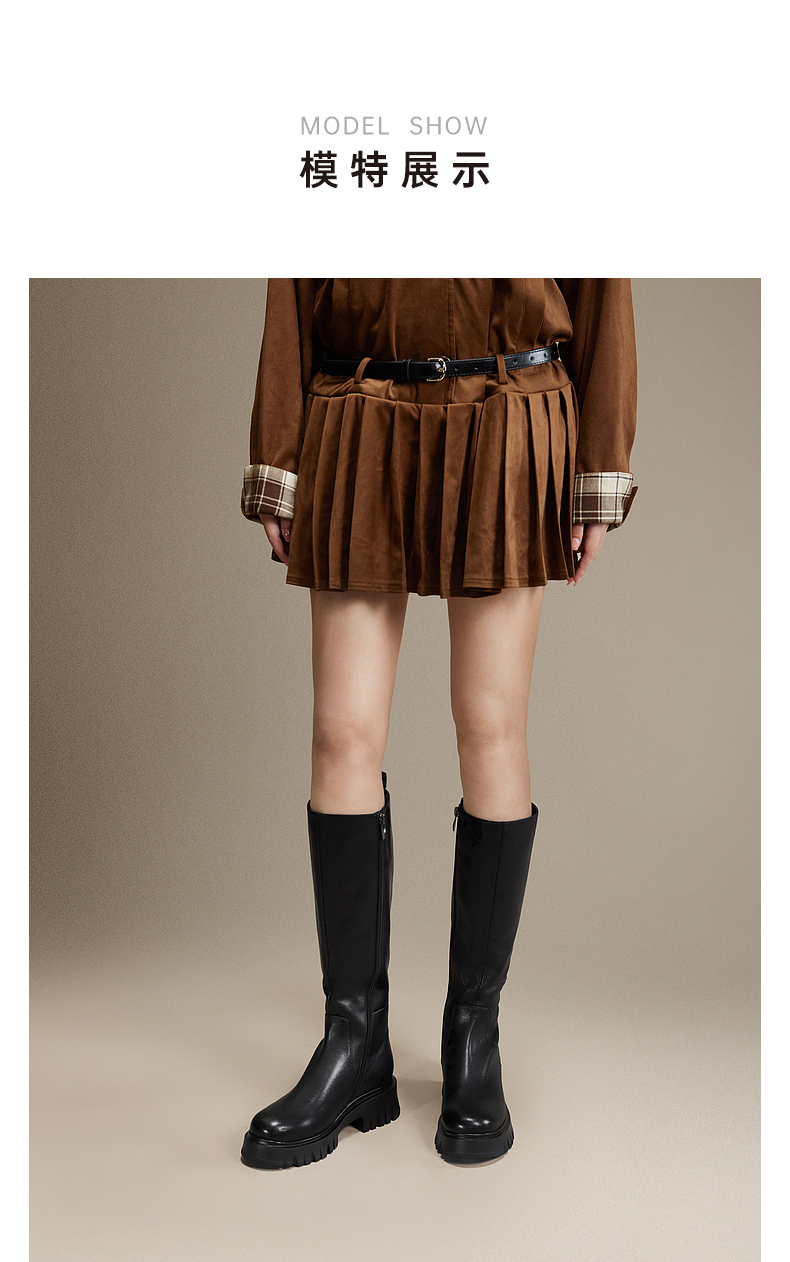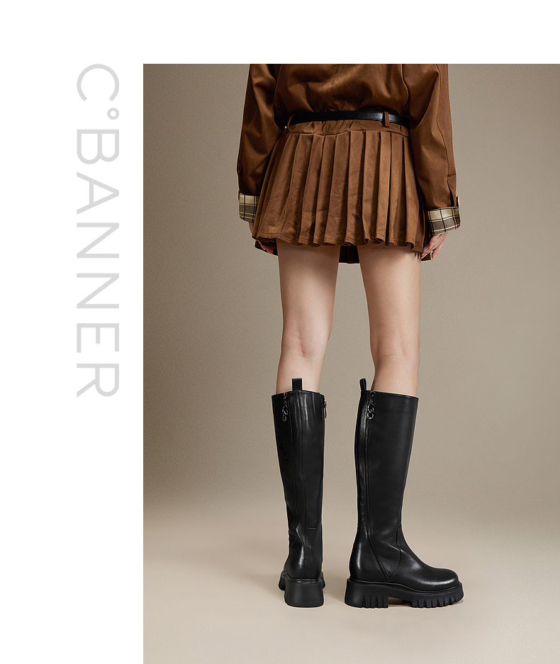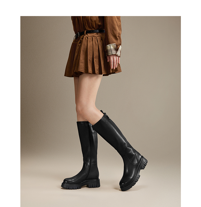 千百度厚底真皮骑士靴女款冬季高筒长靴A24516565