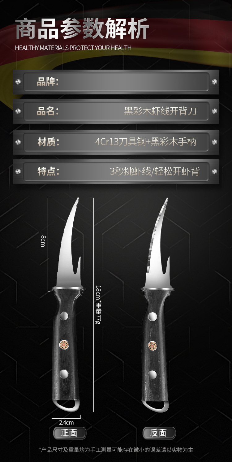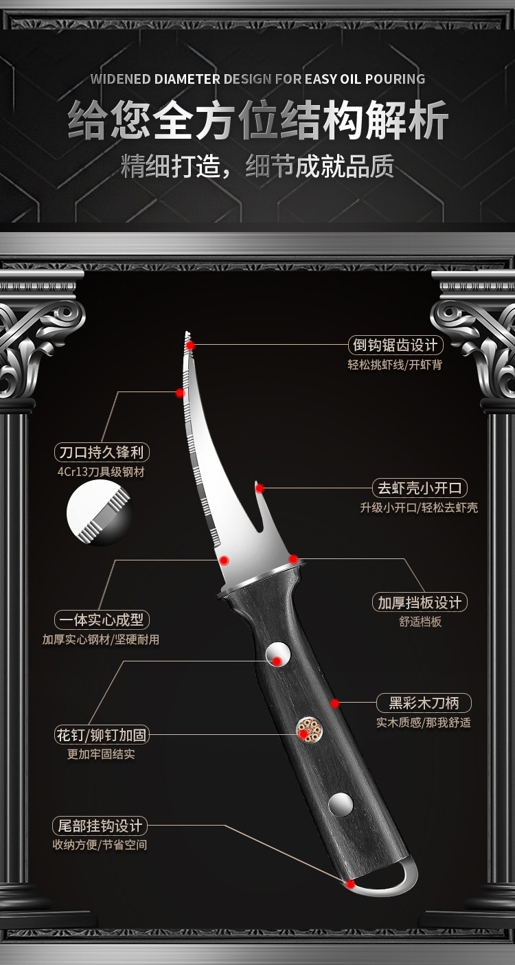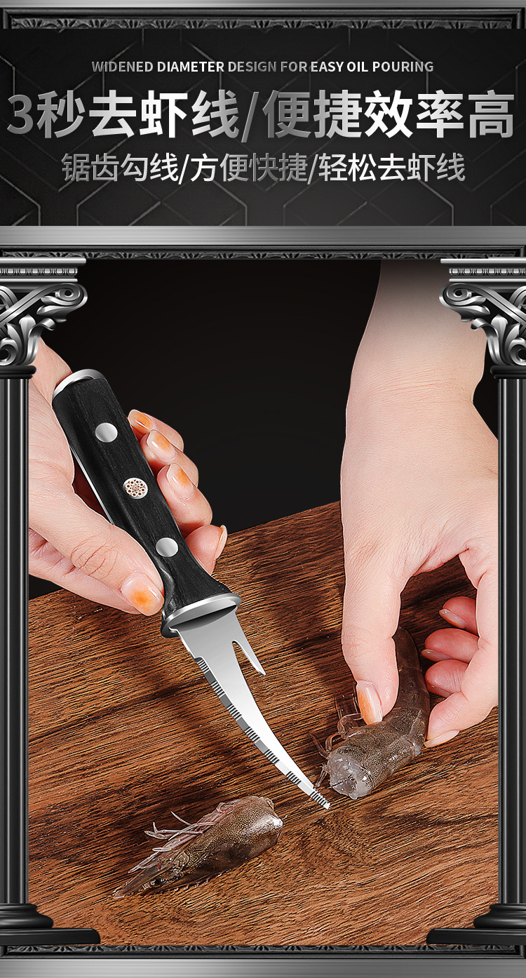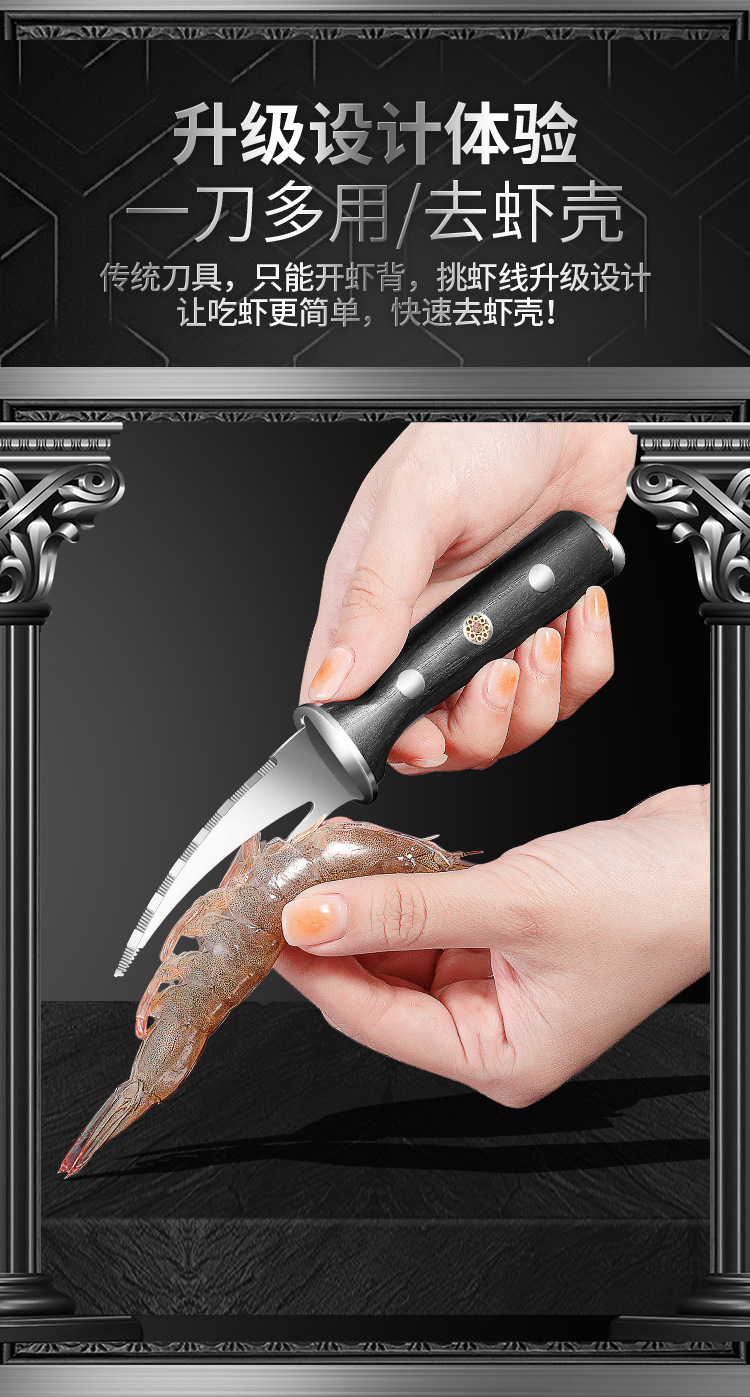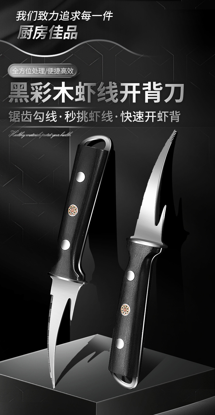 【跨境出口德国虾线刀】跨境不锈钢虾线刀家用黑彩木多功能开虾背小工具厨房多用途鱼肚刀