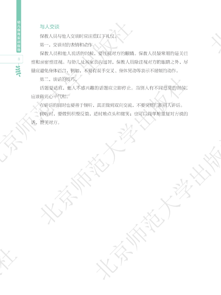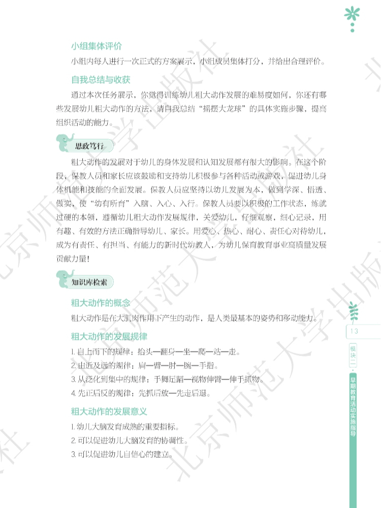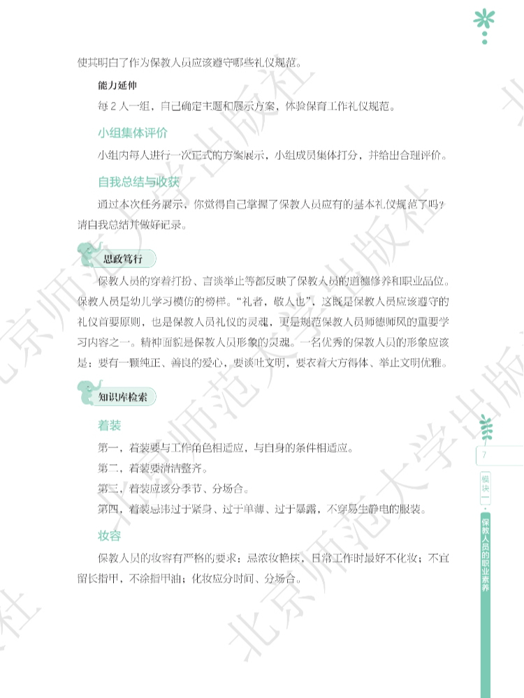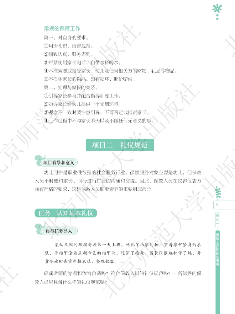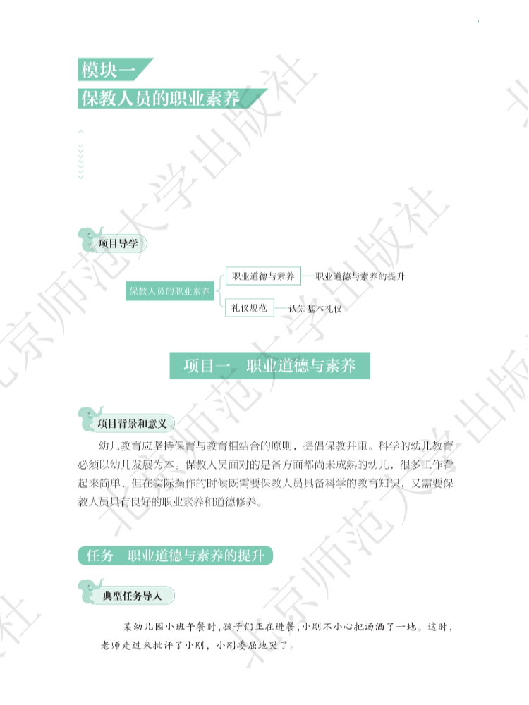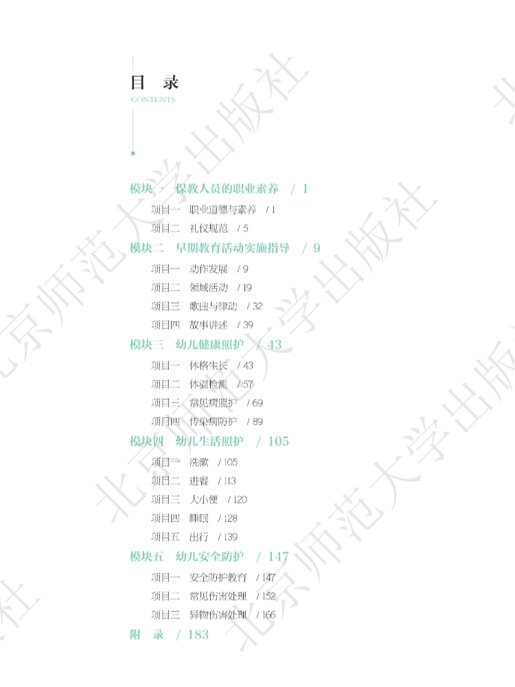 本教材在内容上对接幼儿保育专业标准和“幼儿照护”职业技能等级证书标准,紧扣婴幼儿身心特点和托育托幼领域工作任务,体现“职业活动”“工作过程”导向的指导思想;在结构上按任务项目架构,设置职业道德素养、生活保育、健康照护、安全保育、早期教育指导五大项目,每个项目包括项目导学、单元引领、典型任务、任务实施导航、学习内容、同步练习、知识库对接和思政笃行,建构教材新形态,努力适应新技术背景下的任务型学习模式。