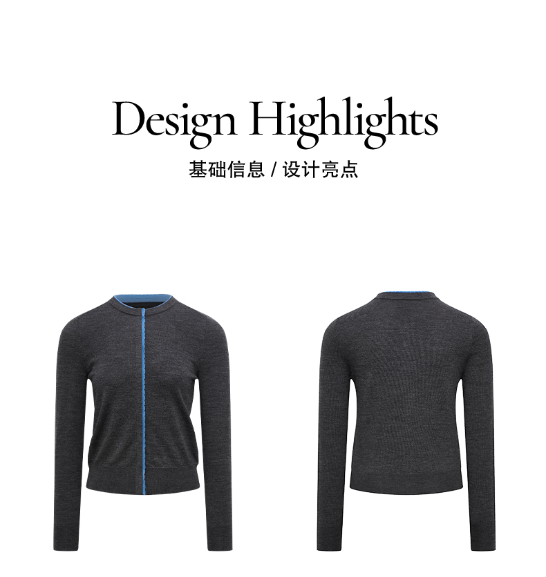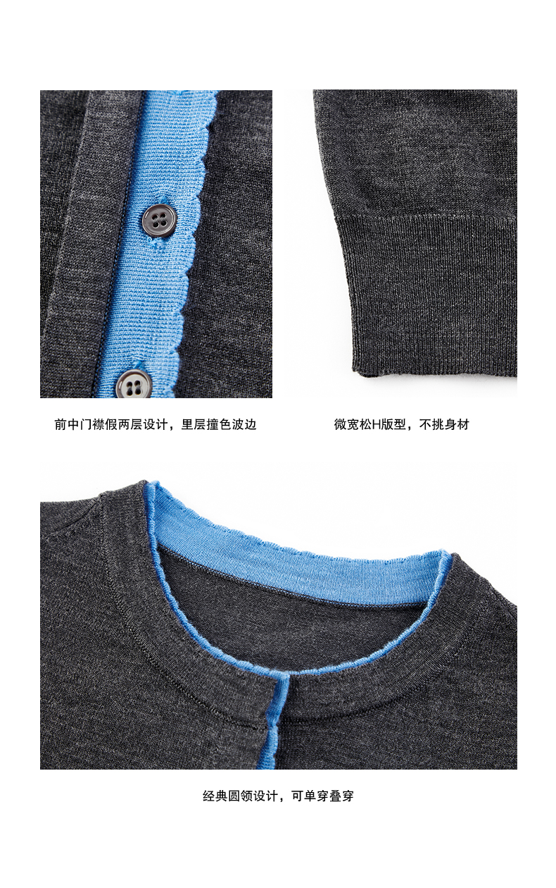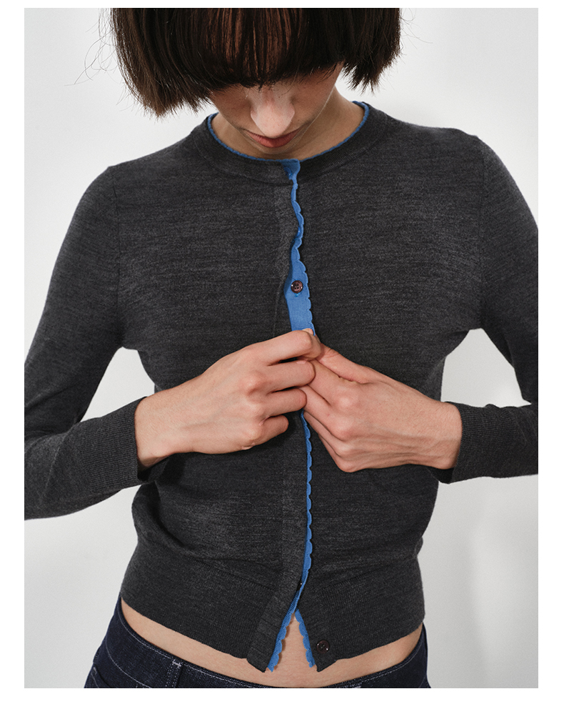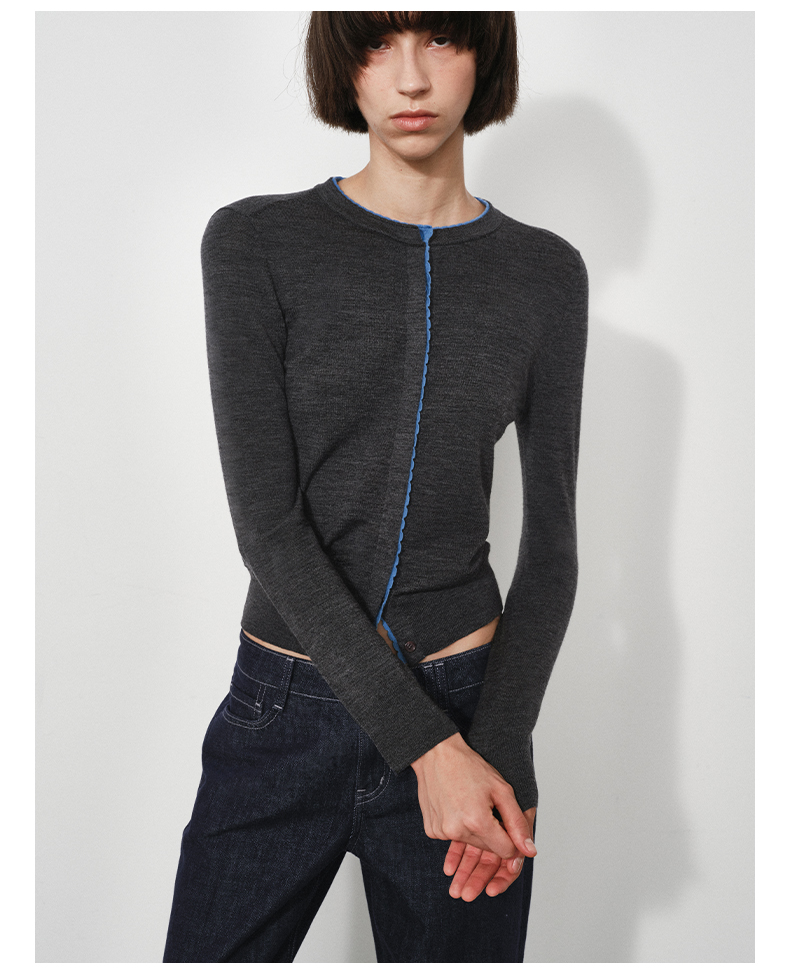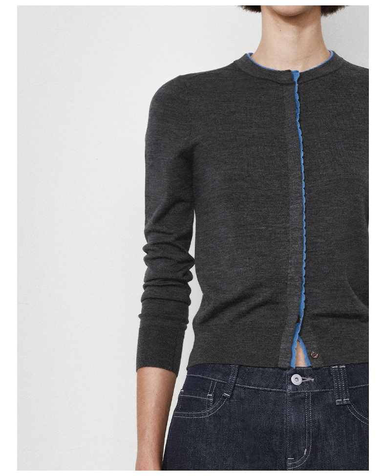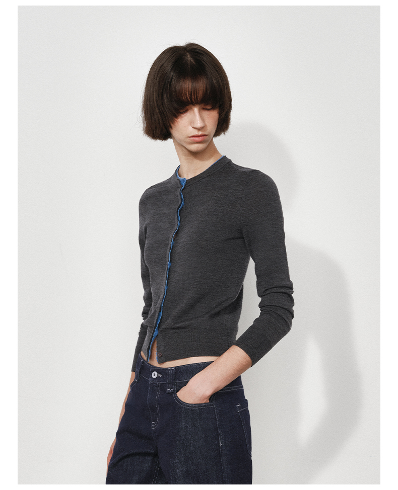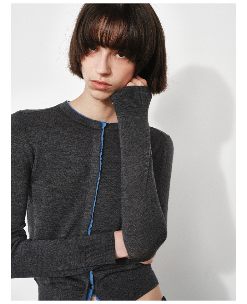 NUTH 可机洗100%纯羊毛撞色灰色修身短款长袖针织开衫女(发货时间同步天猫)