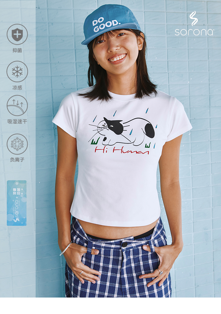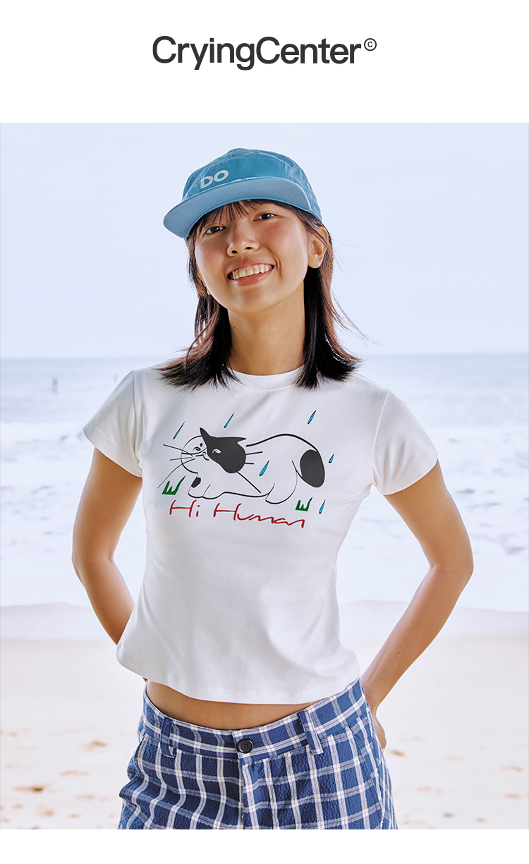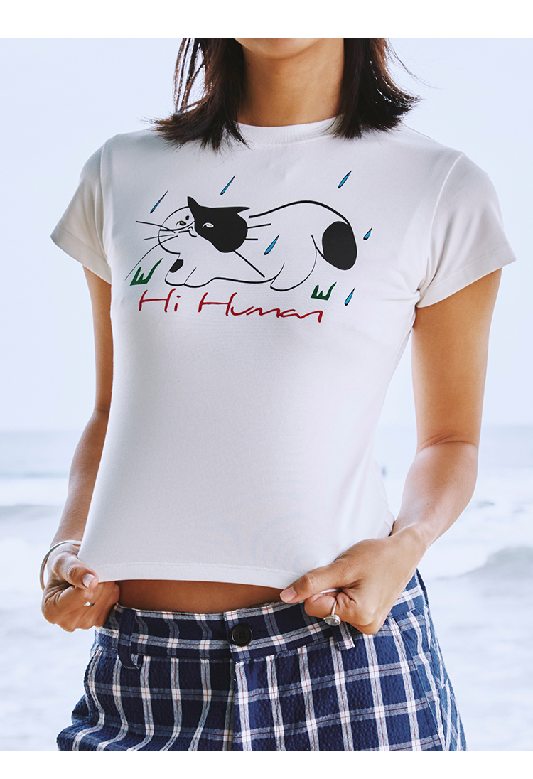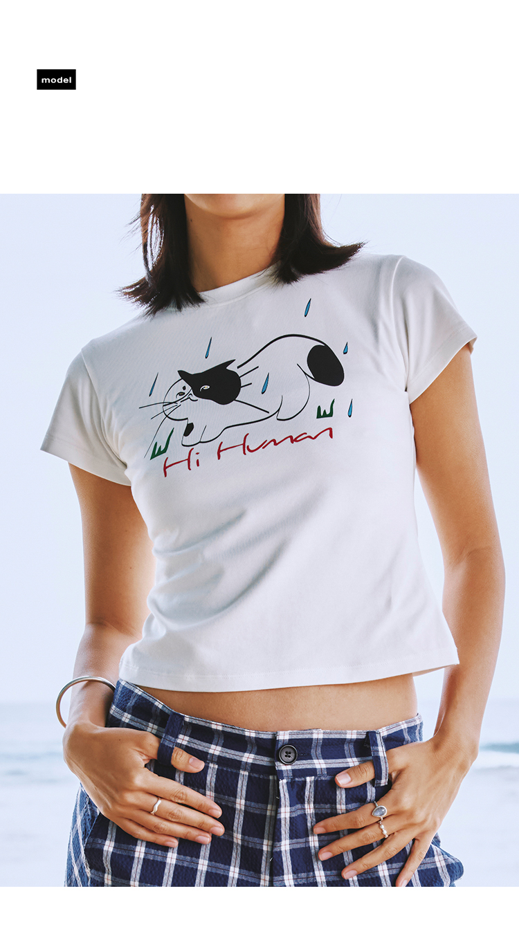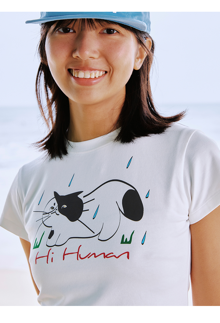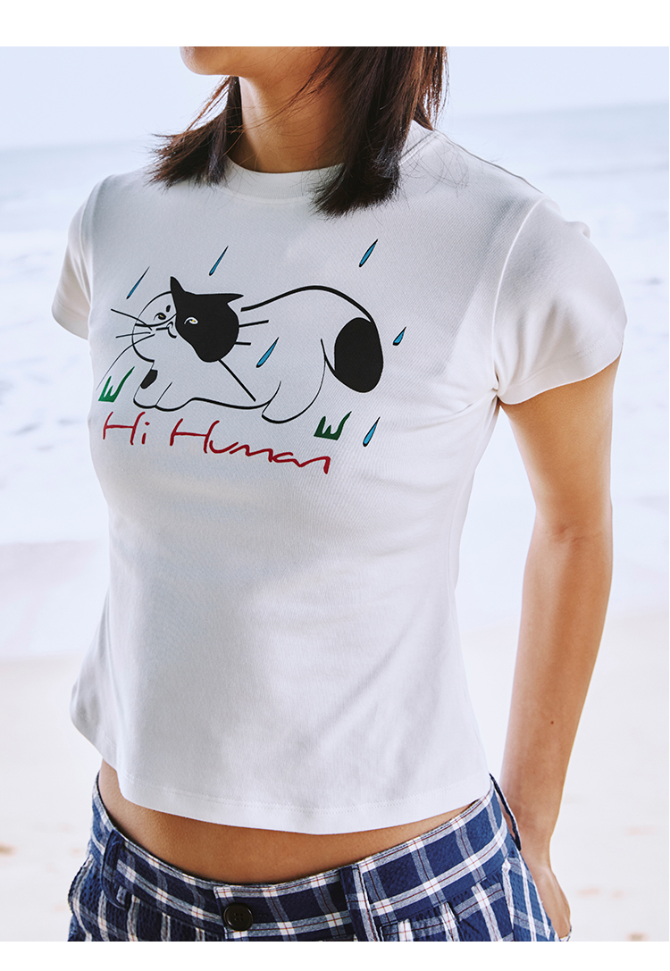 CryingCenter 你好小猫印花正肩弹力修身辣妹短袖 哭喊中心