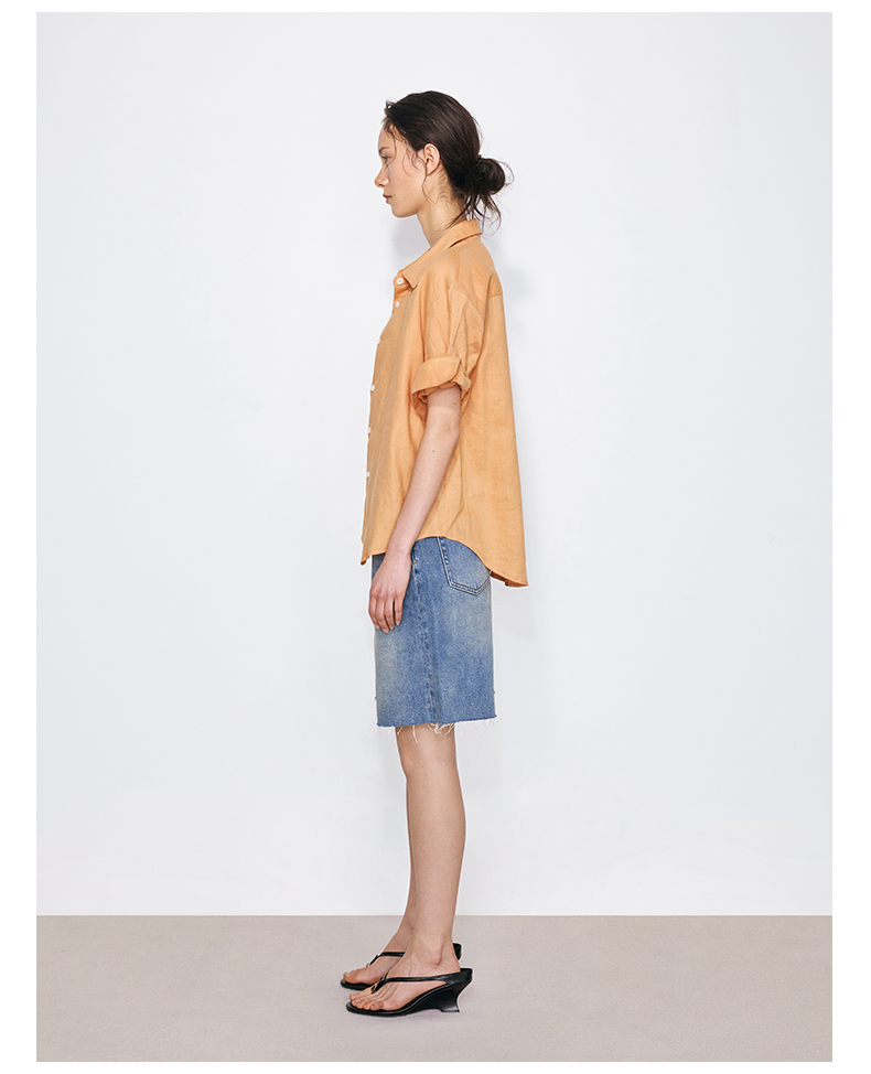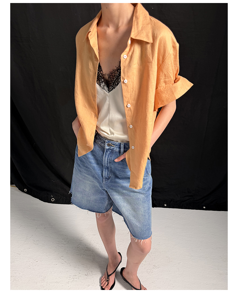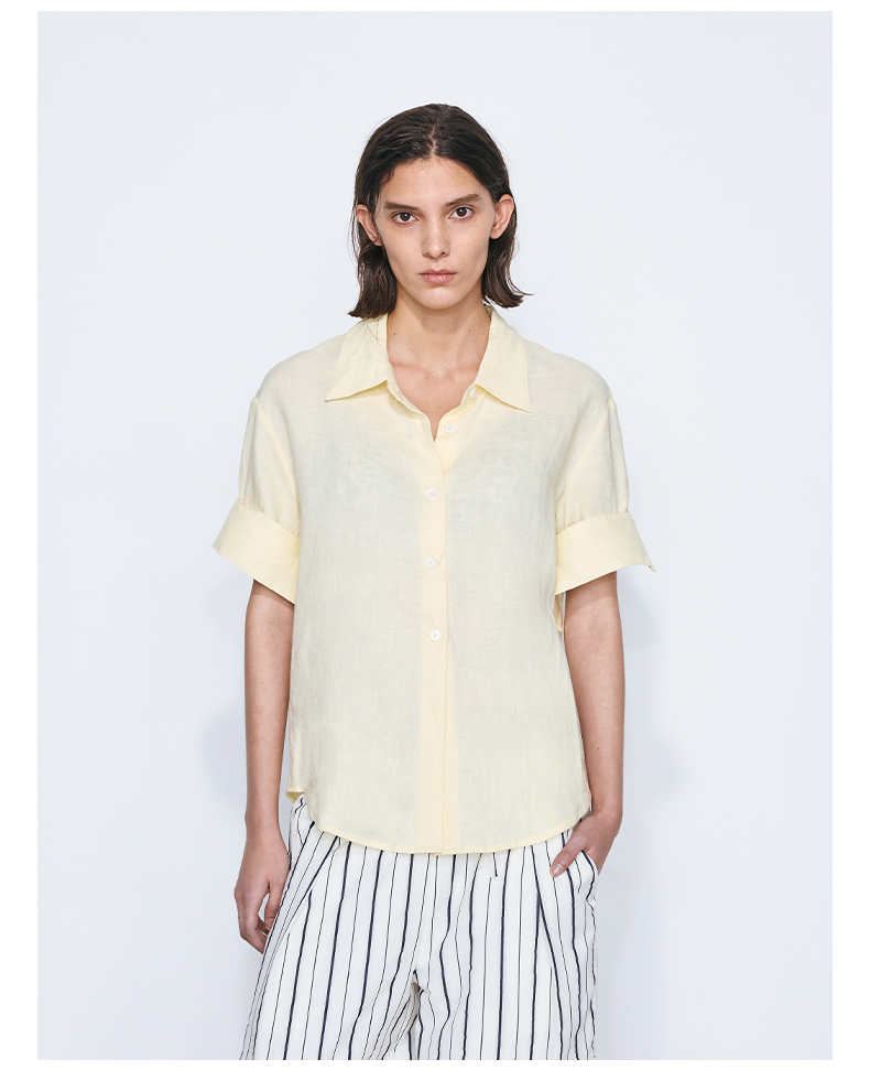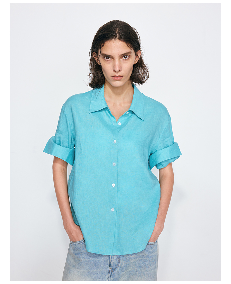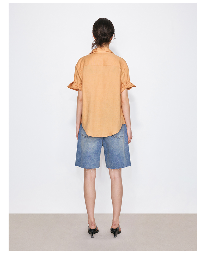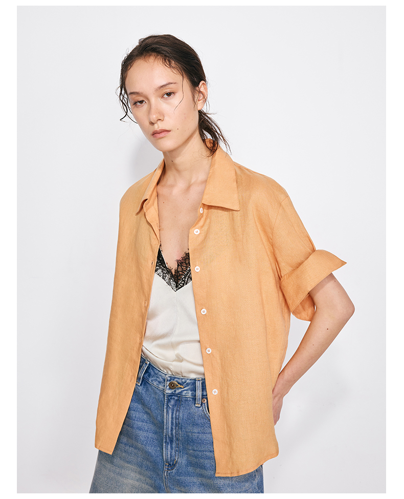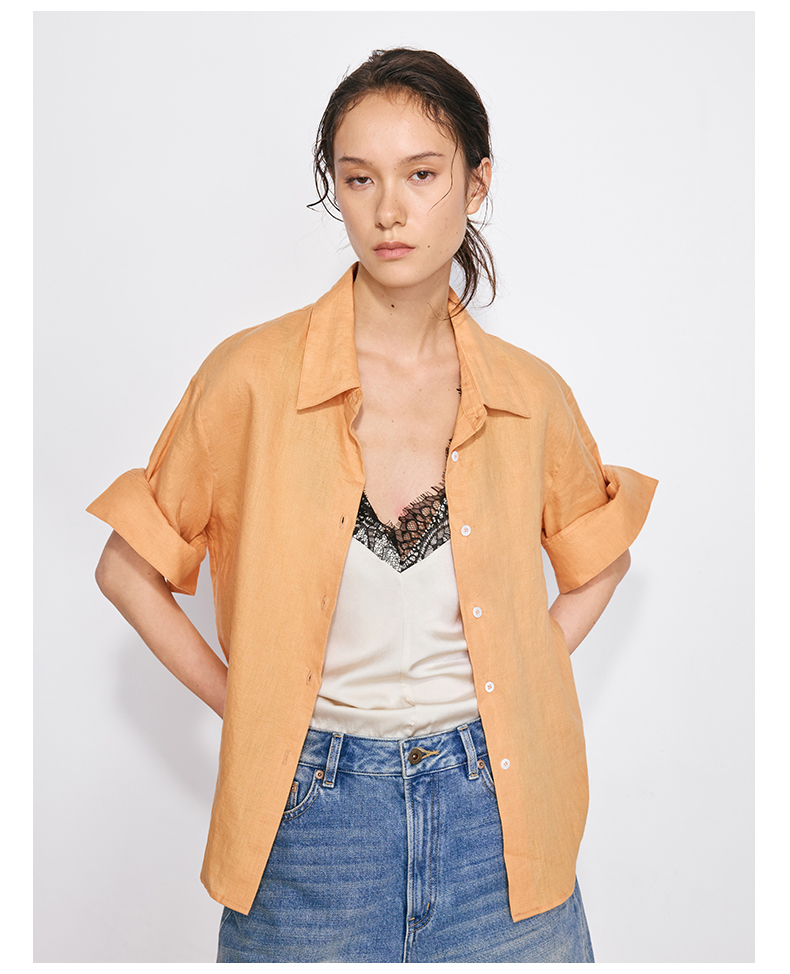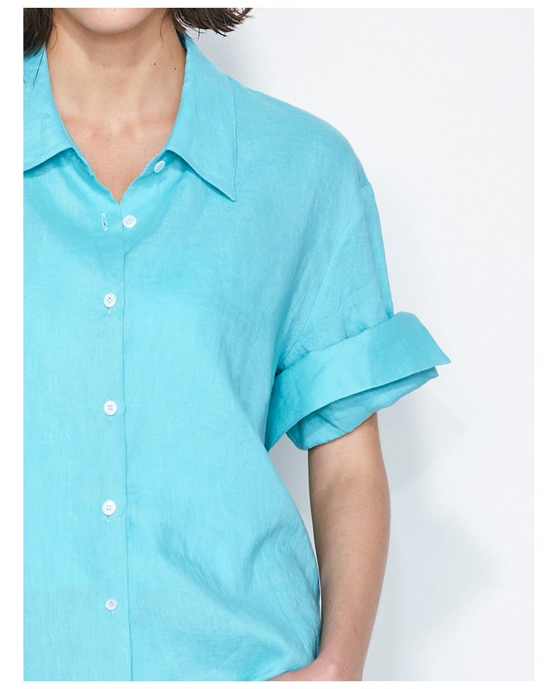 NUTH亚麻翻领宽松短袖衬衫女 湖蓝色/黄色/橙色
