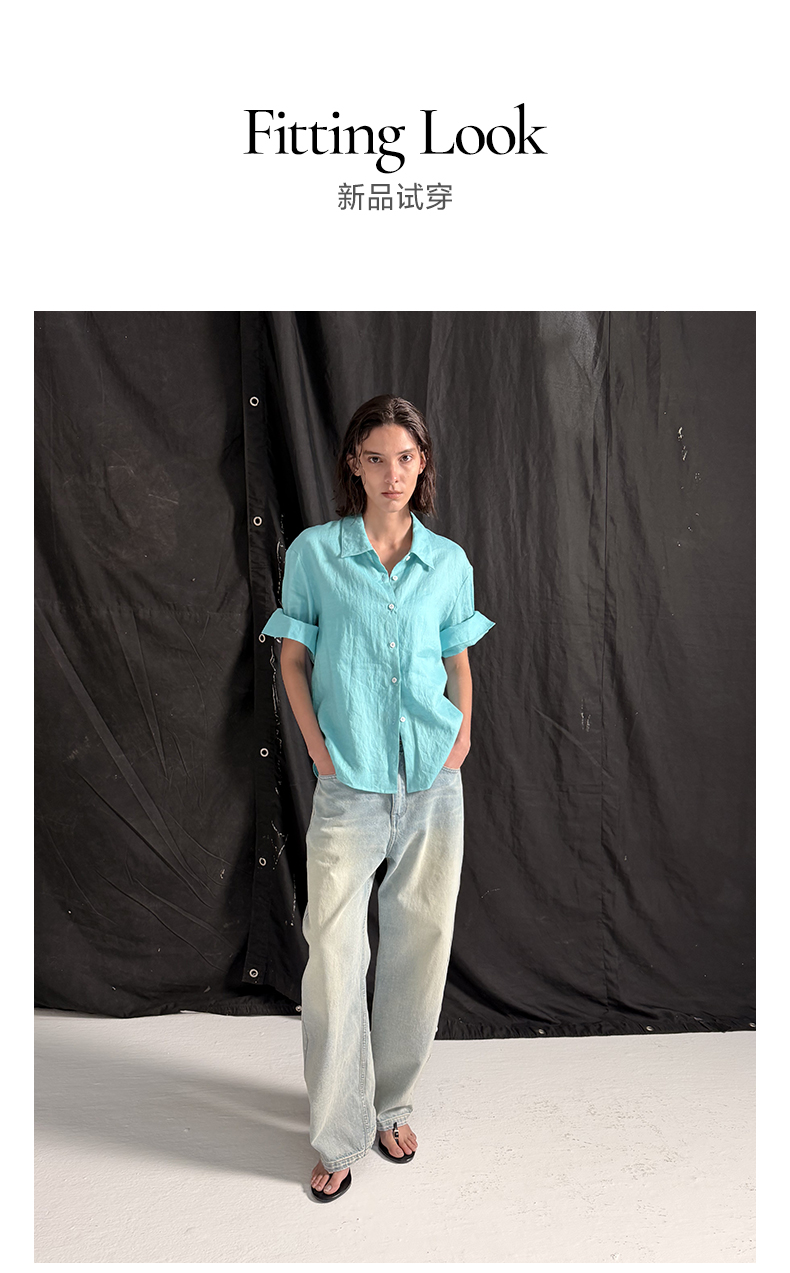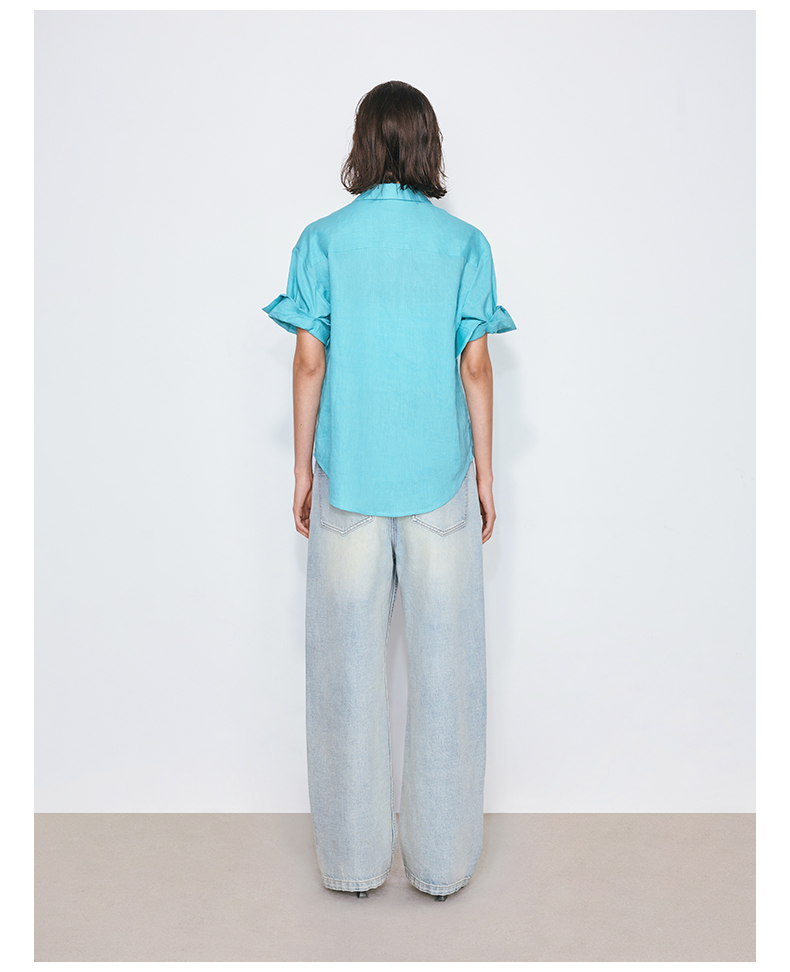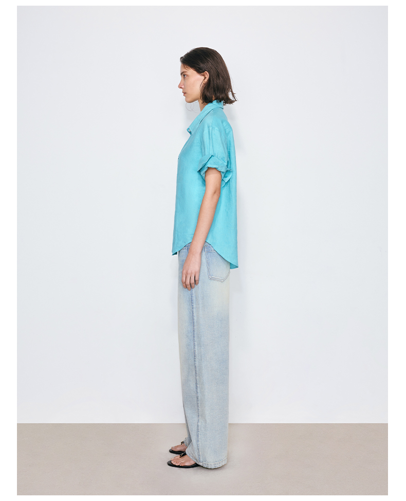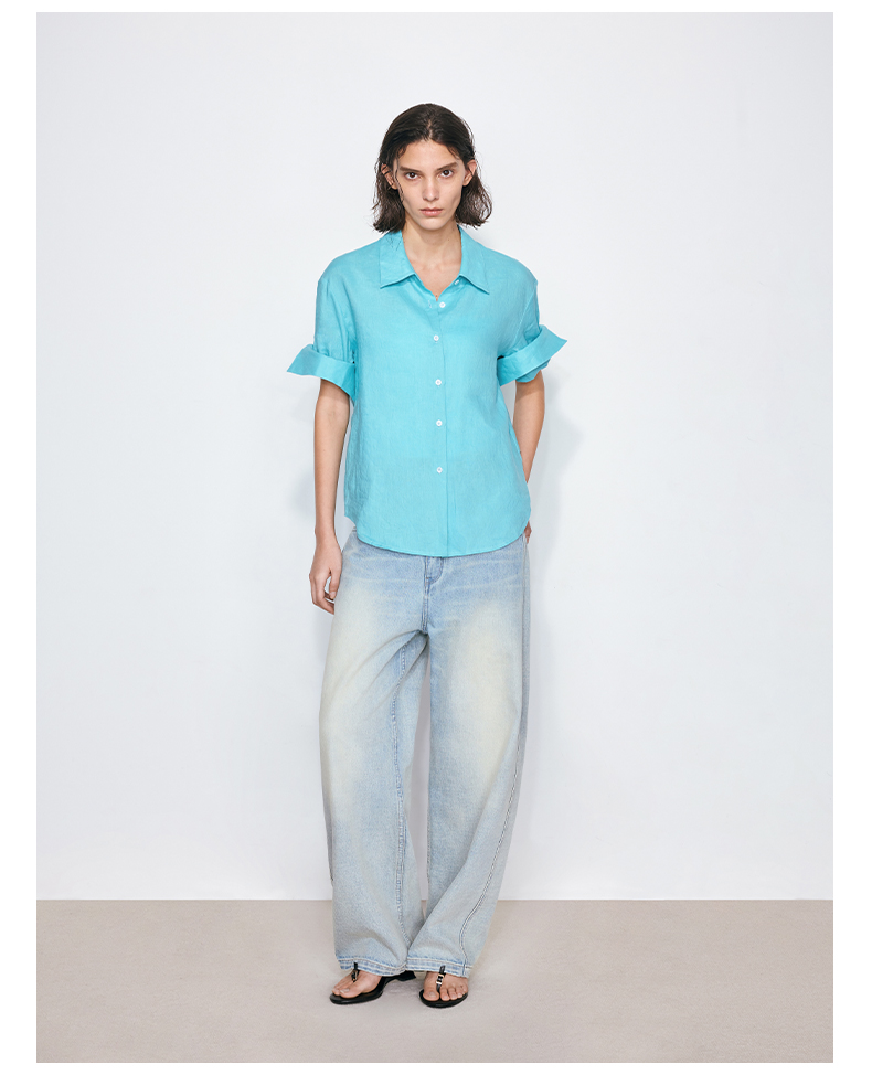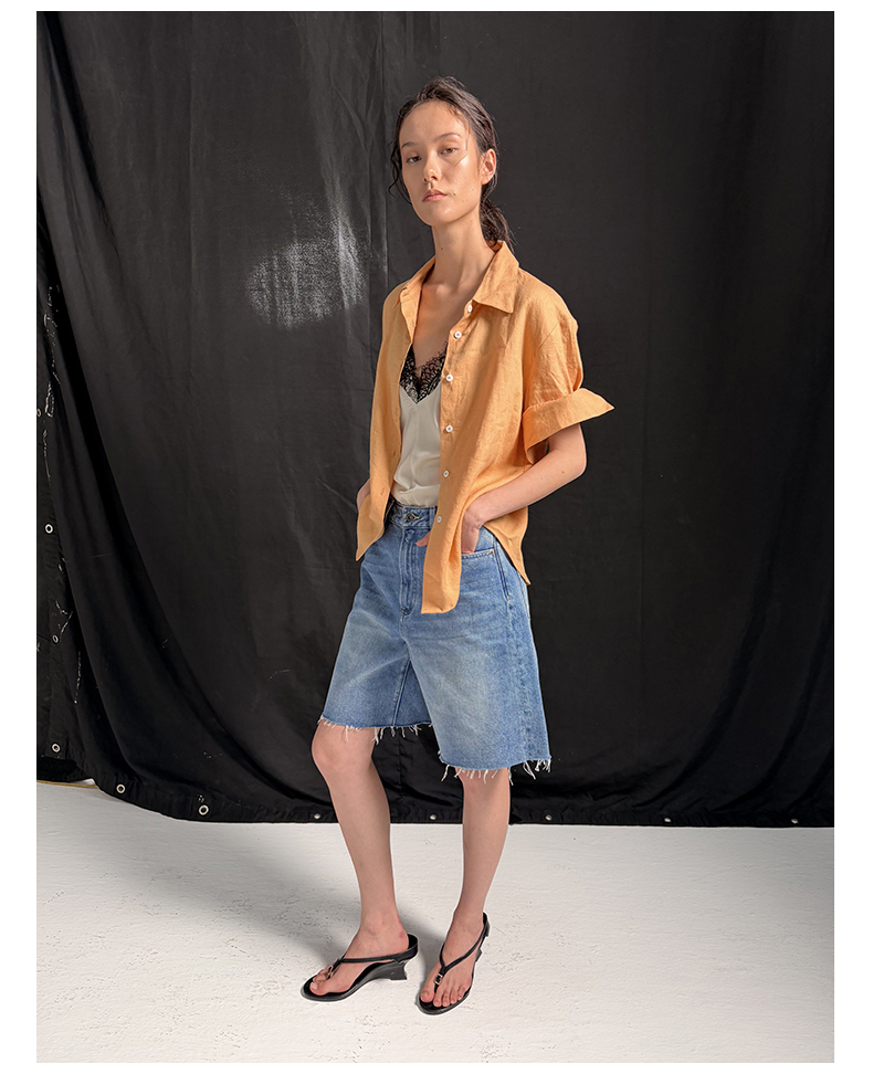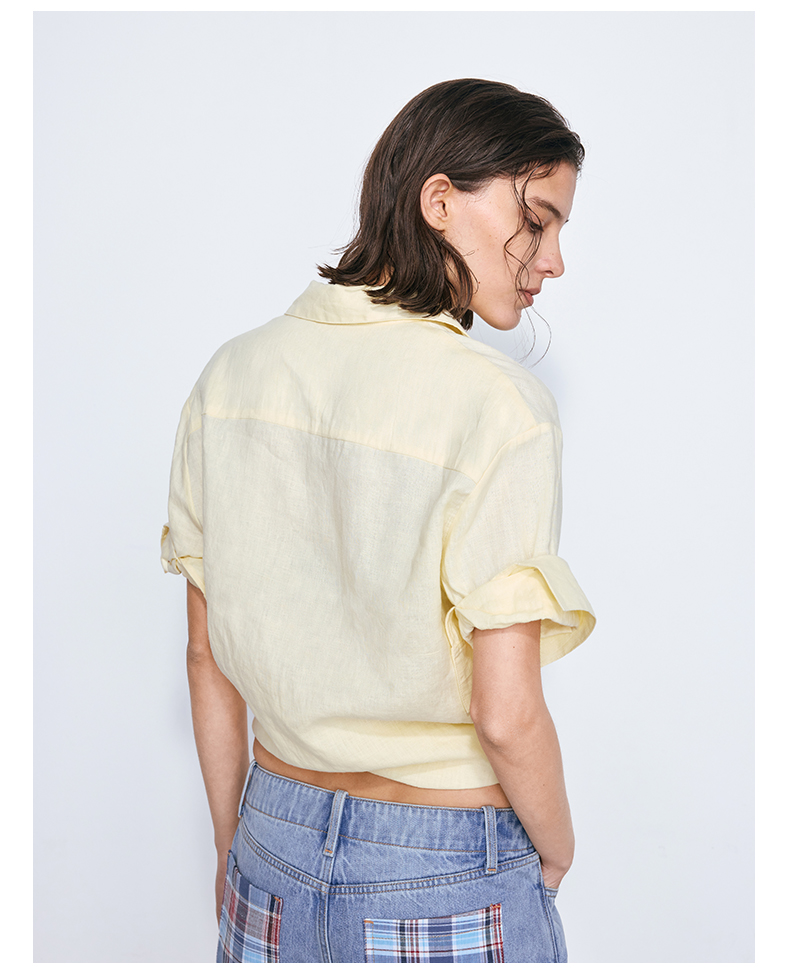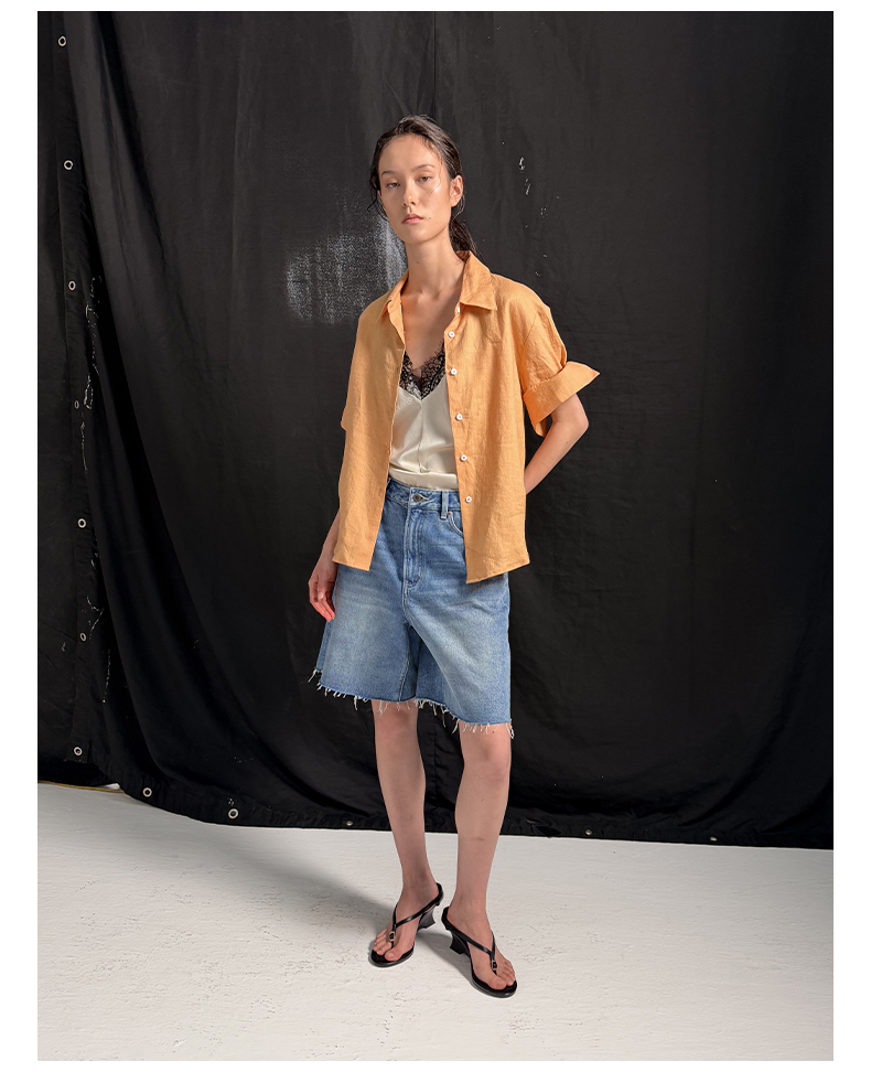 NUTH亚麻翻领宽松短袖衬衫女 湖蓝色/黄色/橙色