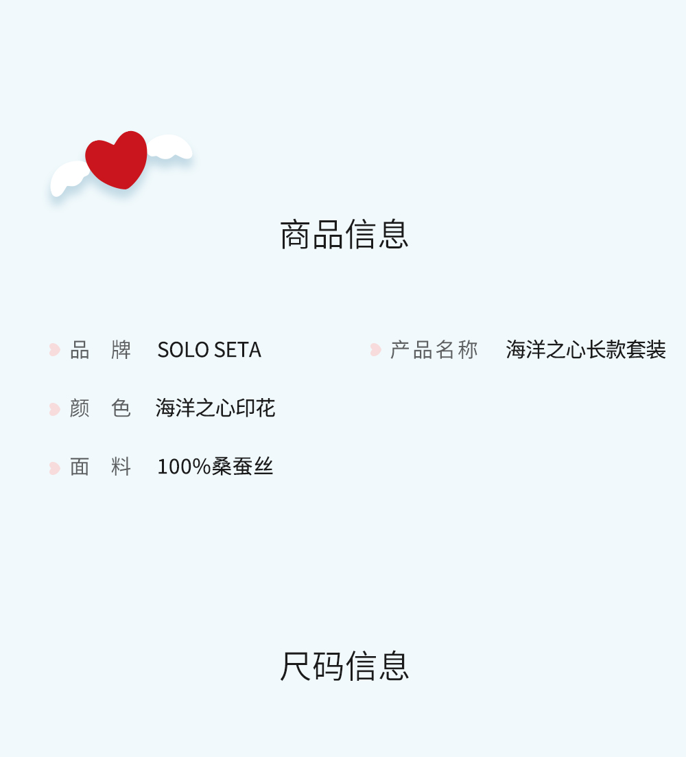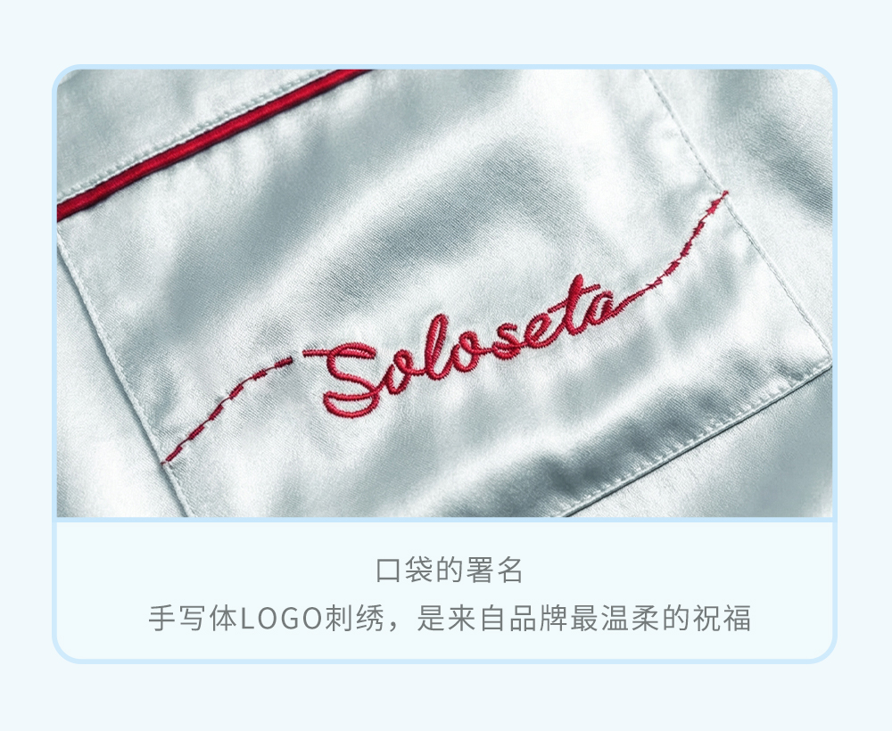- soloseta专注于真丝织物,灵感源自意大利语,中文含义为“只做真丝”的意思。让睡衣变时尚,居家和外出瞬间切换,使其更具有出街,度假,参加宴会等功能。