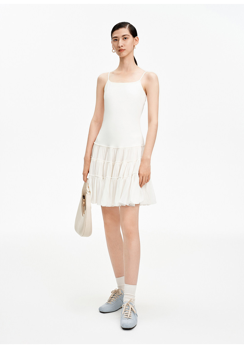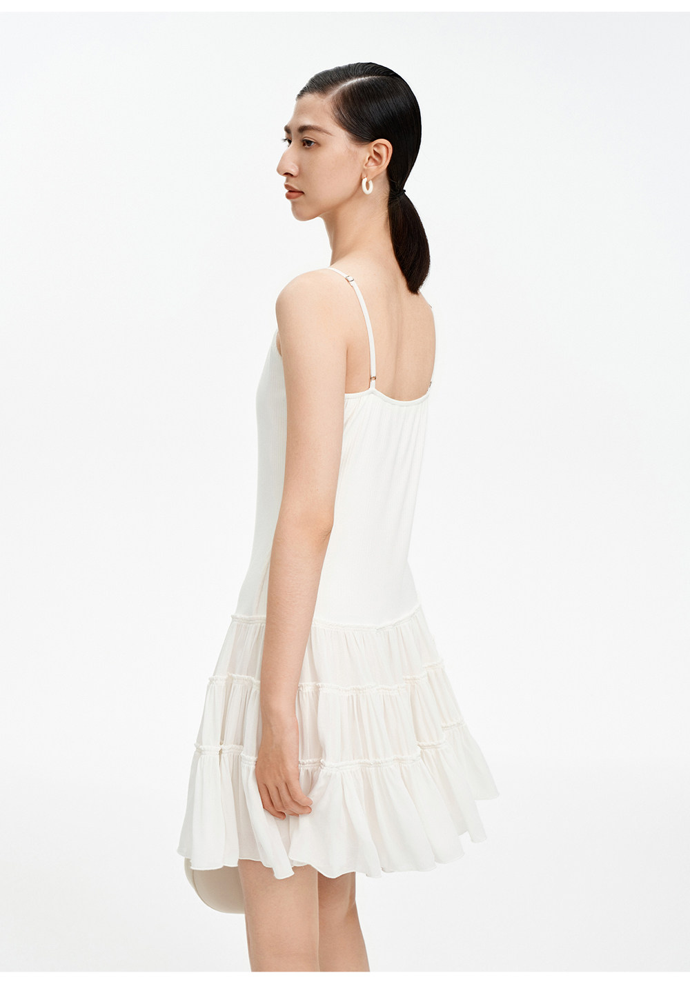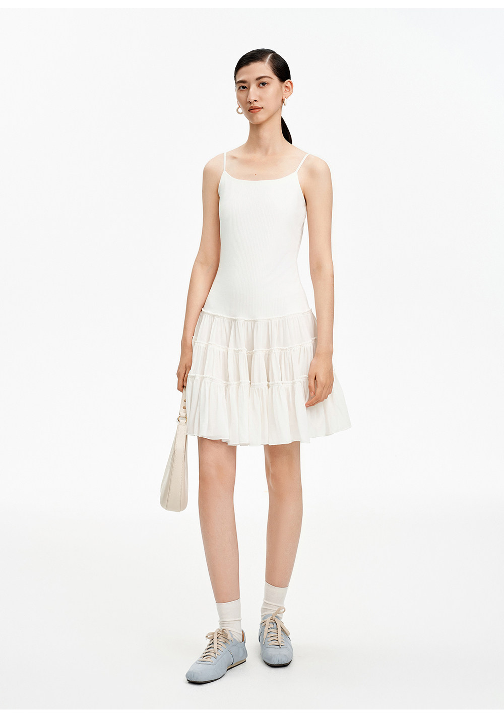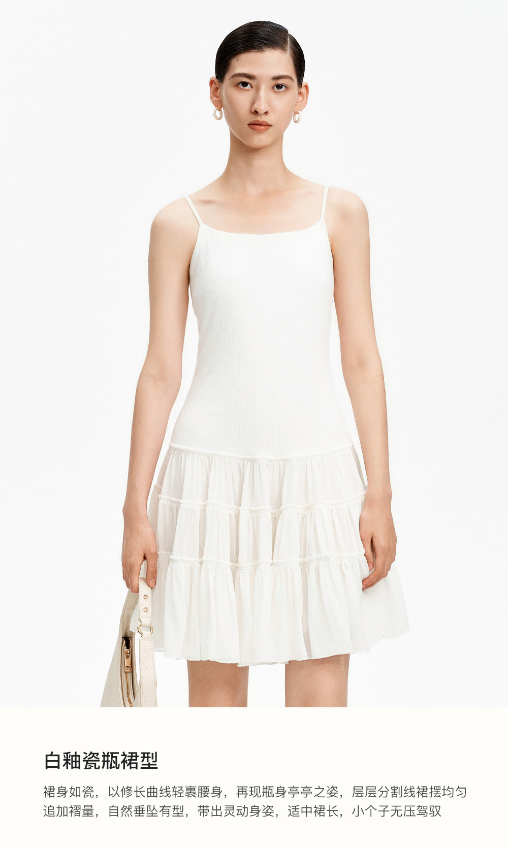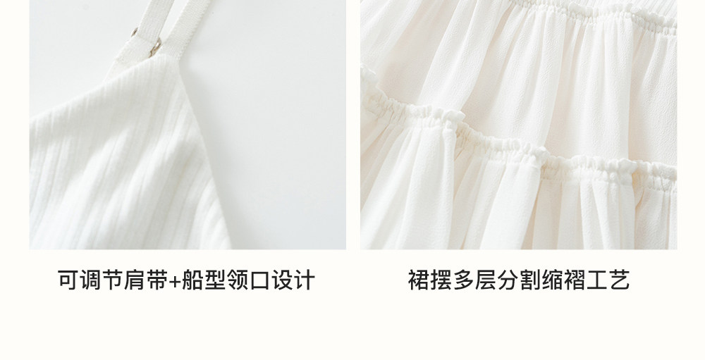 SELFWHO白色梭织拼接船领连衣裙女2026春新款可调节肩带A字无袖裙