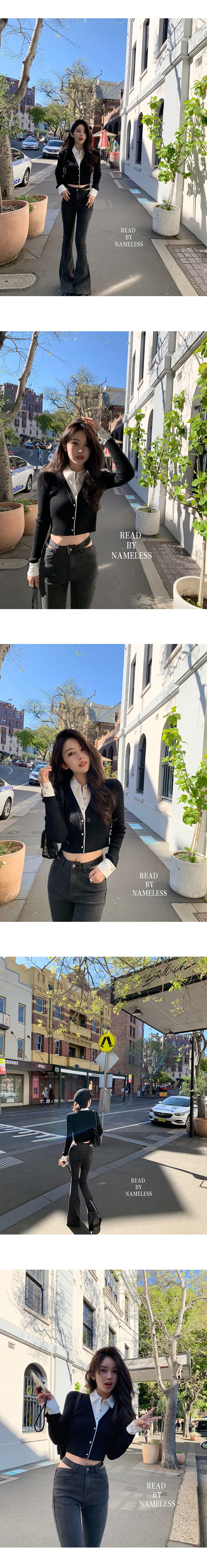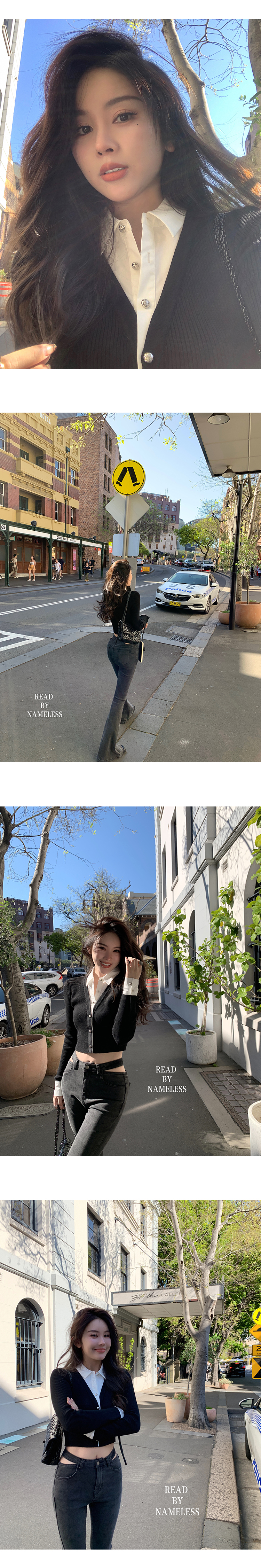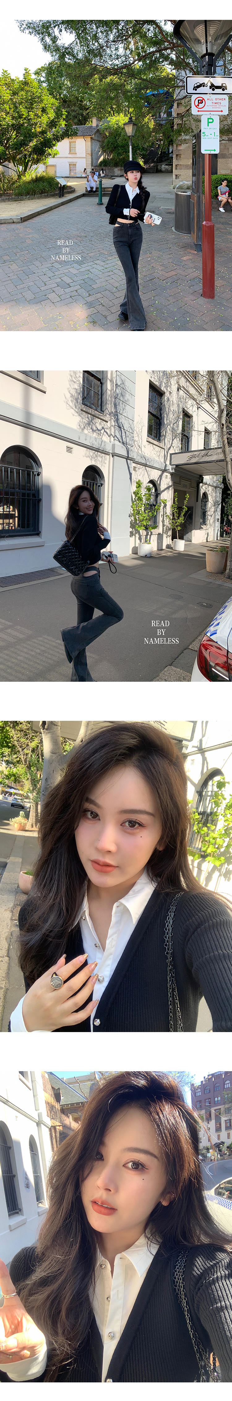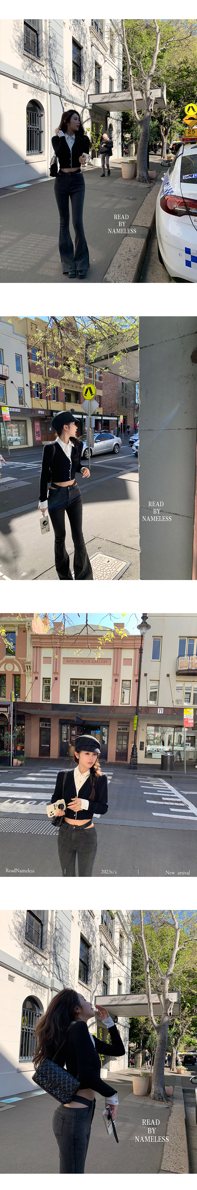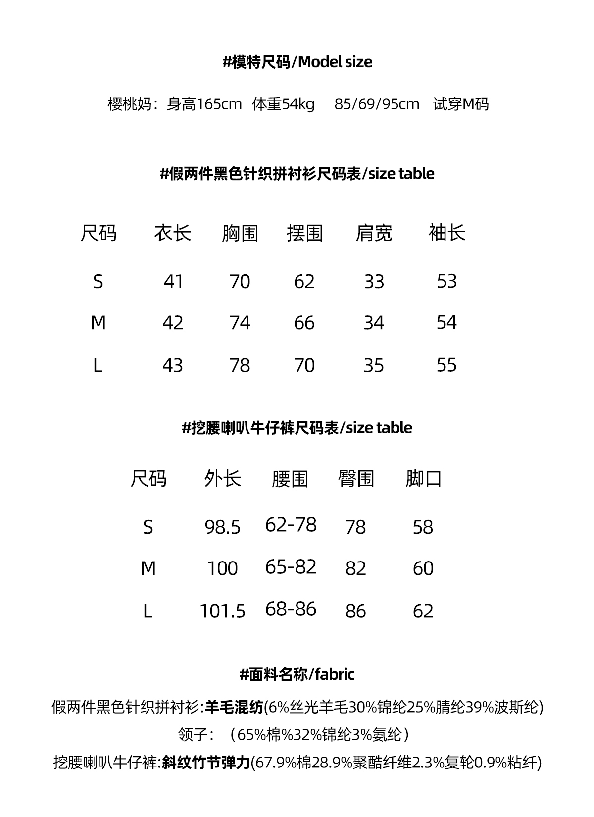 Read Nameless /假两件黑色针织拼衬衫+挖腰喇叭牛仔裤