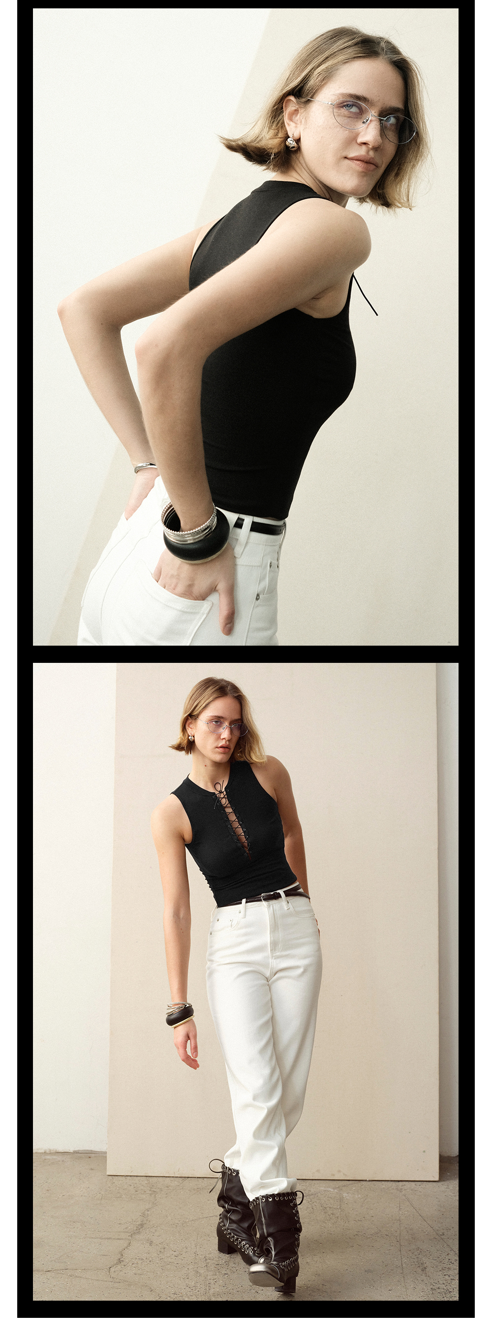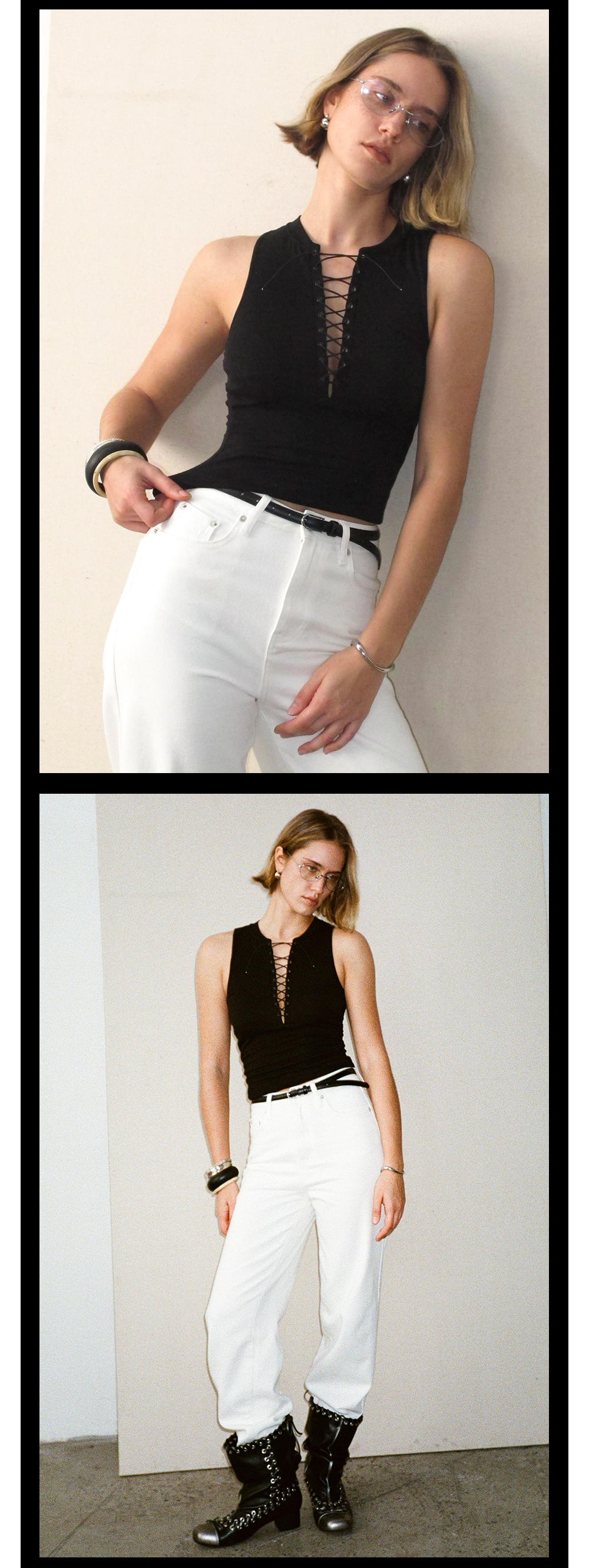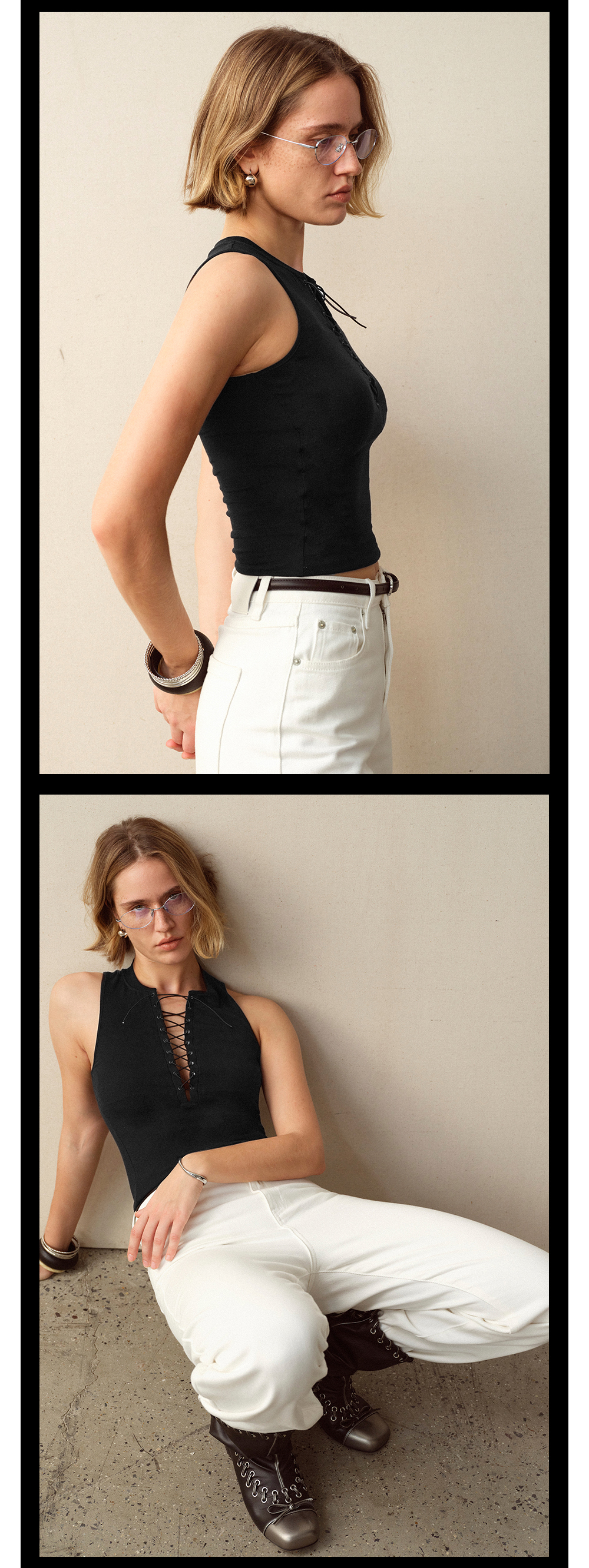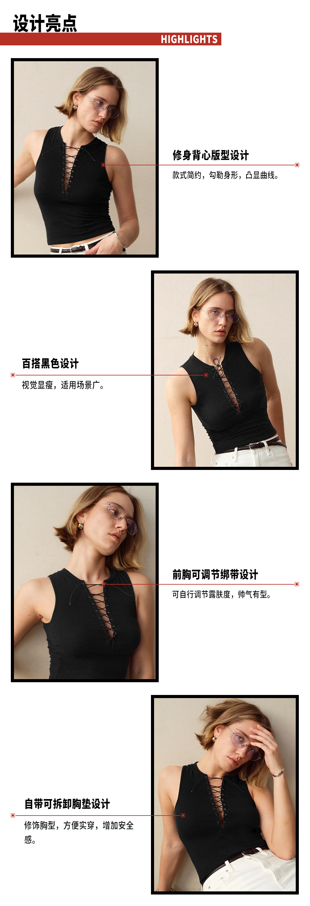 TR她热 御姐当道 黑色弹力修身系带辣妹带胸垫显瘦背心吊带