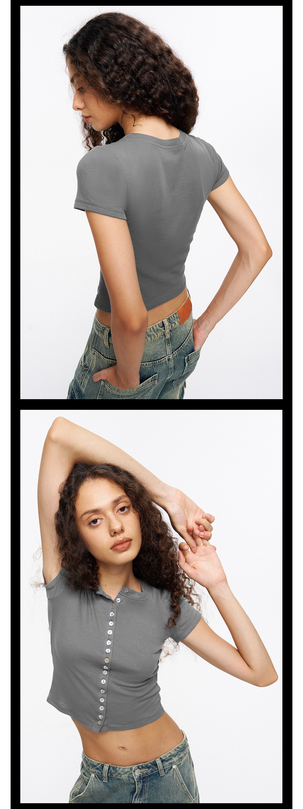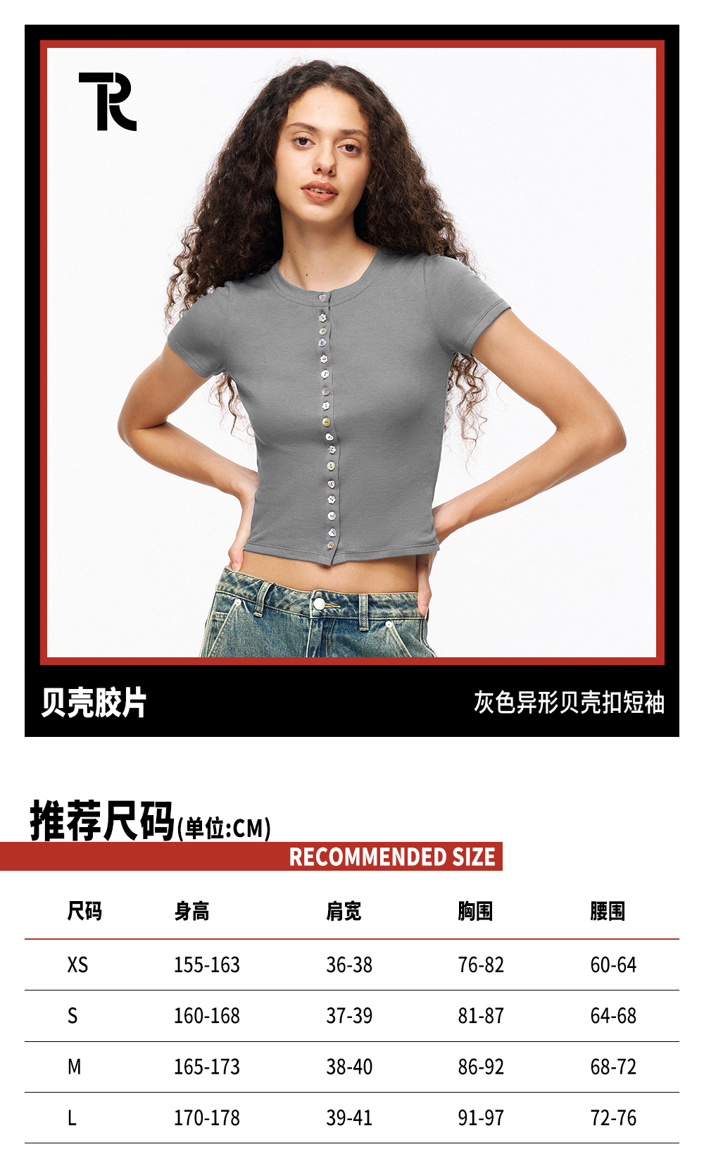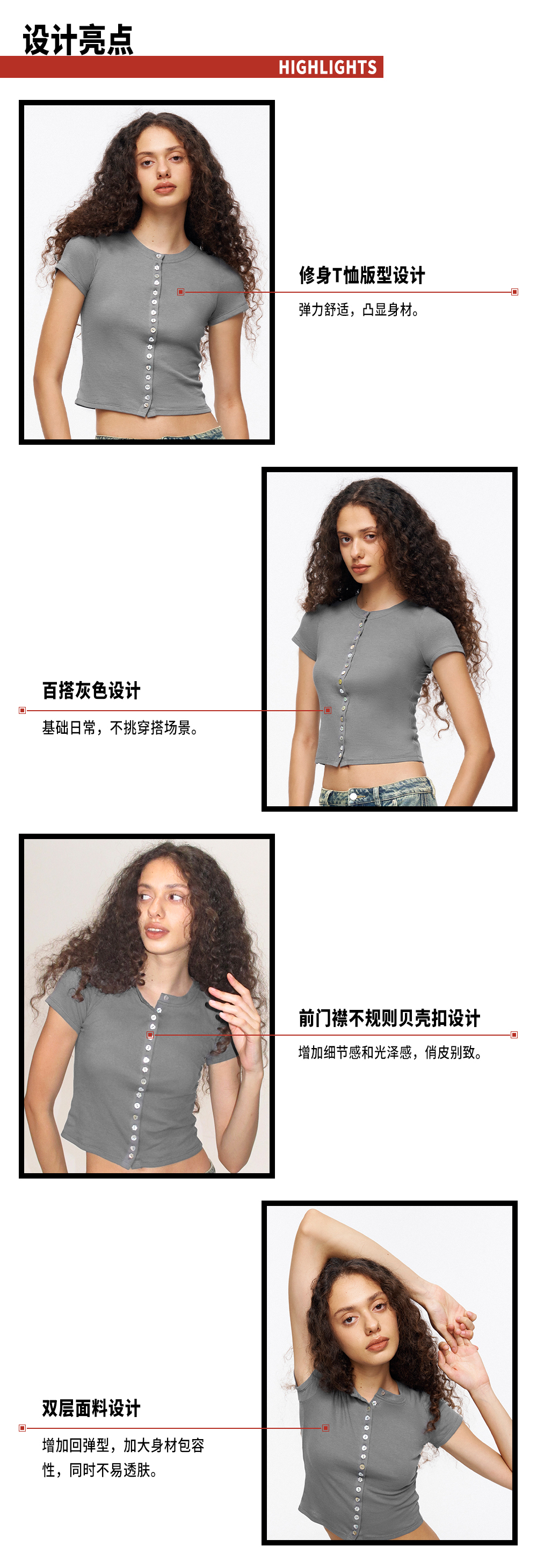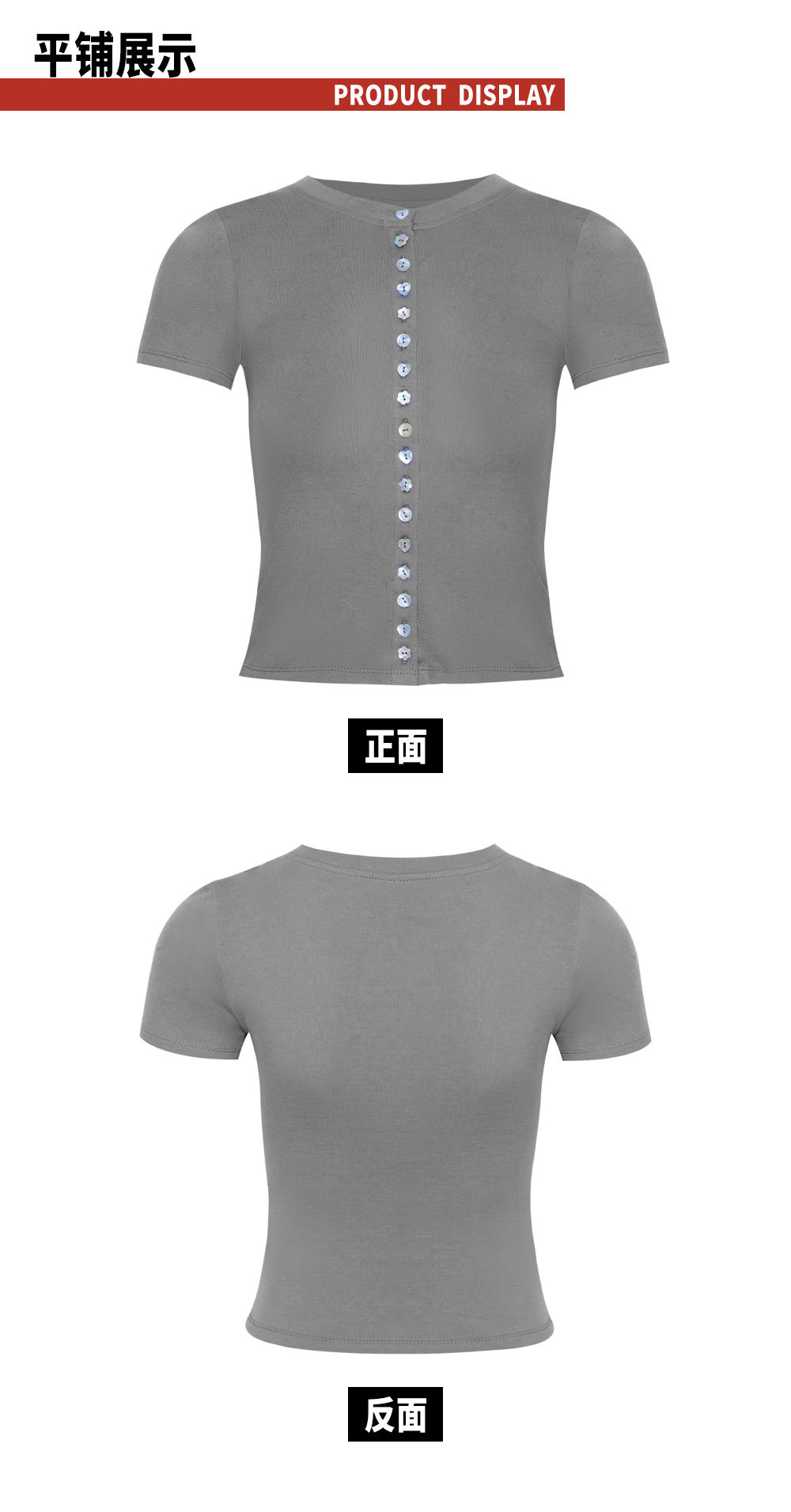 TR她热 贝壳胶片 灰色棉感弹力修身短款贝壳扣百搭基础T恤