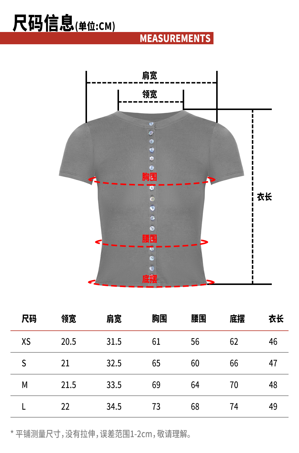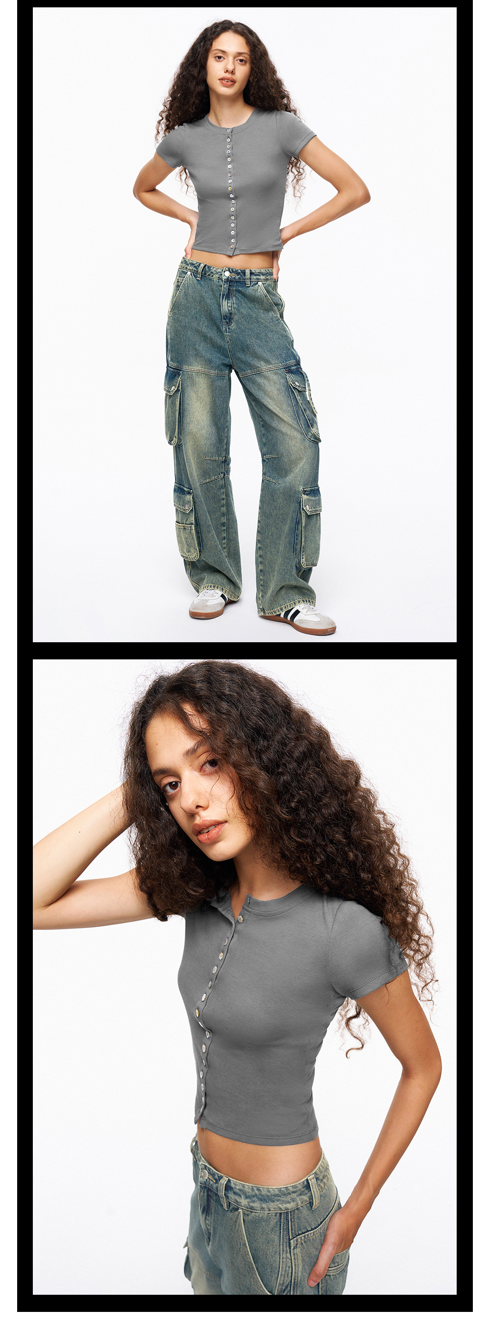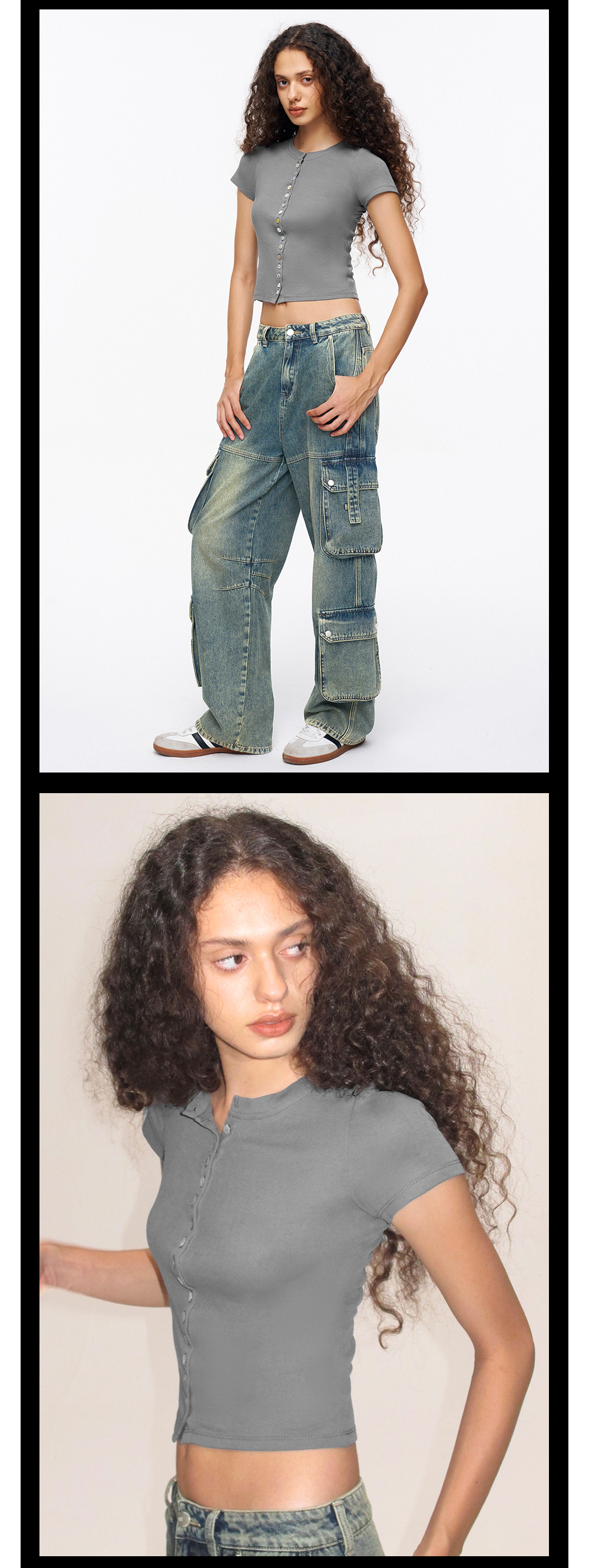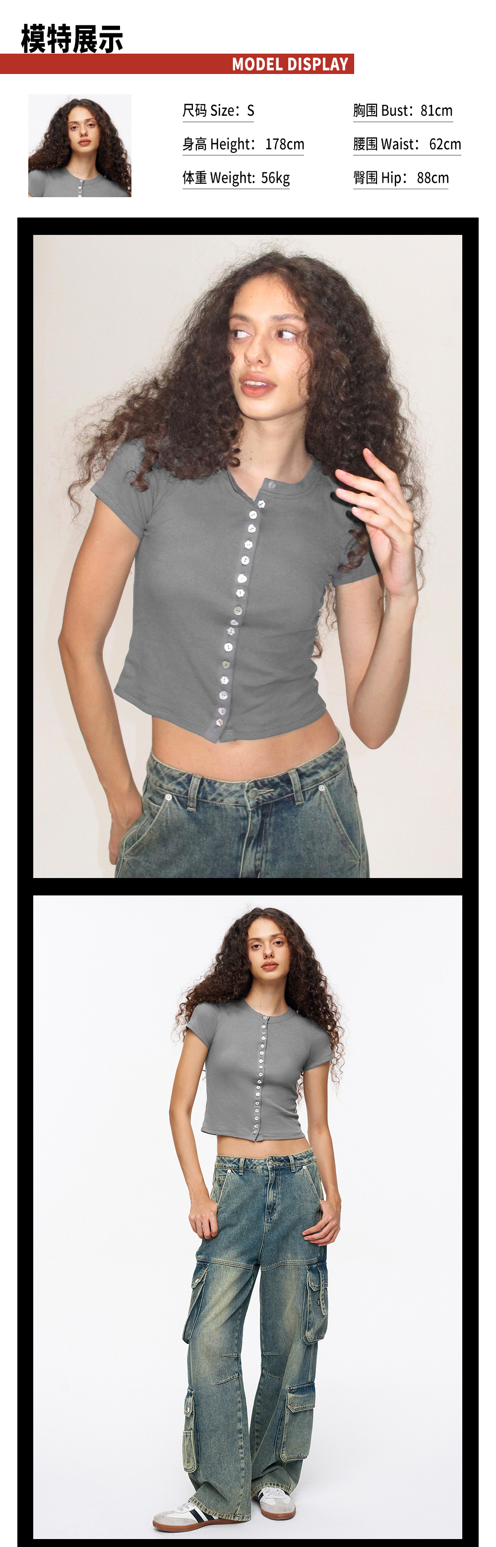 TR她热 贝壳胶片 灰色棉感弹力修身短款贝壳扣百搭基础T恤