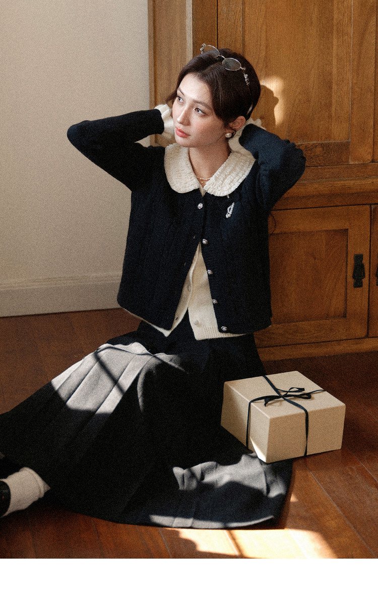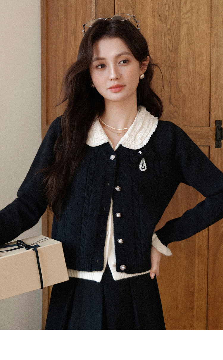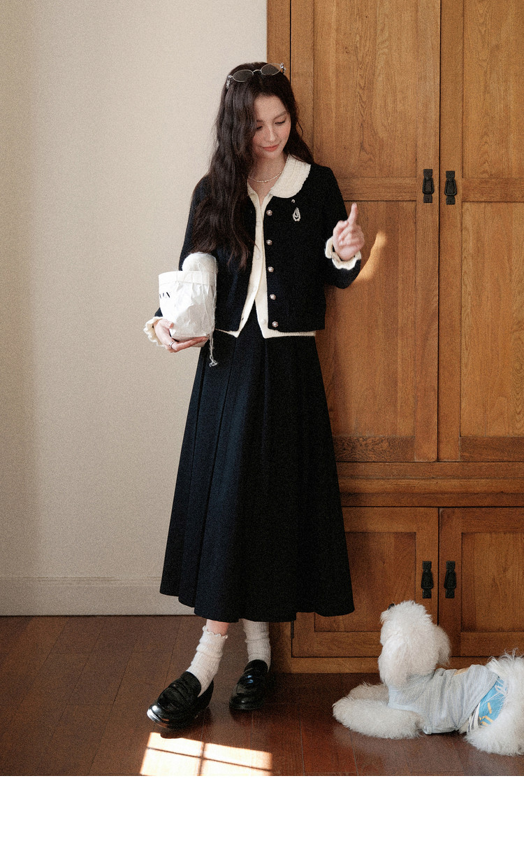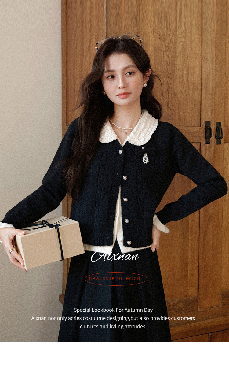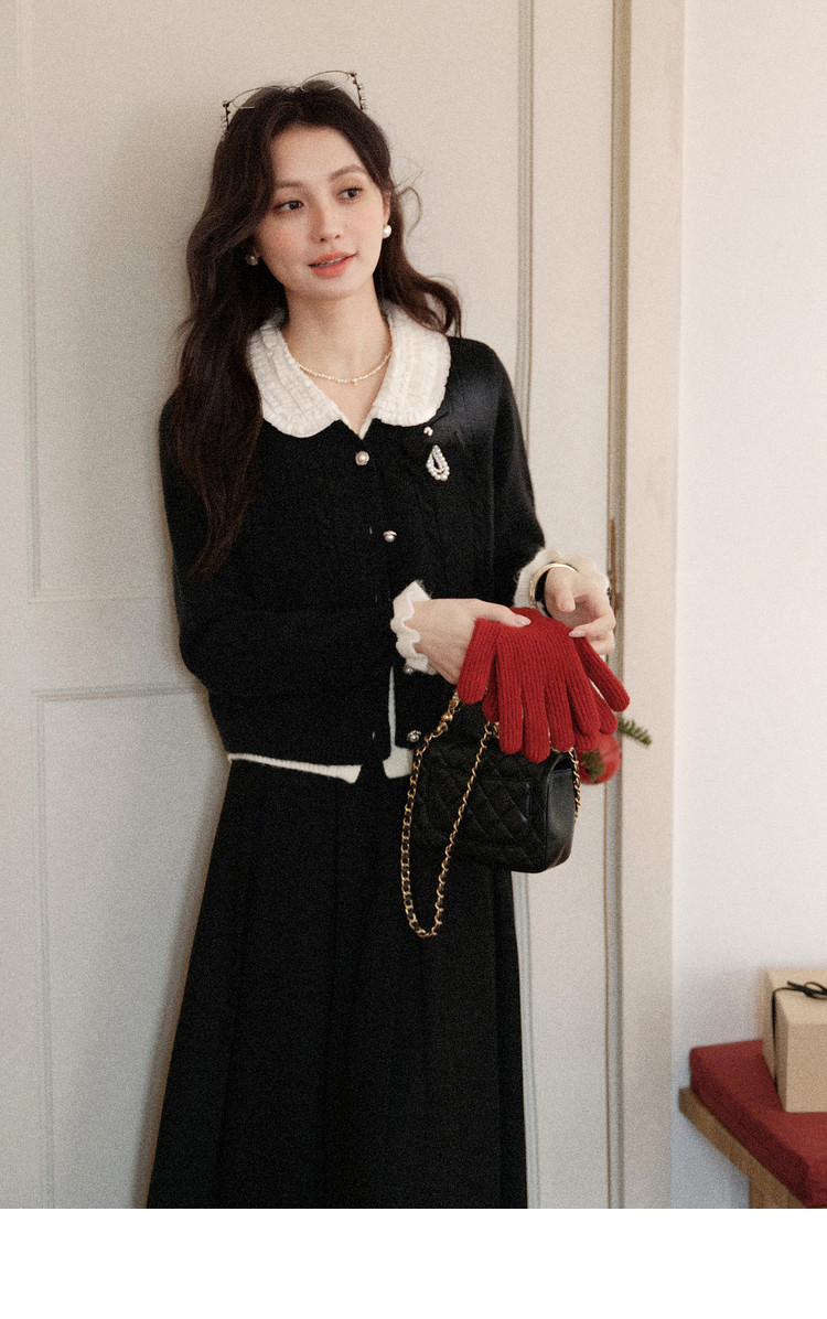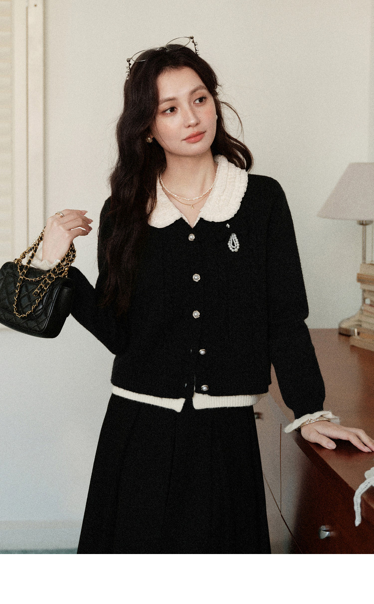 鹿向南「陷进温柔」假两件黑色针织毛衣女秋冬设计感收腰短款上衣