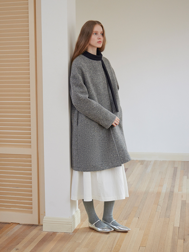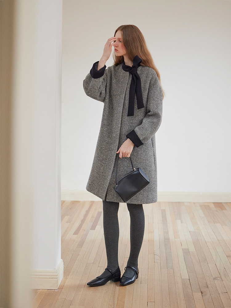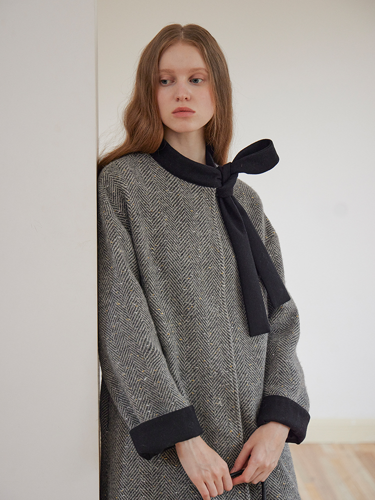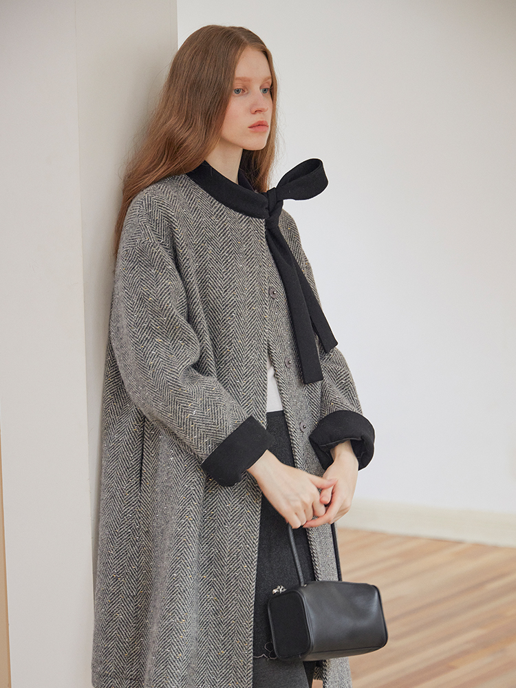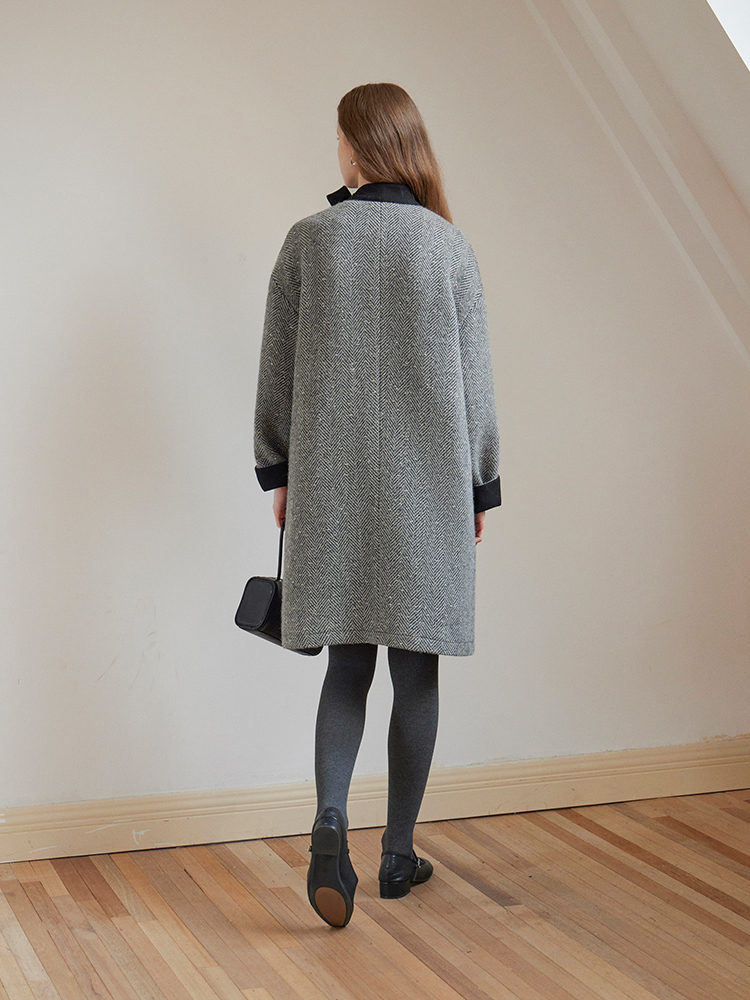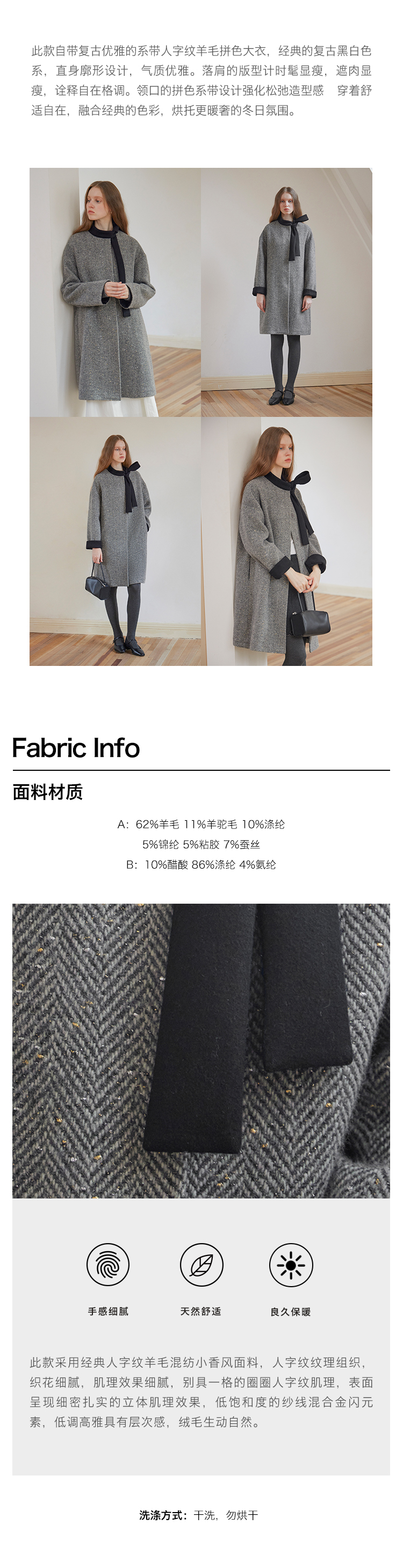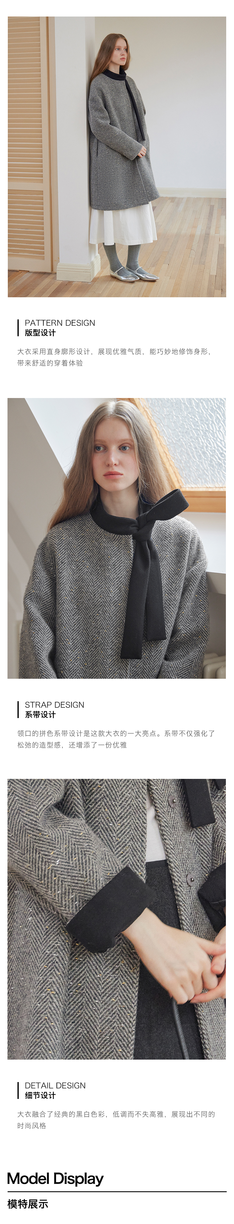 ForPoem 现货 24/FW原创设计中长款宽松廓形人字纹羊毛拼色系带大衣