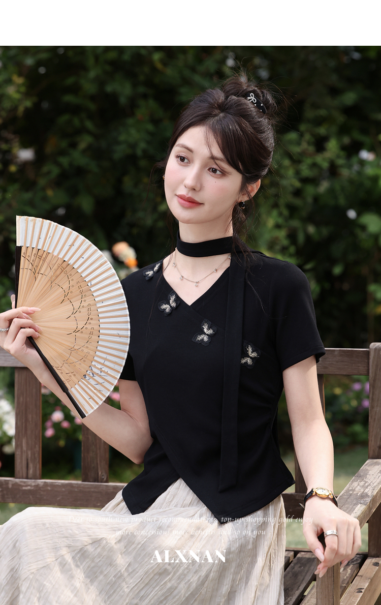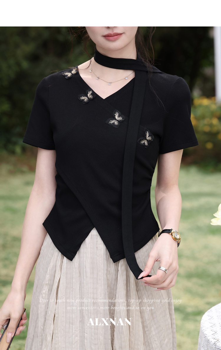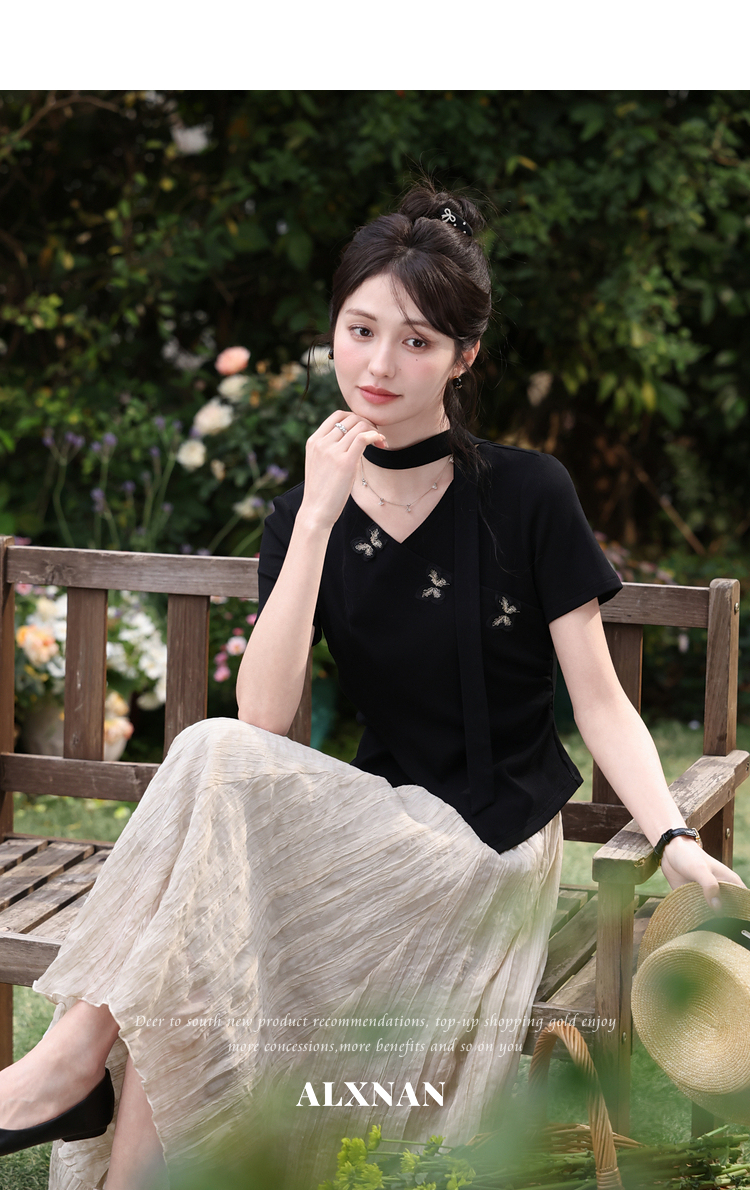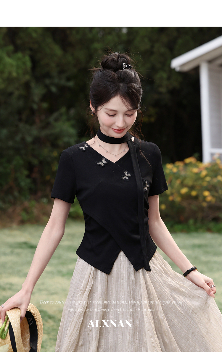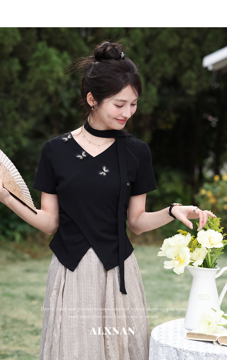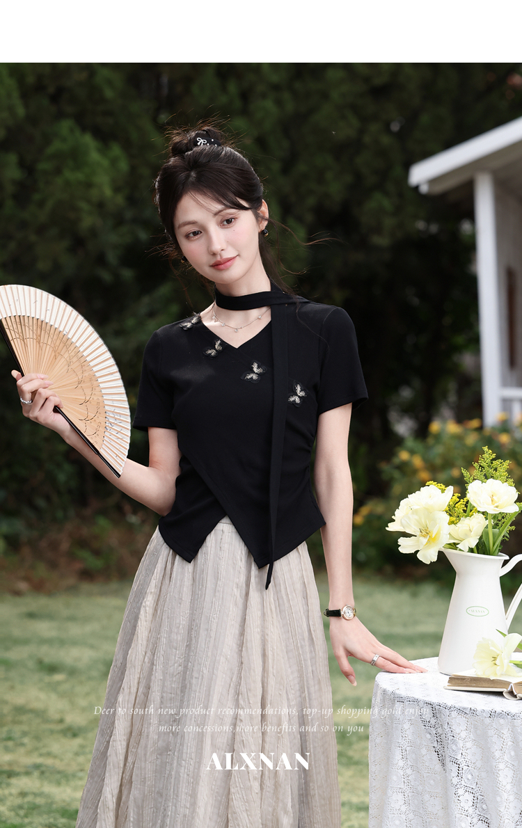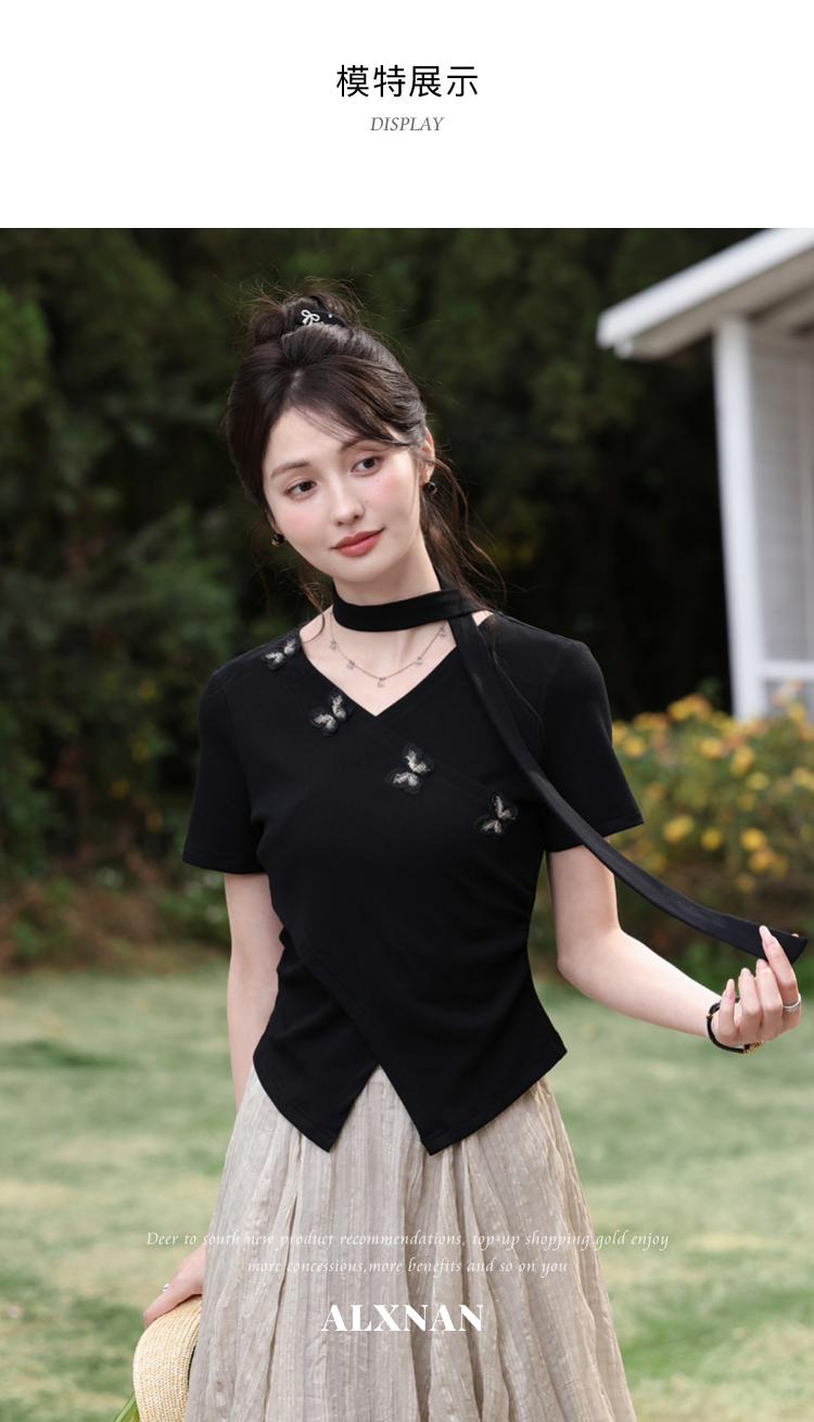 鹿向南「墨法花序」高级感黑色气质V领短袖T恤女夏季新款显瘦上衣