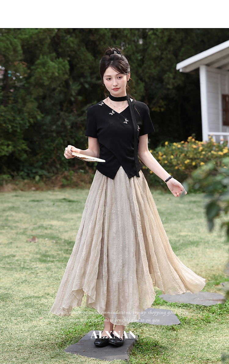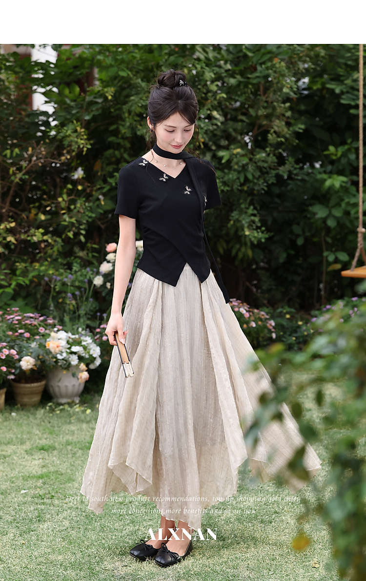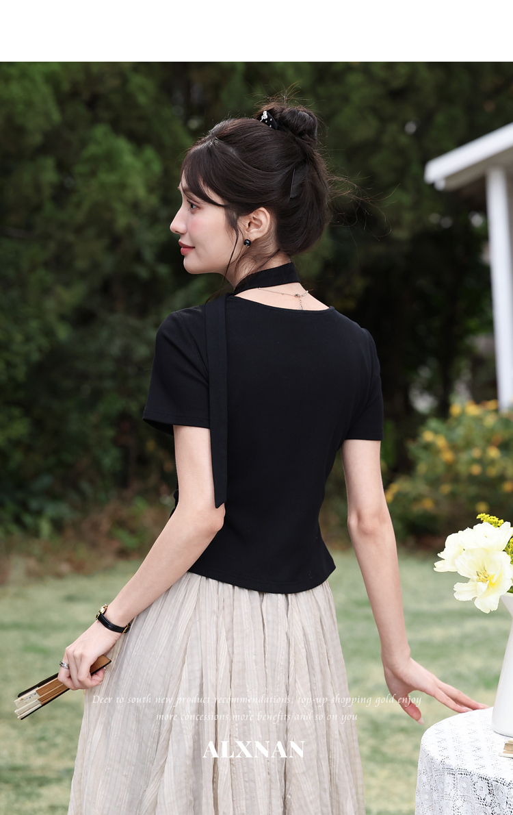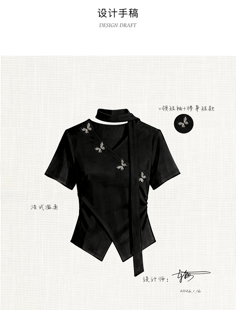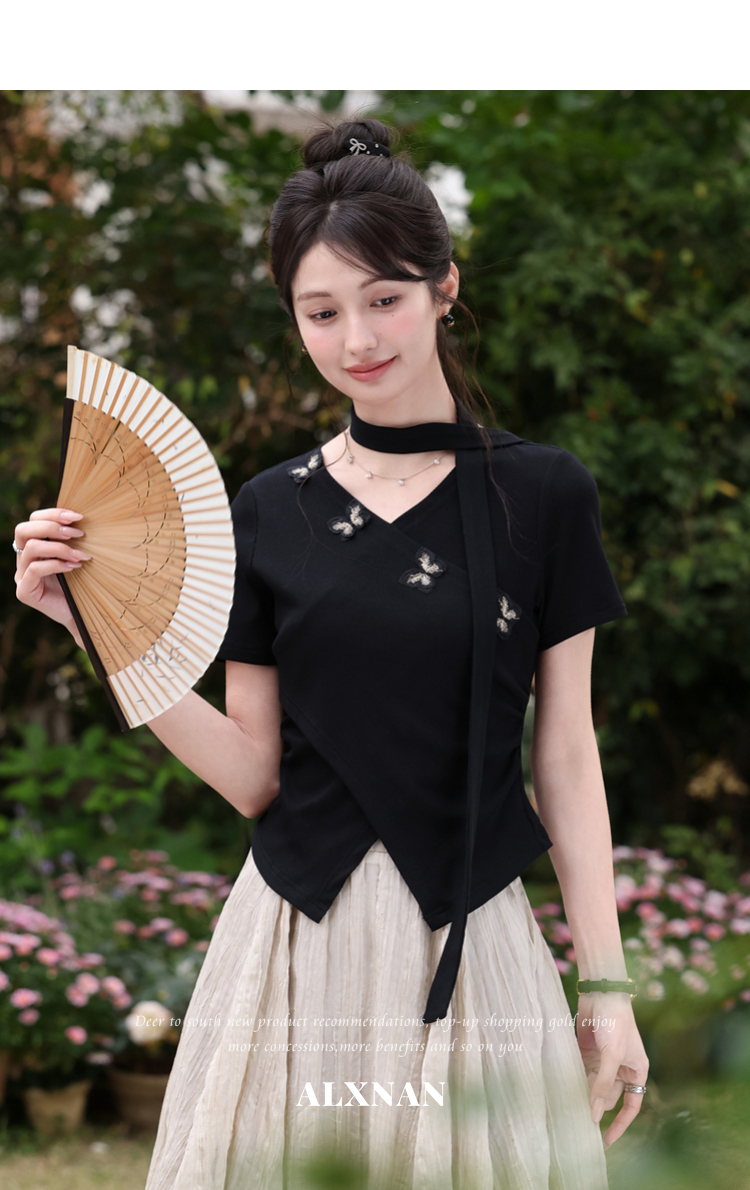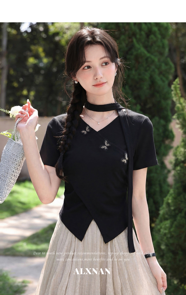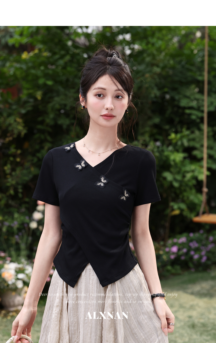 鹿向南「墨法花序」高级感黑色气质V领短袖T恤女夏季新款显瘦上衣