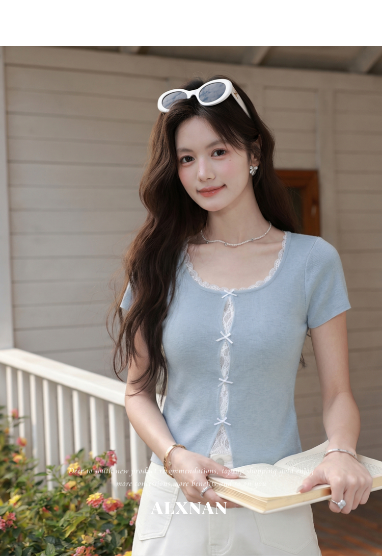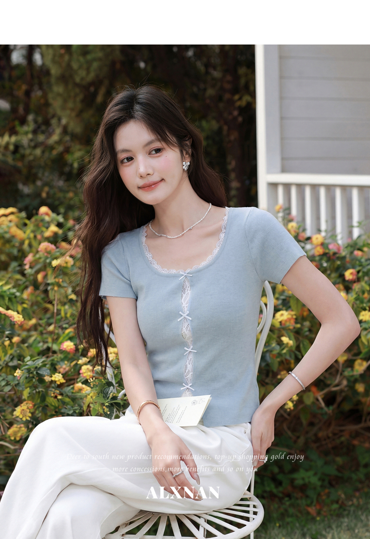 鹿向南【0405/20:00新品前1小时7折限量100件】蓝色针织衫T恤短袖