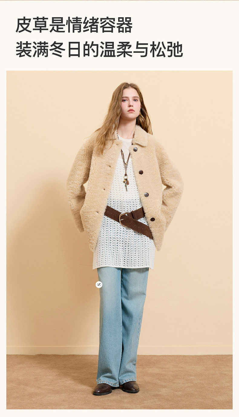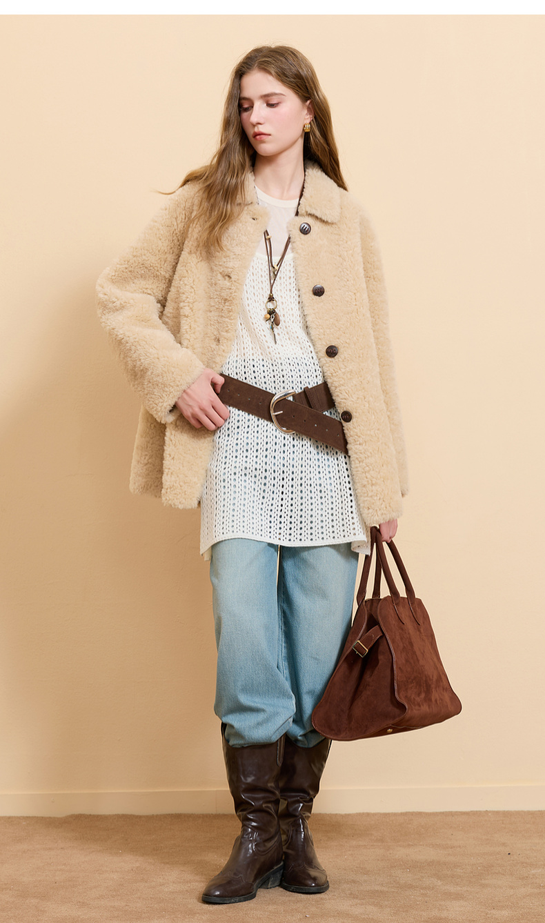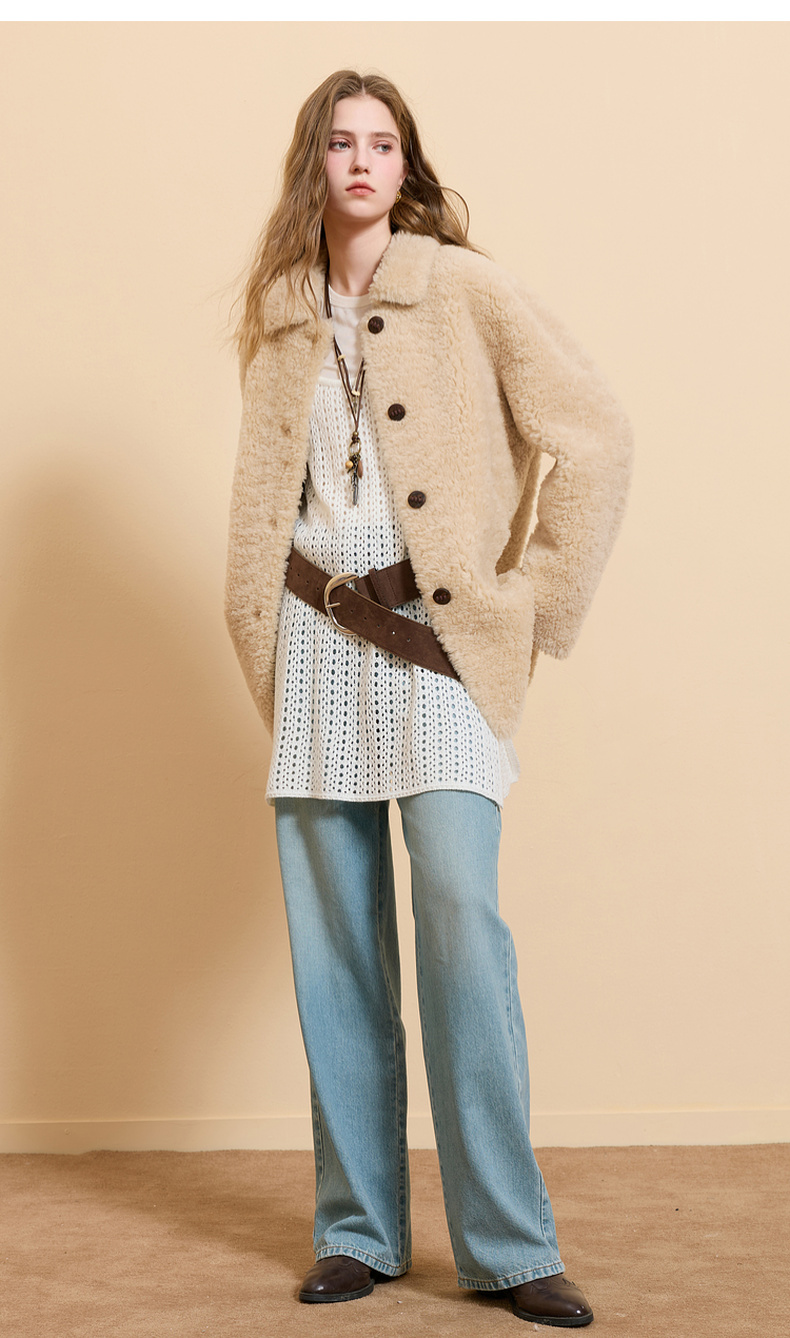 【100绵羊毛瘦瘦皮草】三彩2025冬季新款翻领毛毛外套中长简约M