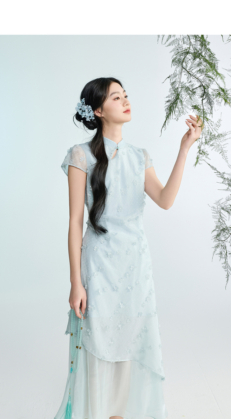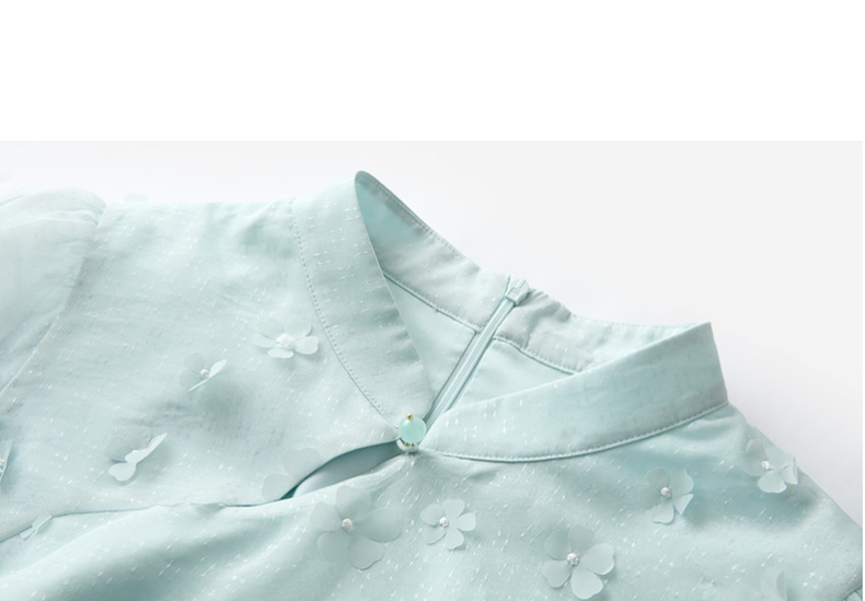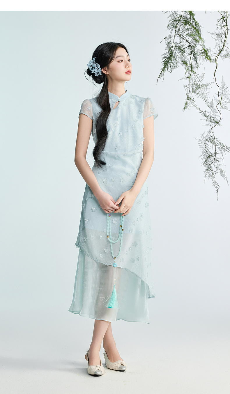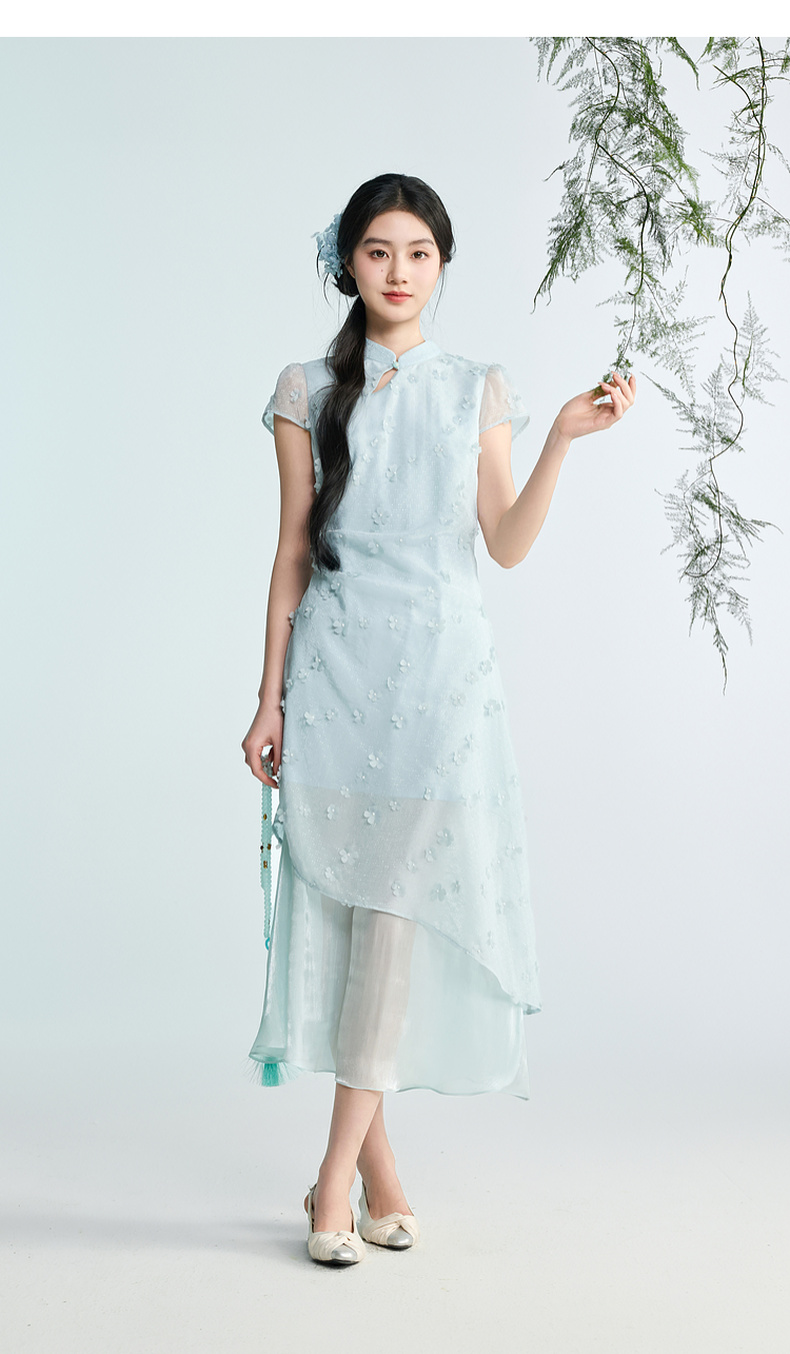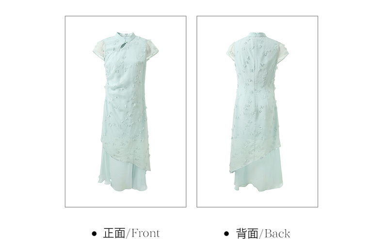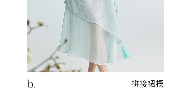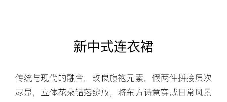 三彩2026春季新款新中式连衣裙假两件拼接立体花朵长裙M