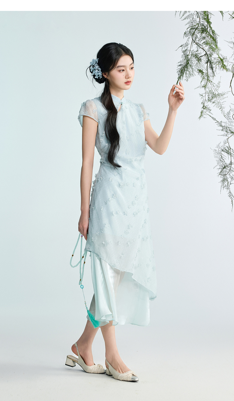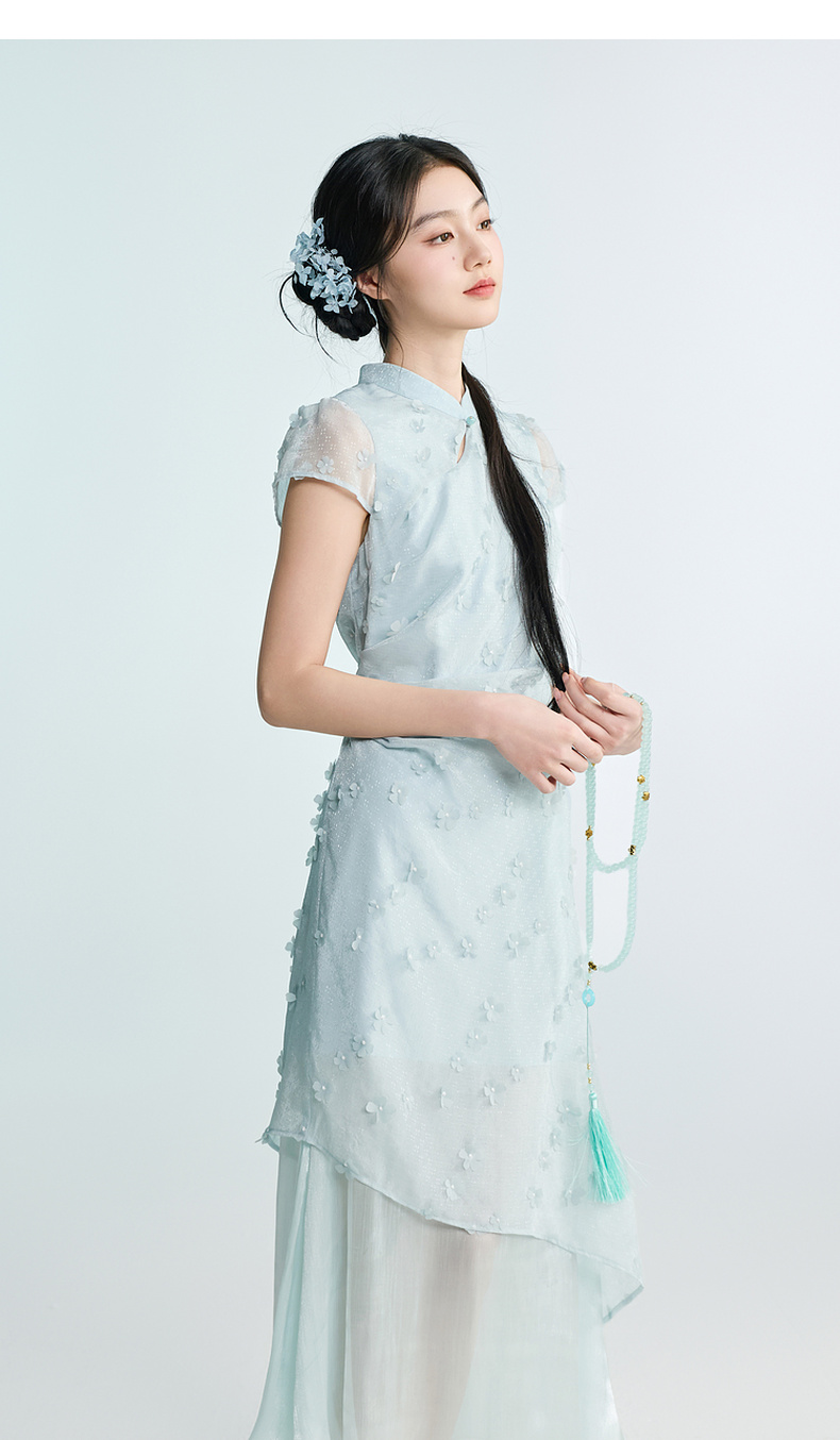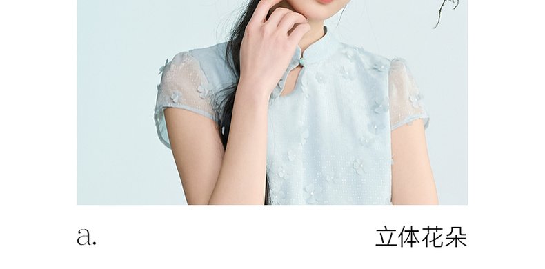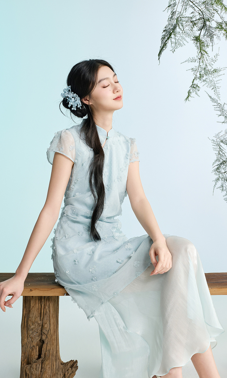 三彩2026春季新款新中式连衣裙假两件拼接立体花朵长裙M