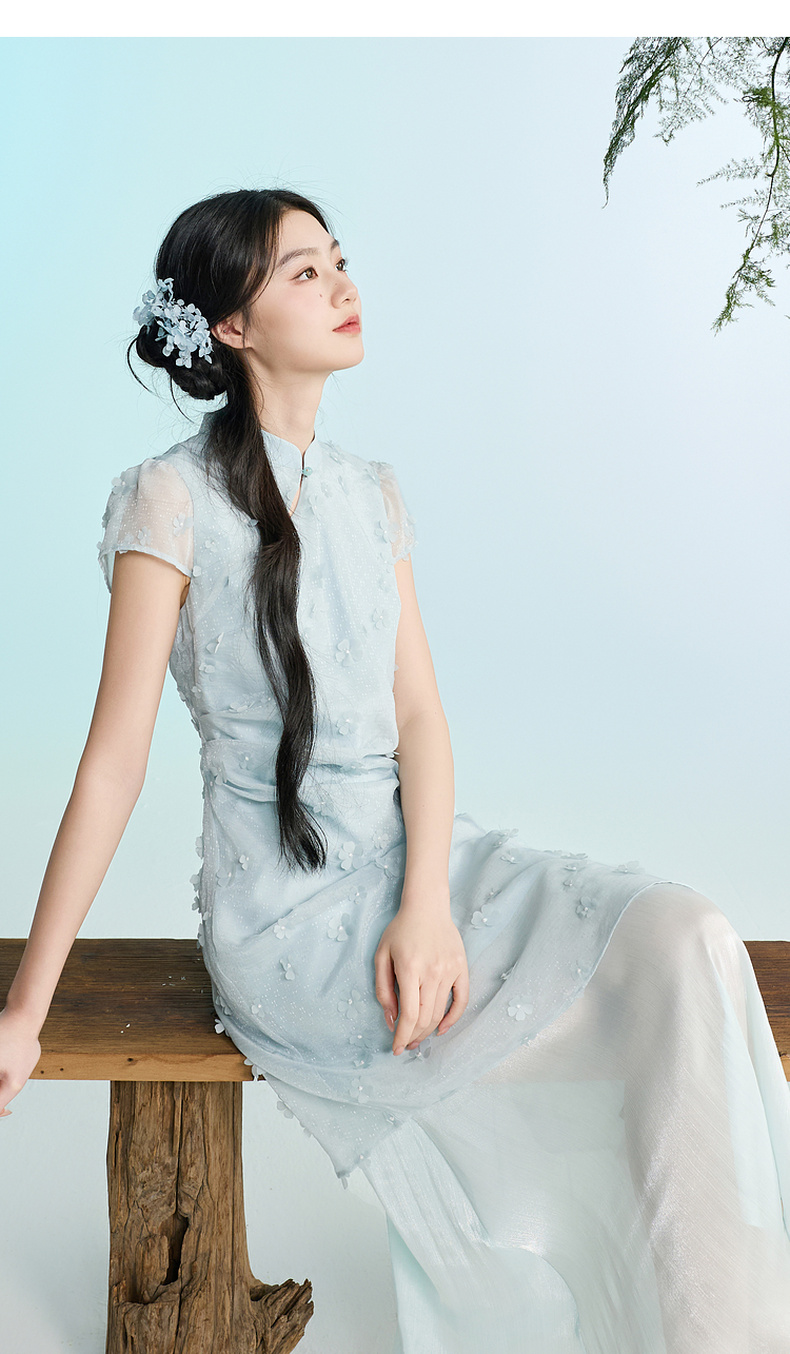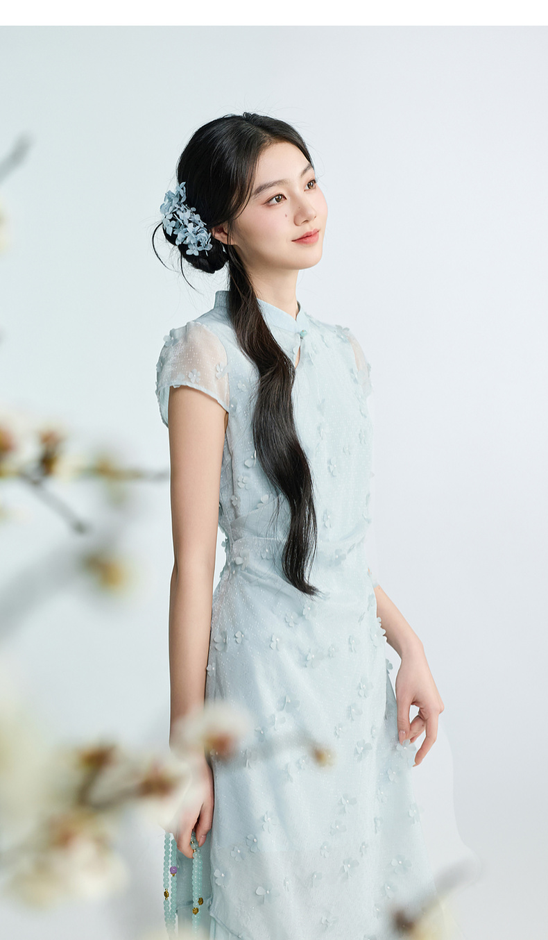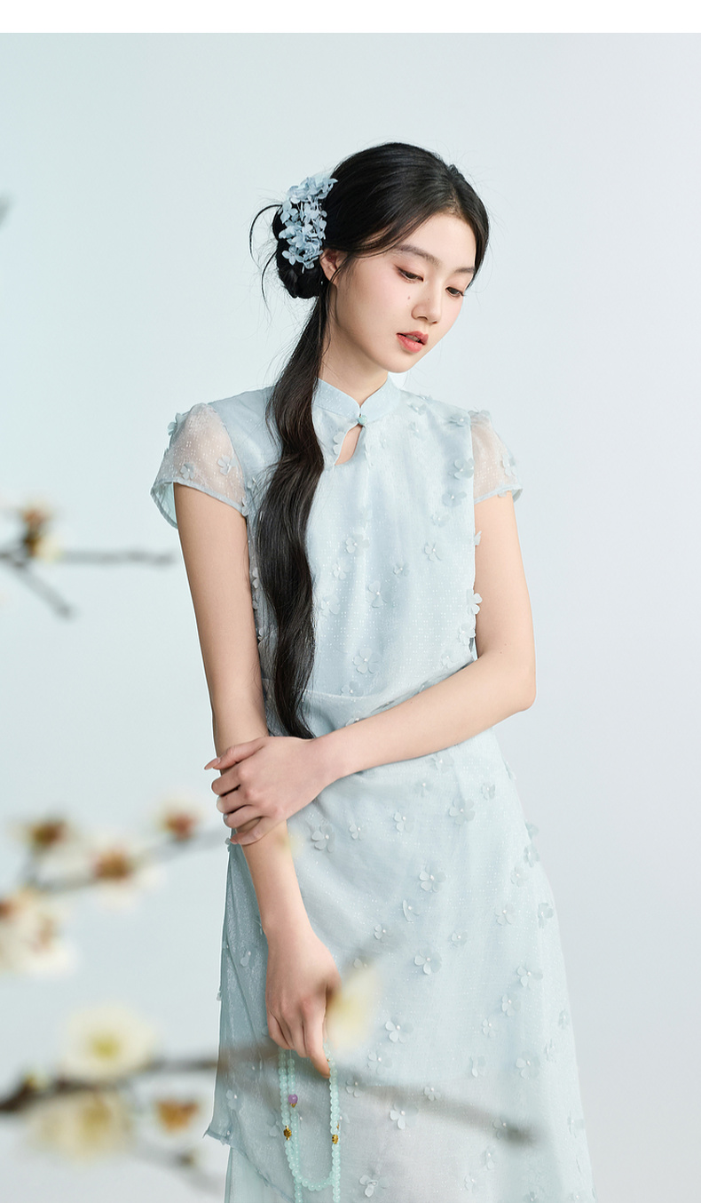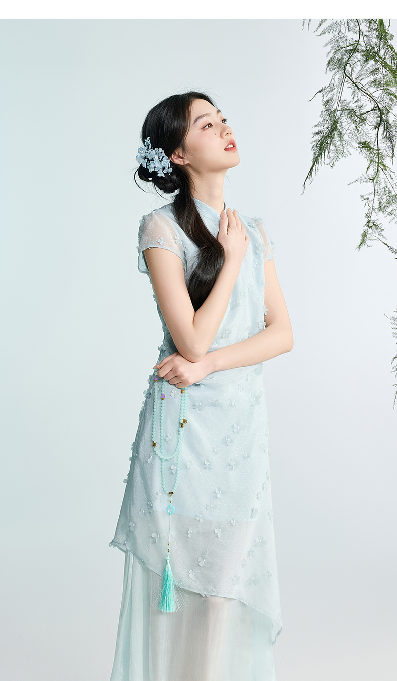 三彩2026春季新款新中式连衣裙假两件拼接立体花朵长裙M