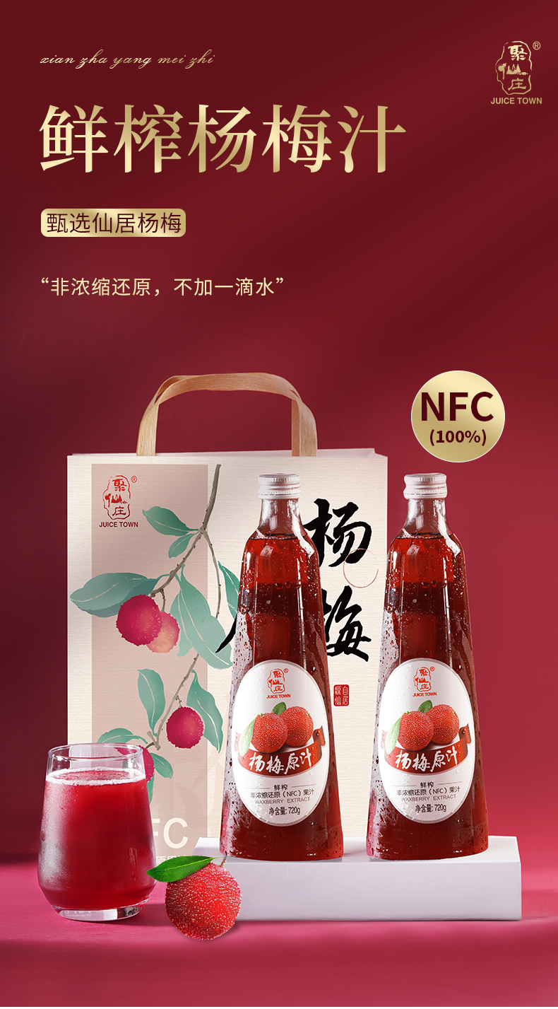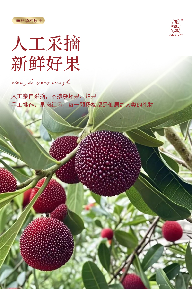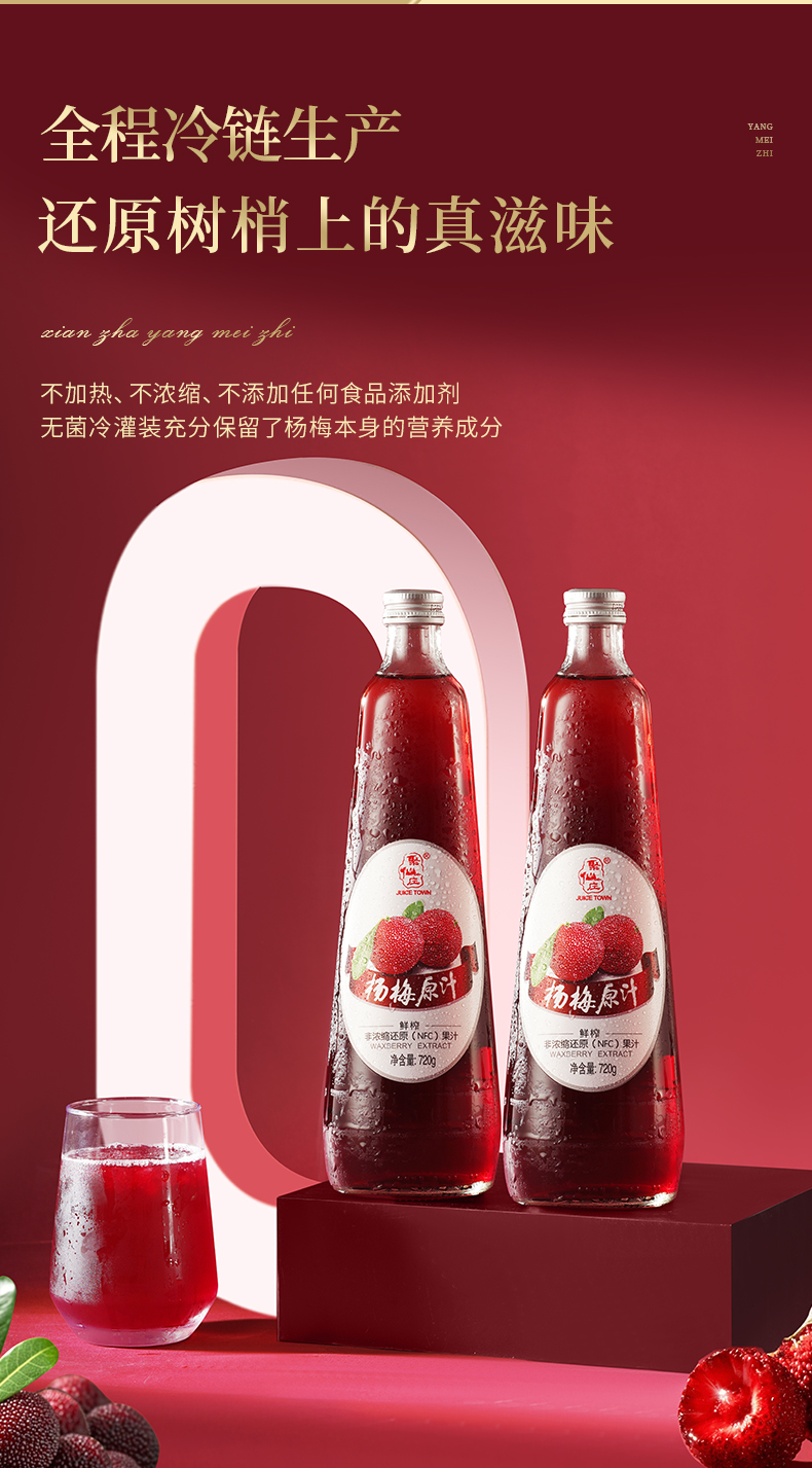 聚仙庄100%杨梅原汁,720Ml杨梅汁*2瓶,选用仙居荸荠种杨梅为原料,果肉鲜嫩多汁,不加热、不浓缩、不添加任何食品添加剂