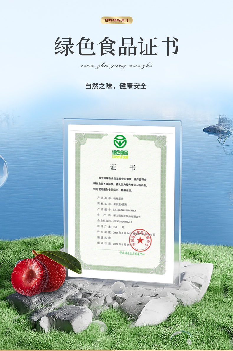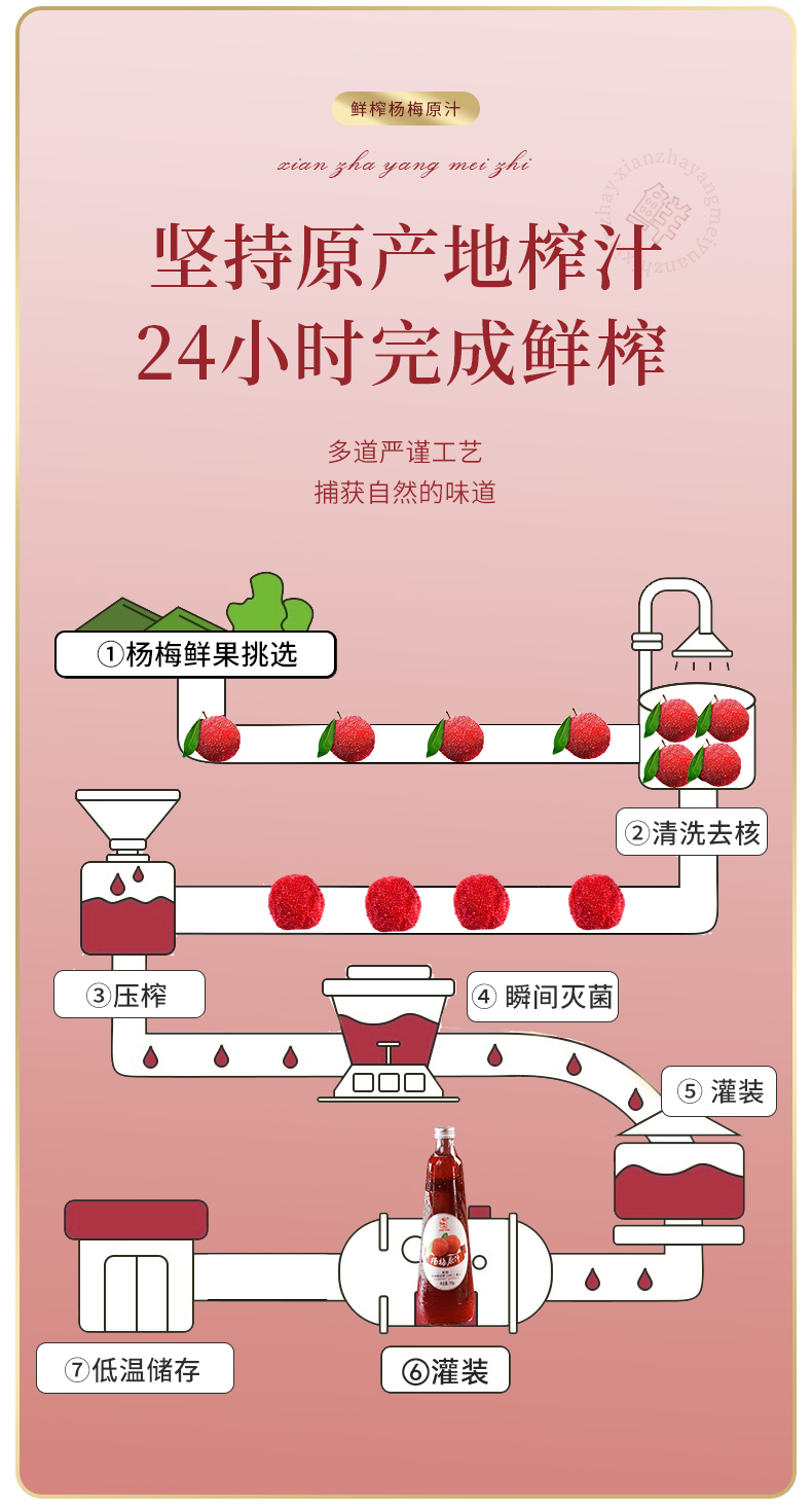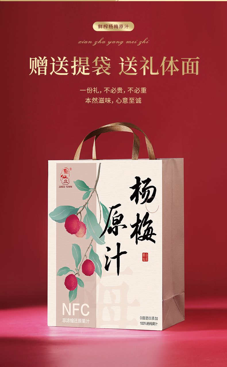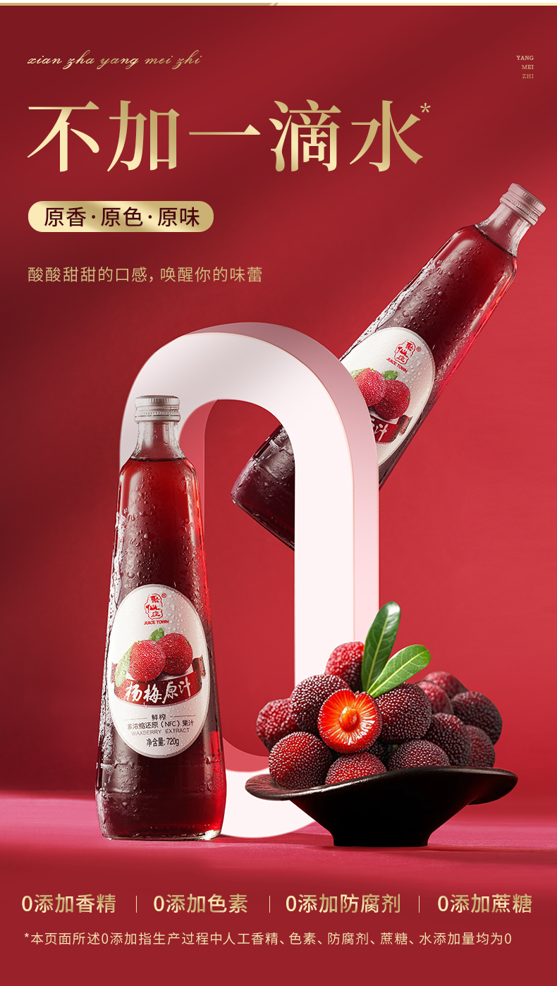 聚仙庄100%杨梅原汁,720Ml杨梅汁*2瓶,选用仙居荸荠种杨梅为原料,果肉鲜嫩多汁,不加热、不浓缩、不添加任何食品添加剂