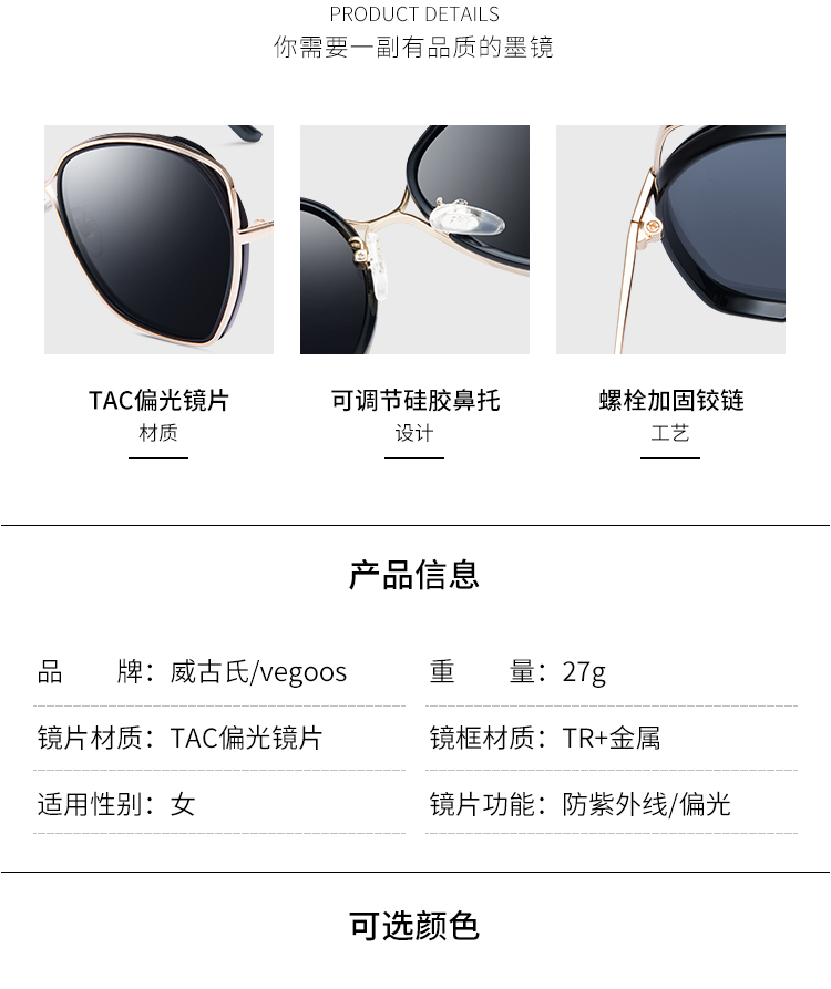 这款墨镜的框架,是比较时尚潮流的,一戴上妥妥的女神范就出来了,摩登时尚精心设计,大大的镜框可以很好的修饰脸型。