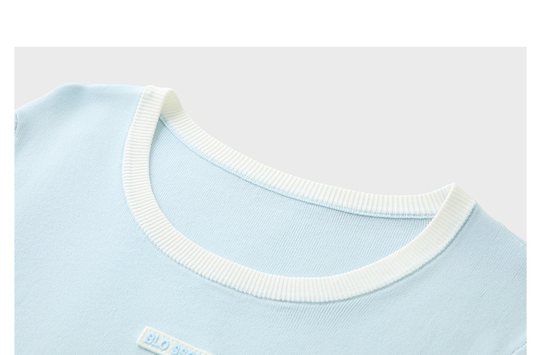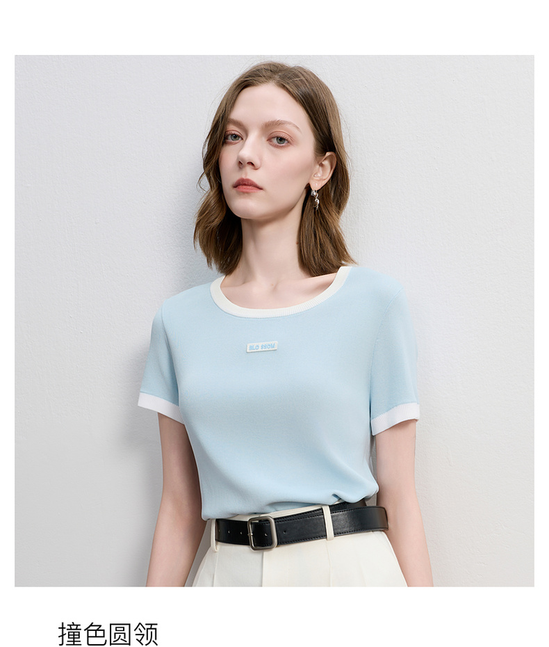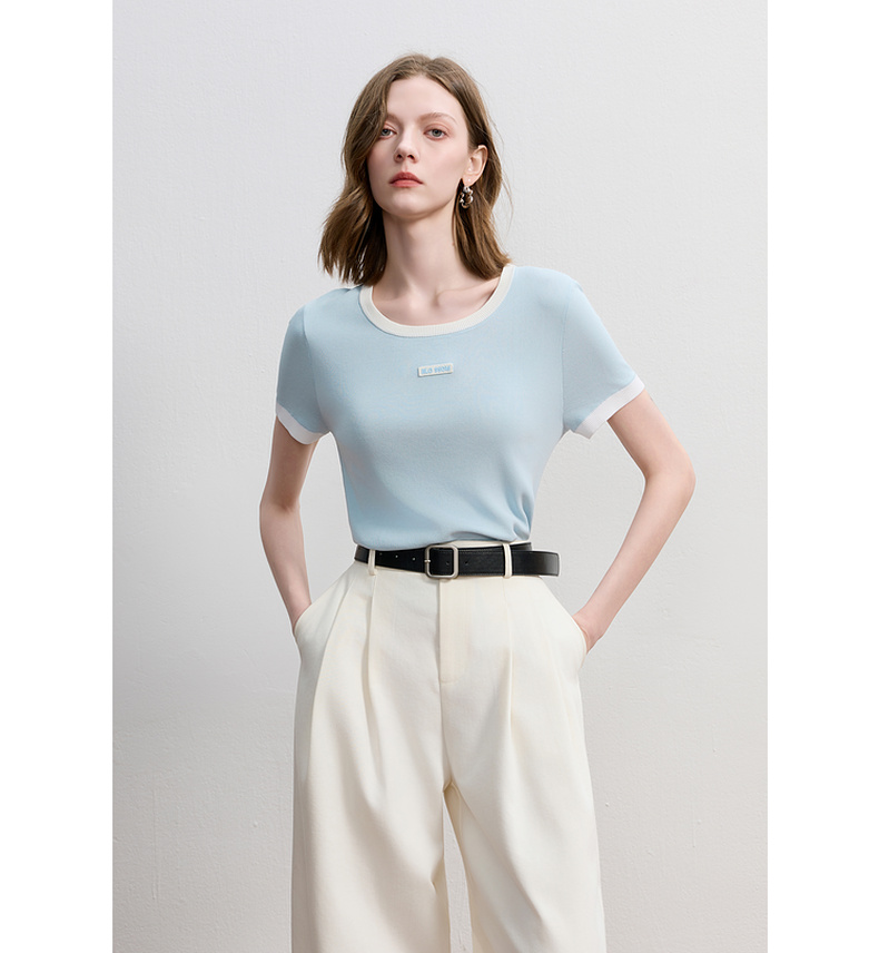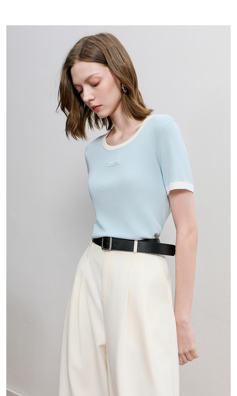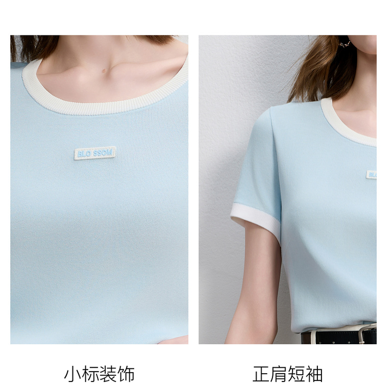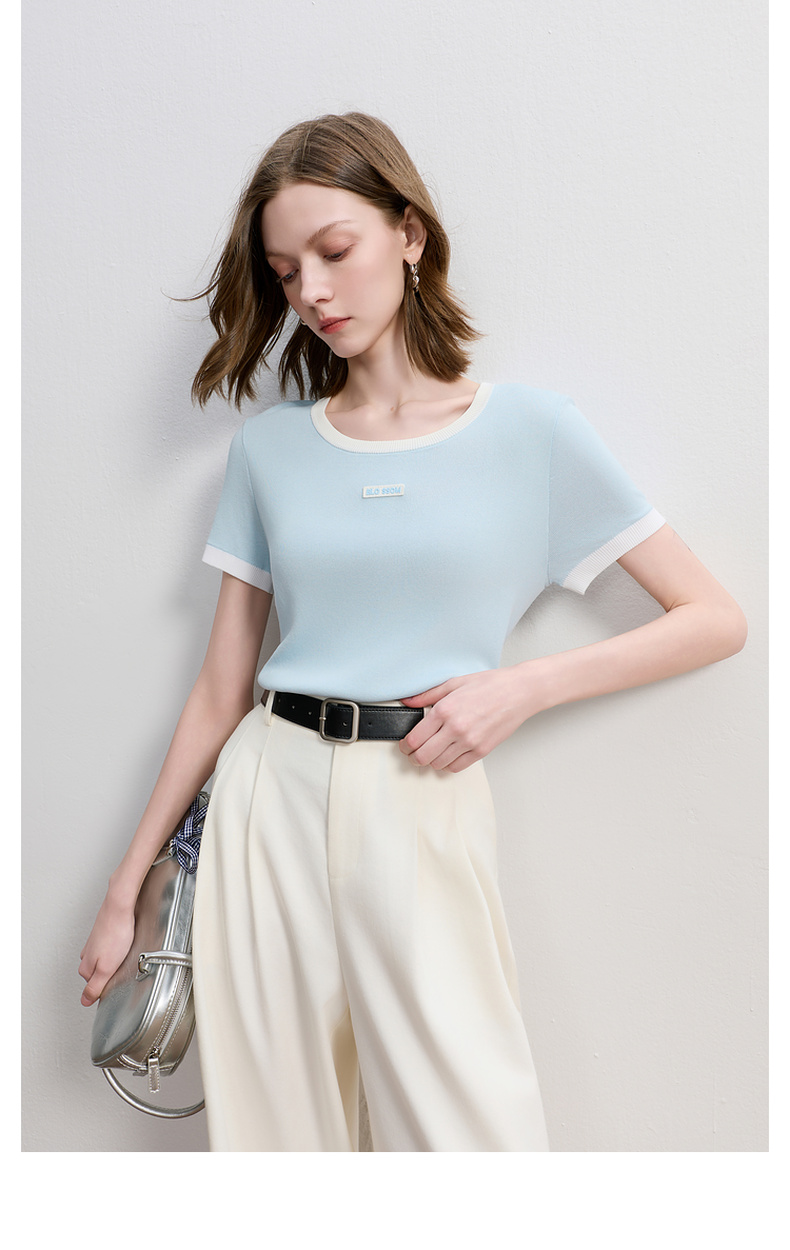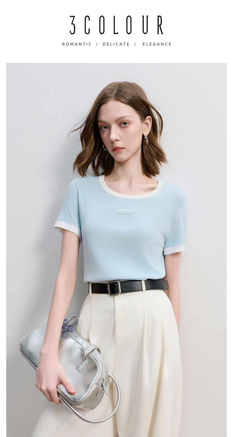 三彩2025秋季新款撞色针织衫圆领毛衫正肩短袖上衣套头M