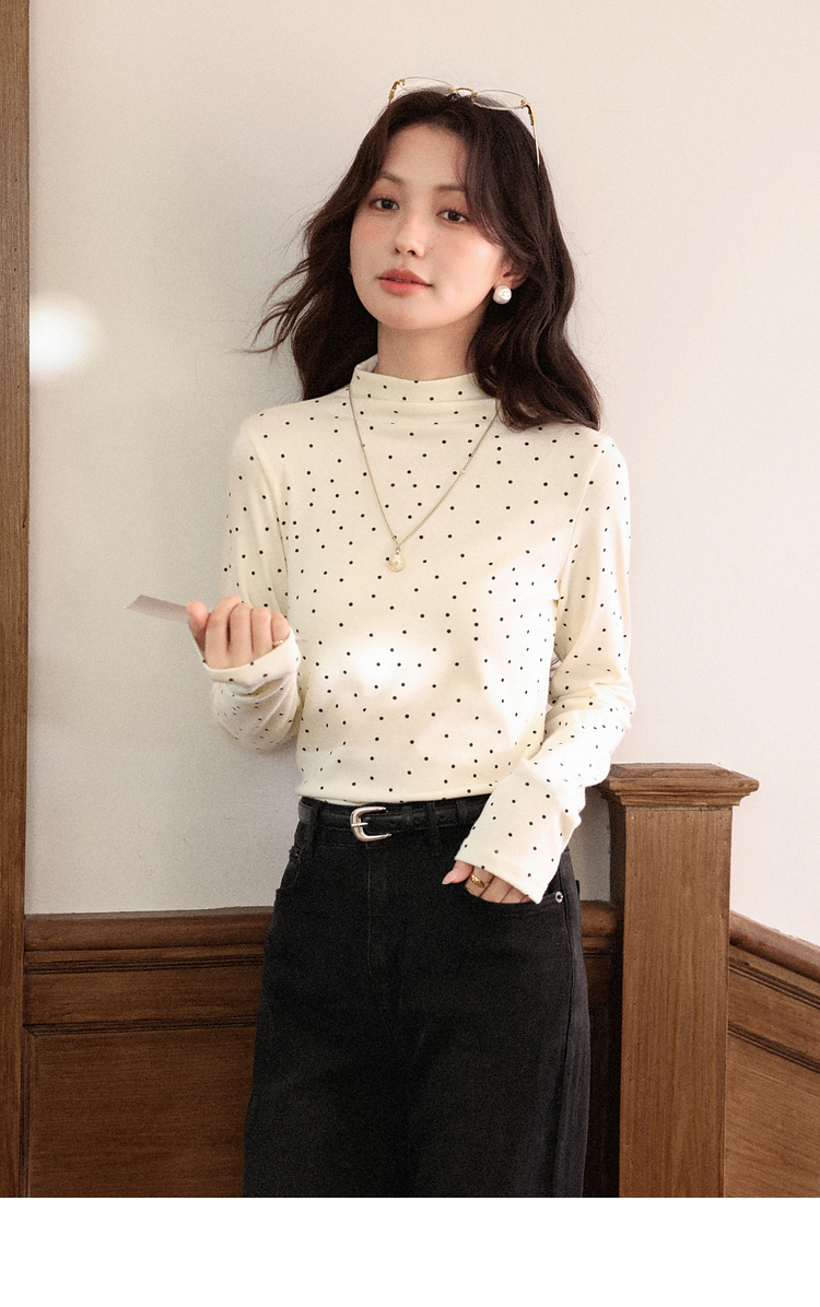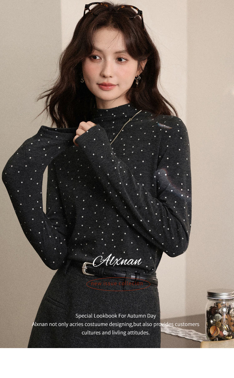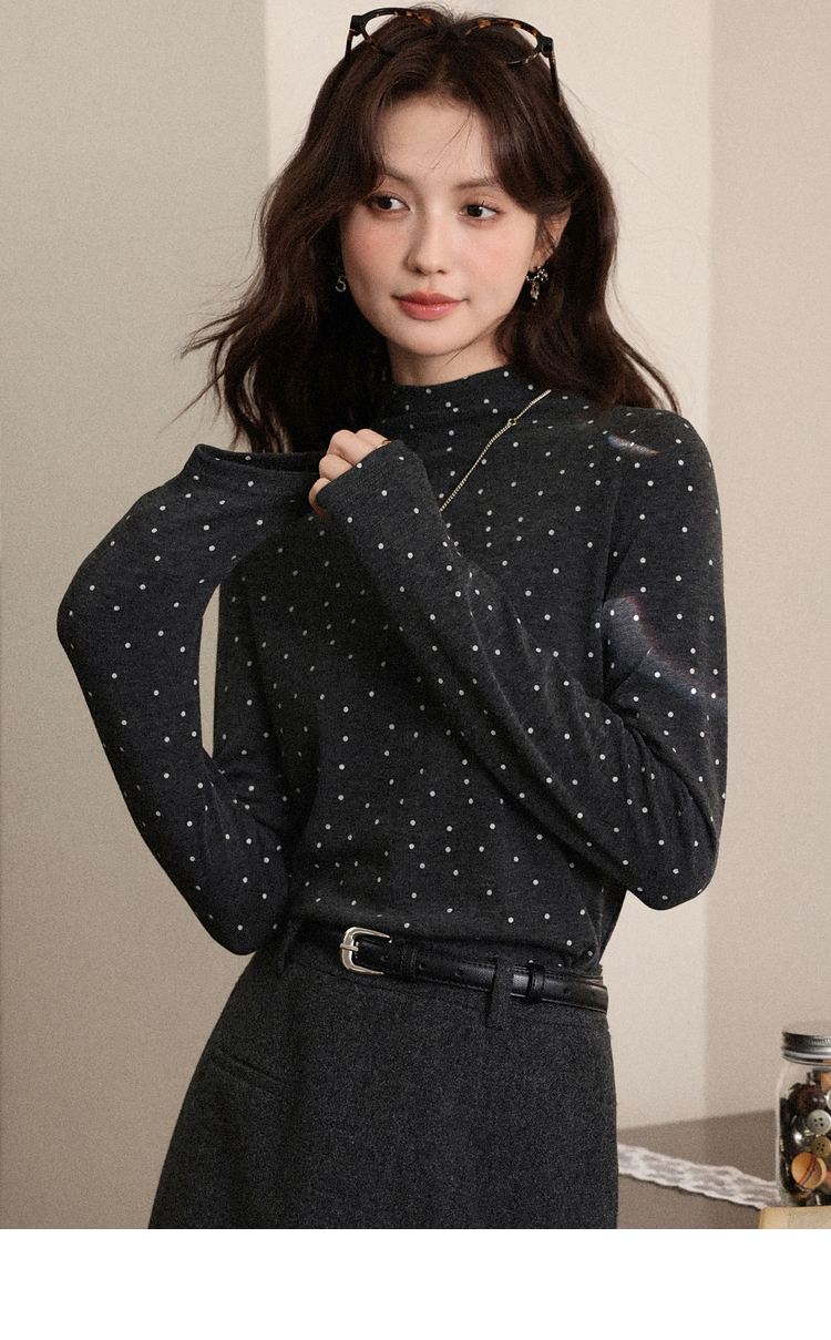 鹿向南「半糖记忆」灰色波点长袖T恤女秋季百搭显瘦半高领打底衫