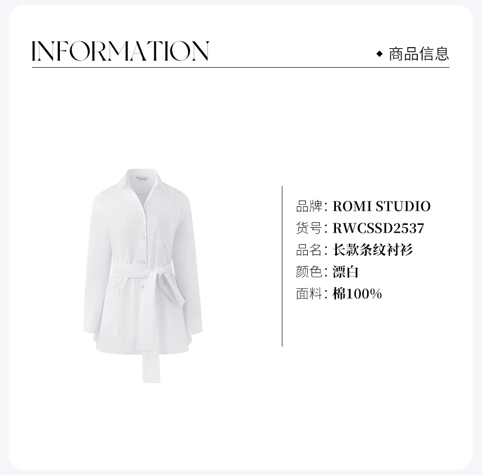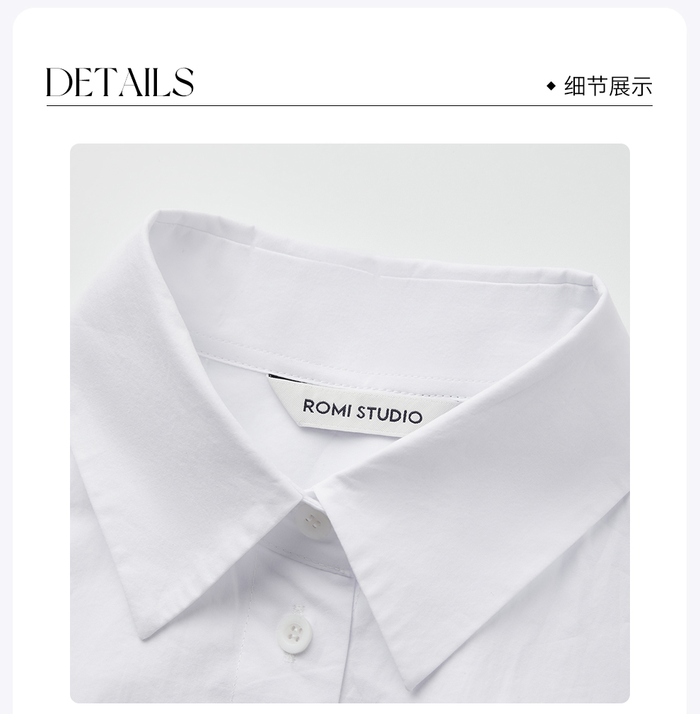ROMI STUDIO“Clean fit”白色不规则收腰长袖衬衣连衣裙RWCSSD2537
