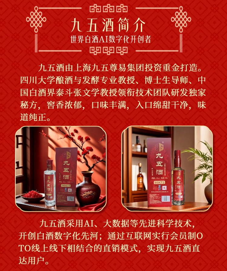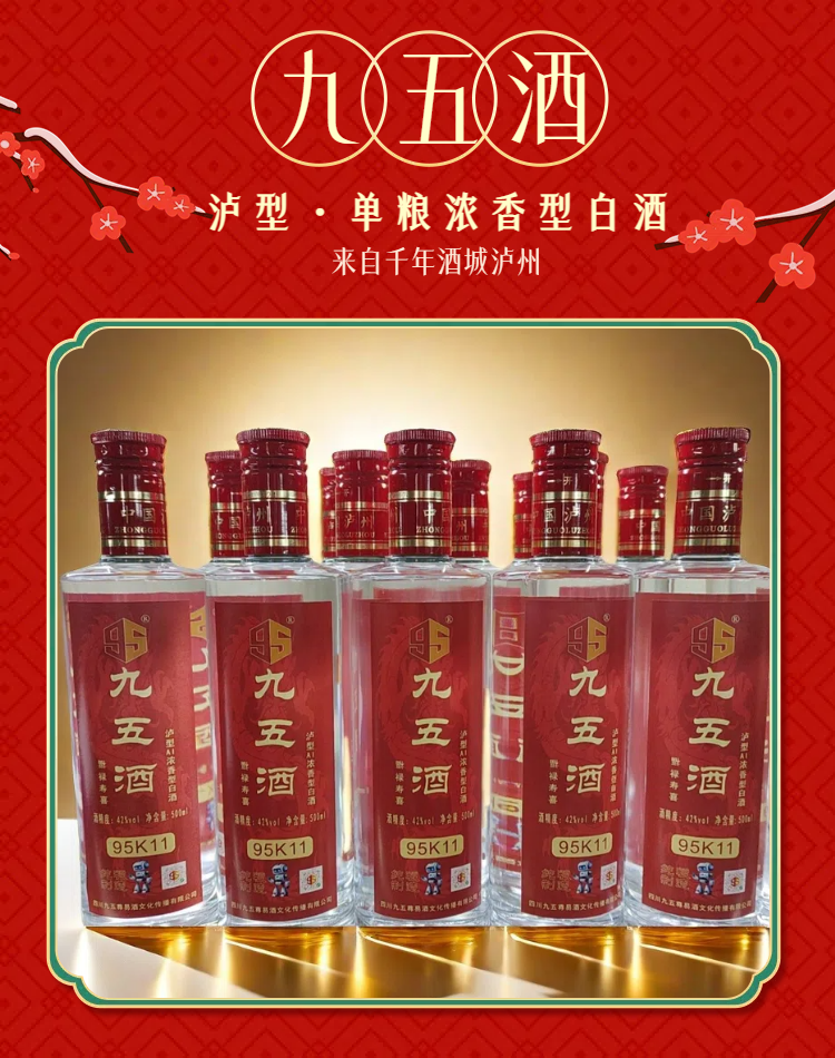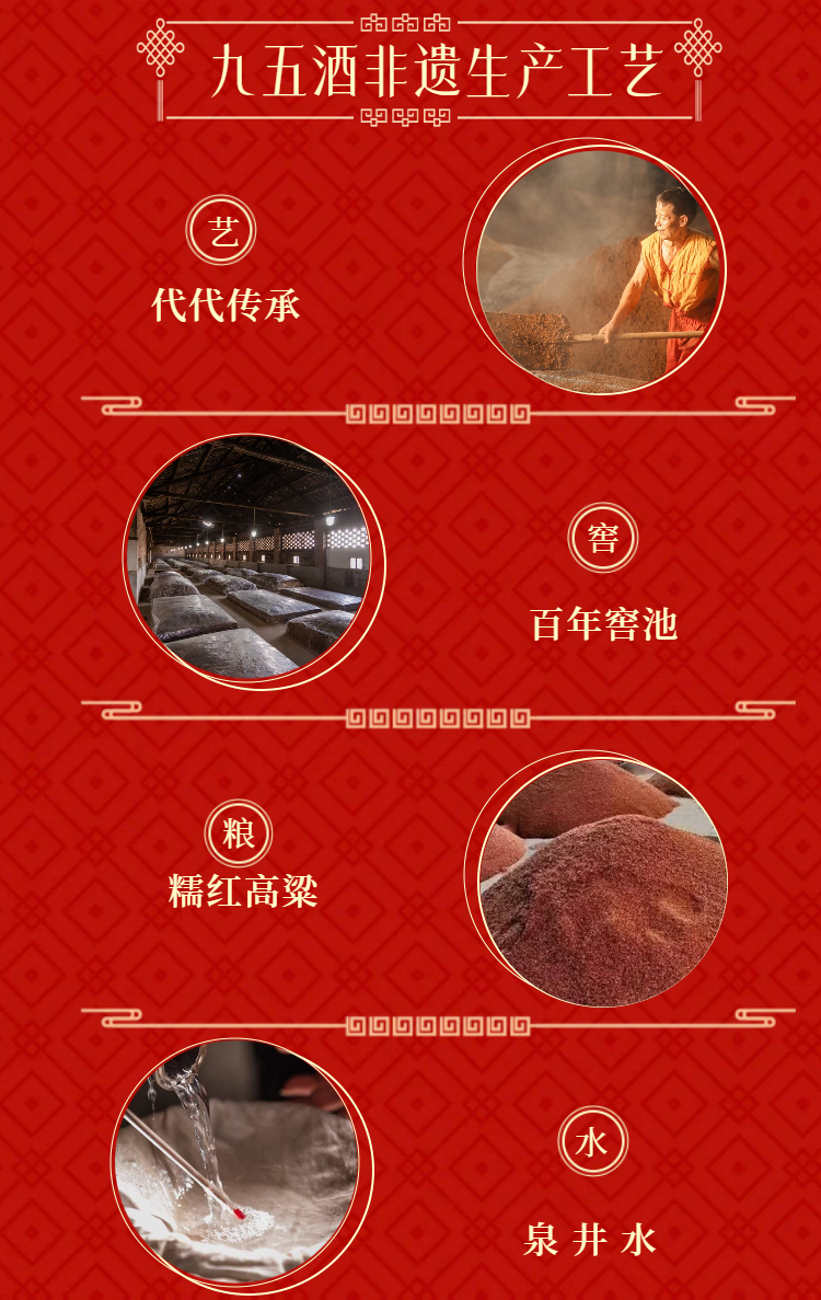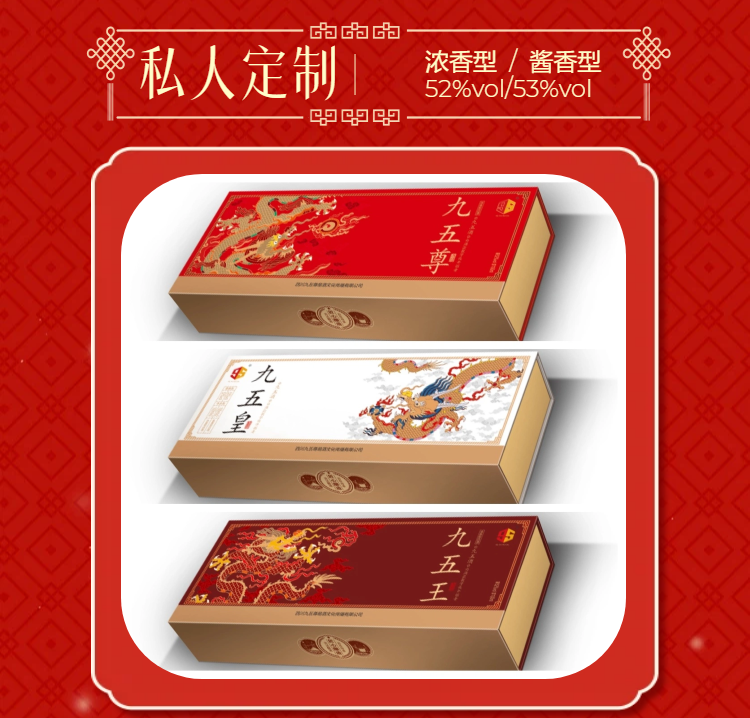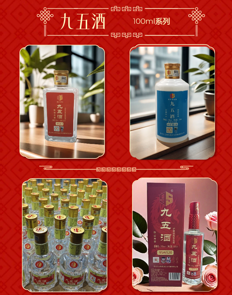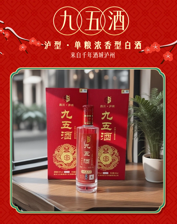 - 九五酒源自金三角产区,百年窖池、非遗工艺、千年传承酿造出泸型单粮浓香、茅台赤水河酱香、宜宾多粮浓香,简称“壹茅五”三种顶级绝佳口感美酒。