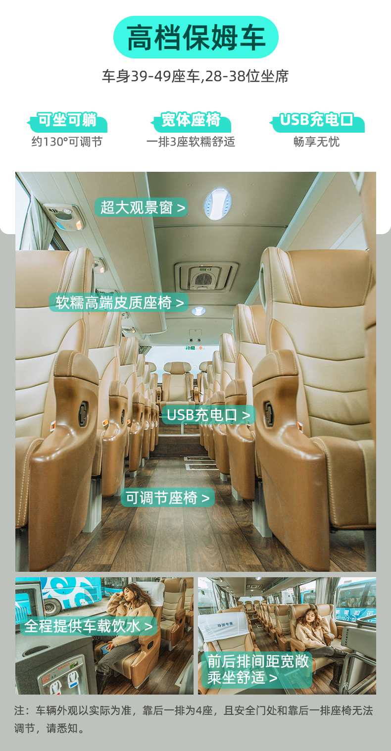 舒适旅游车:1排4座、39座左右空调旅游车、皮质/布质座椅、较为舒适。