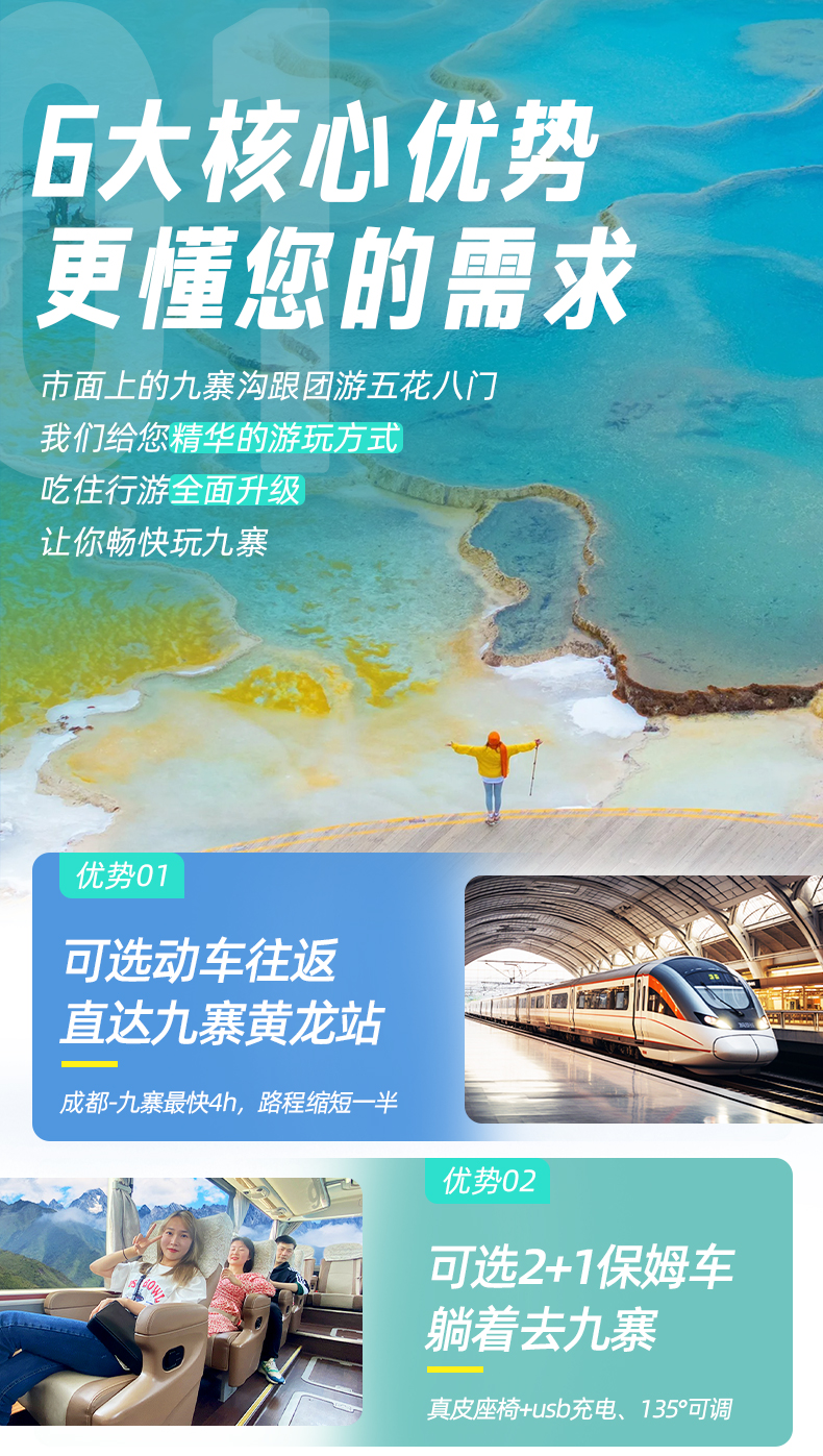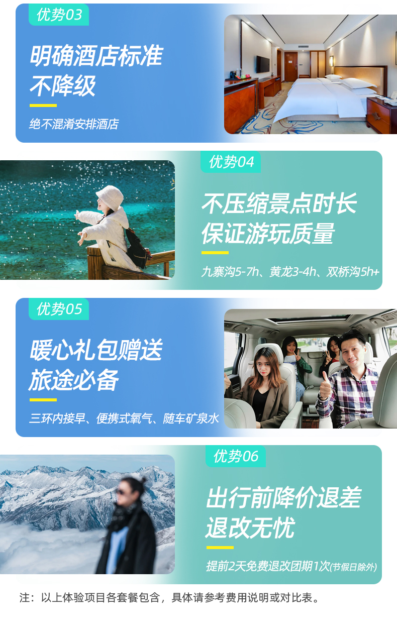 ③4月1日-5月31日全程优惠共退65元/人(九寨退50/黄龙退15),免票共退130元/人(九寨退100/黄龙退30);未上黄龙退30元/人;