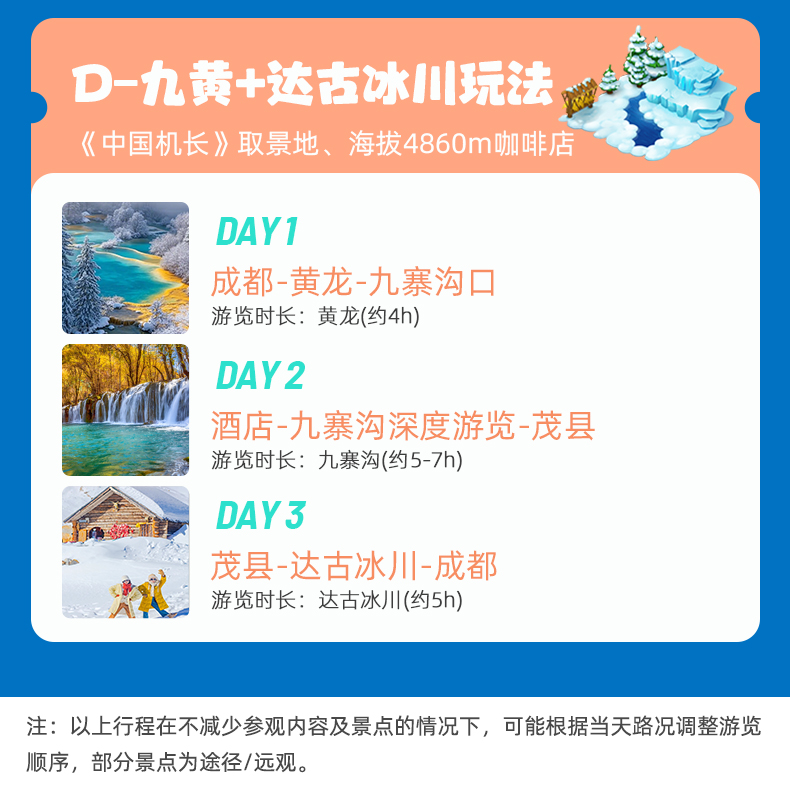 D套餐 含九寨沟、黄龙、达古冰川首道大门票。