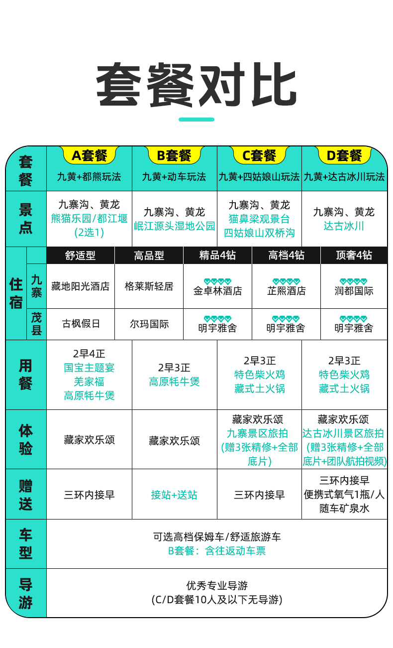 D套餐 不含九寨沟(旺季观光车90元/人或淡季观光车80元/人+景区内保险10元/人)、黄龙(索道上行80元/人+下行40元/人+景区内保险10元/人+黄龙耳麦30元/人)、黄龙观光车20元/人(2025年11月1日起,往返20元/人,去程15元/人,返程15元/人;观光车票每日限量6000张,请提前购买)、达古冰川观光车70元/人+索道180元/人。