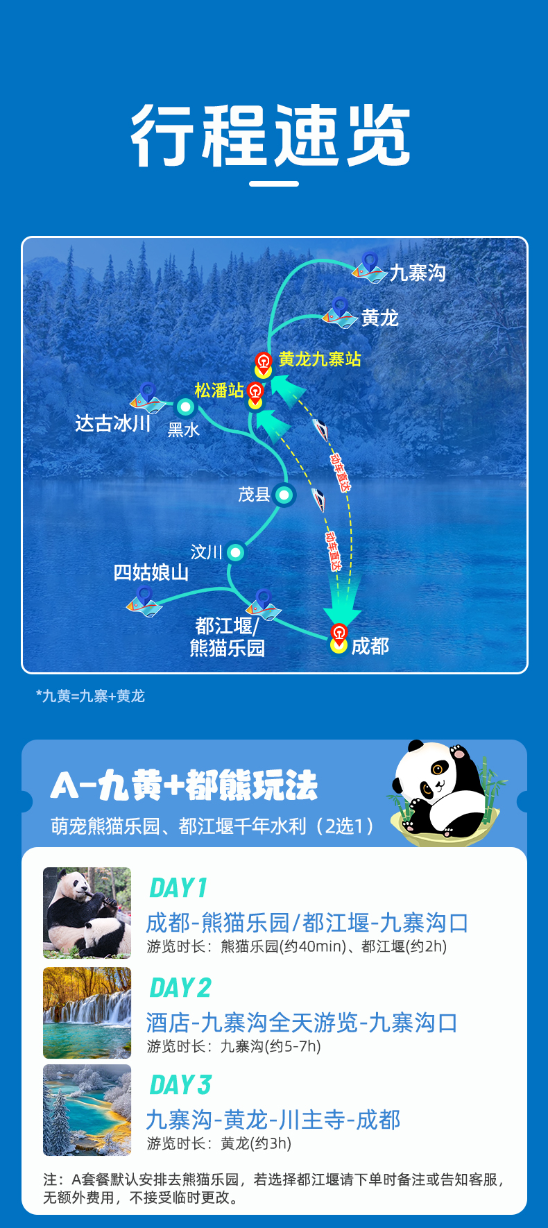 A套餐 含九寨沟门票、黄龙门票、熊猫乐园门票/都江堰大门票(默认安排去熊猫乐园,若选择都江堰请下单时备注或联系客服,无额外费用,不接受临时更改)。