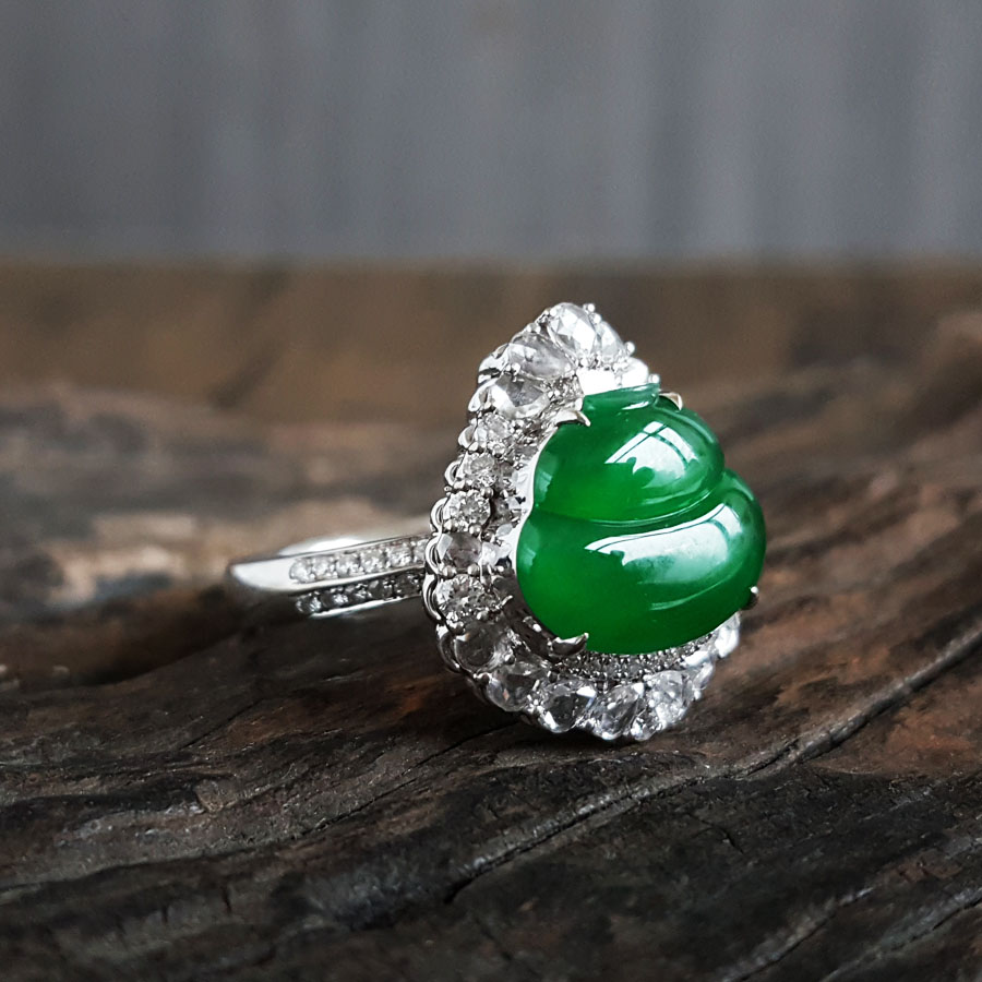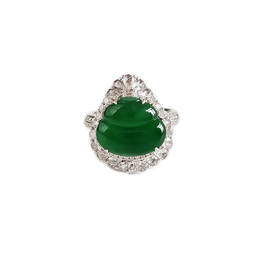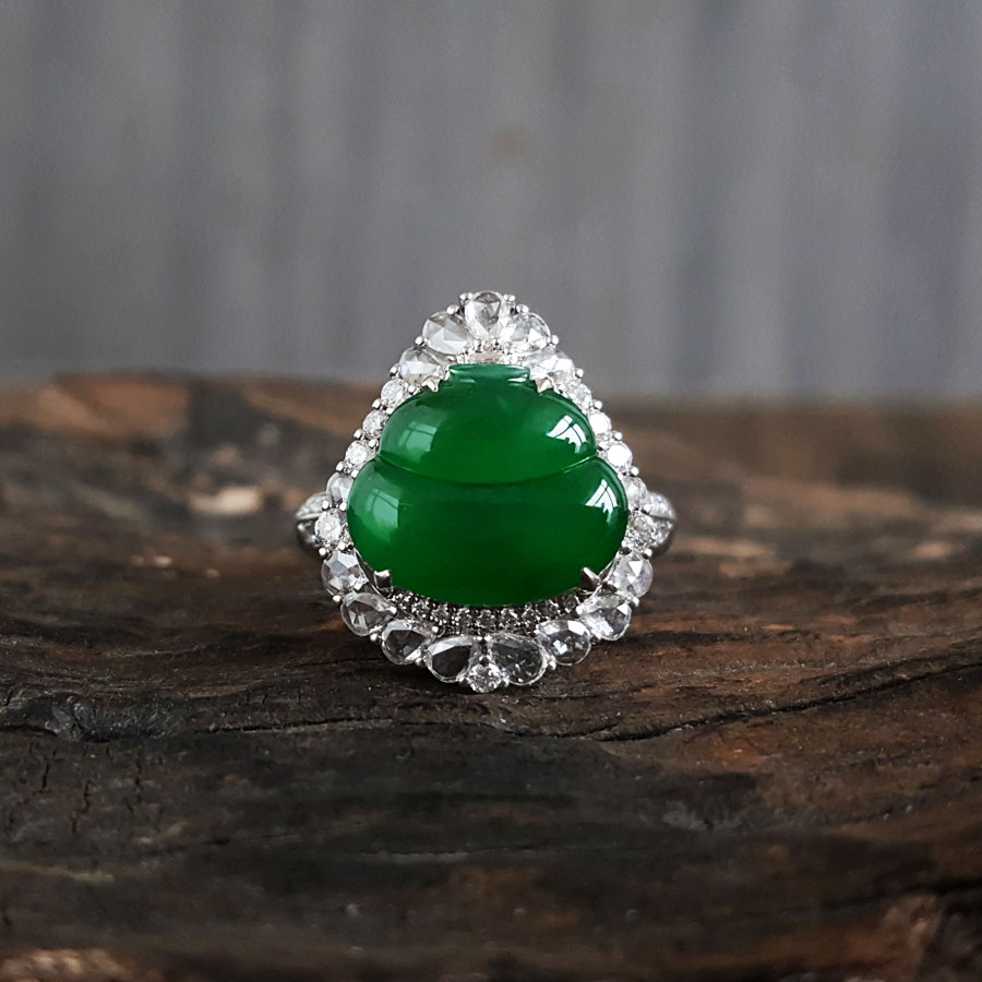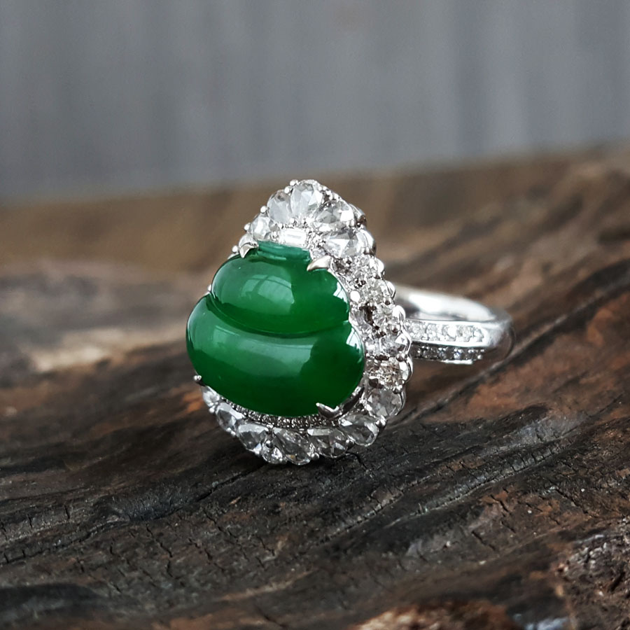 名称 | AU750收藏级白金豪镶钻镶天然细腻冰种满绿葫芦翡翠戒指 |