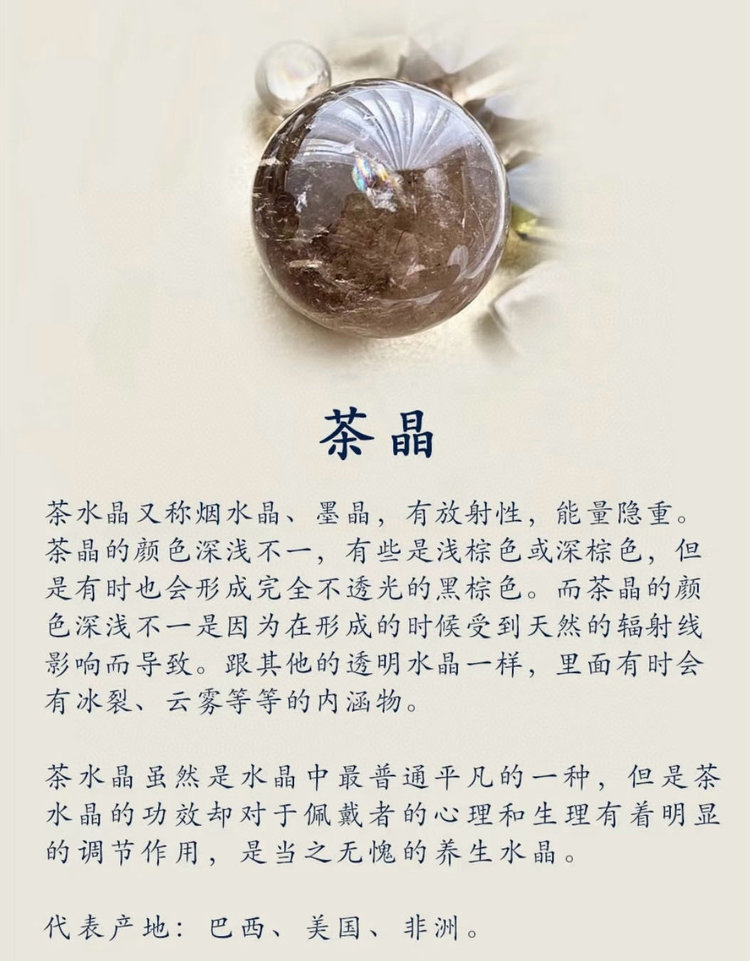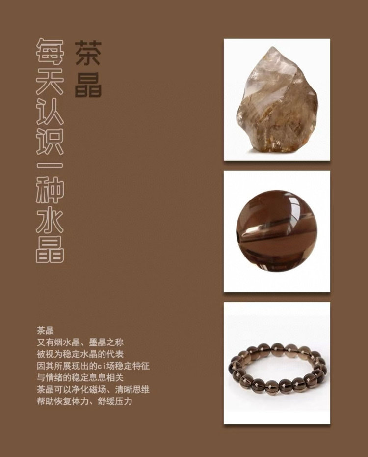 先说茶晶,它颜色深沉,就像一杯泡好的浓茶。在水晶世界里,茶晶被认为能帮助排解负面情绪。