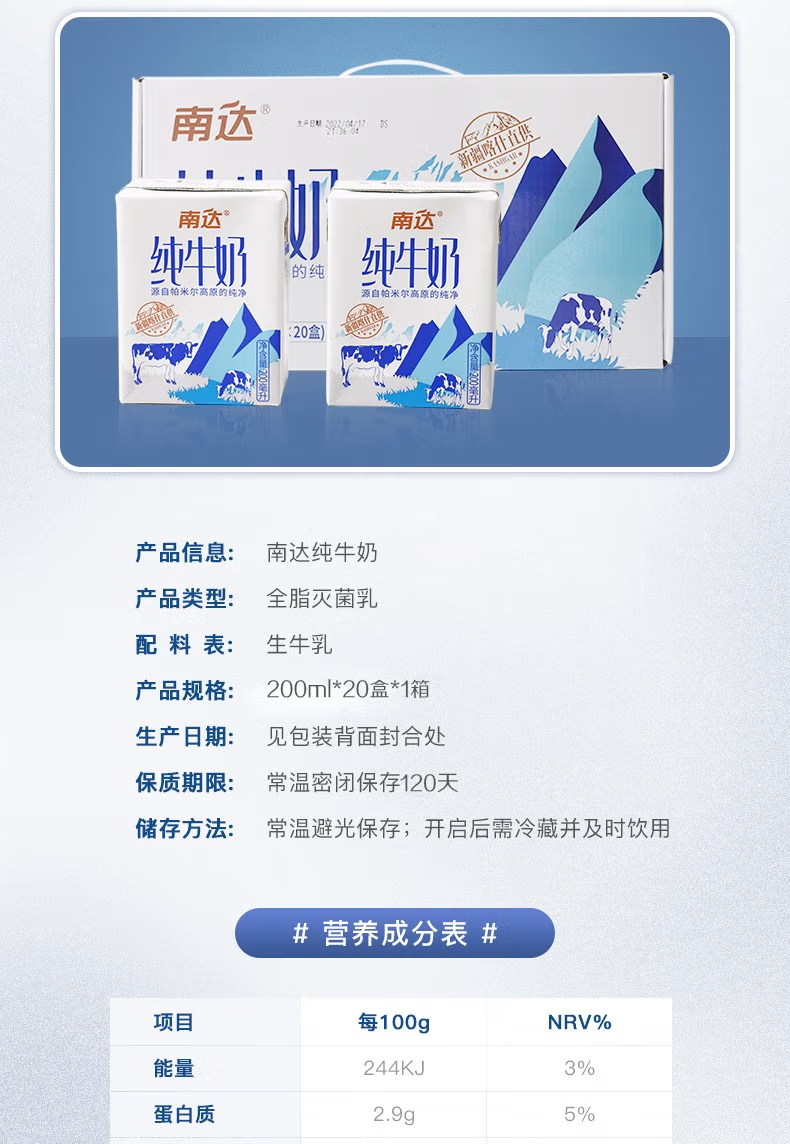新疆喀什南达南达纯牛奶(蓝色盒装)200ml*20盒/箱