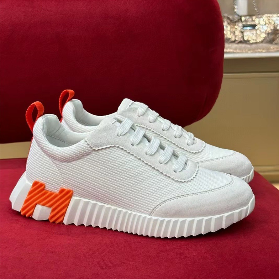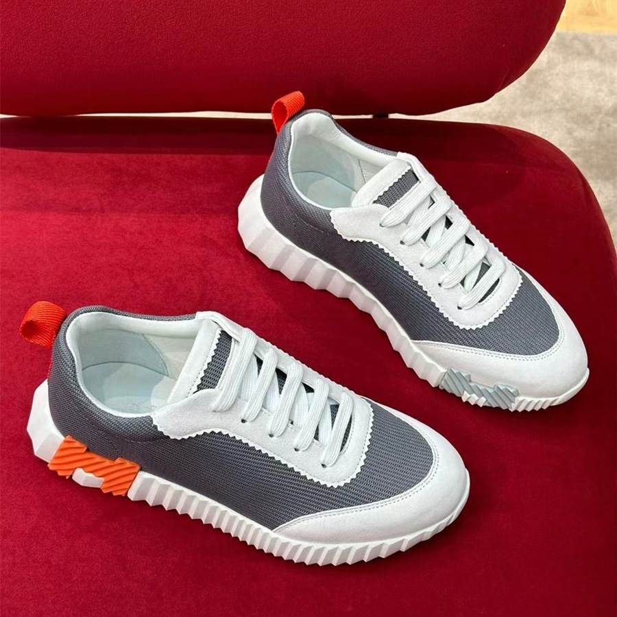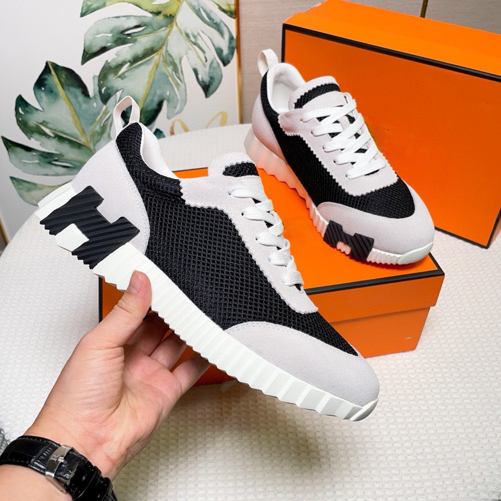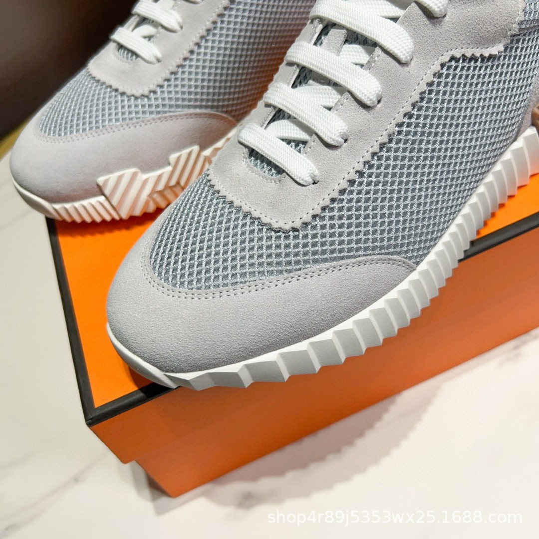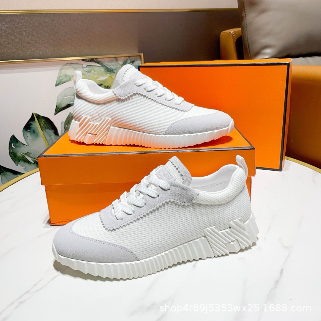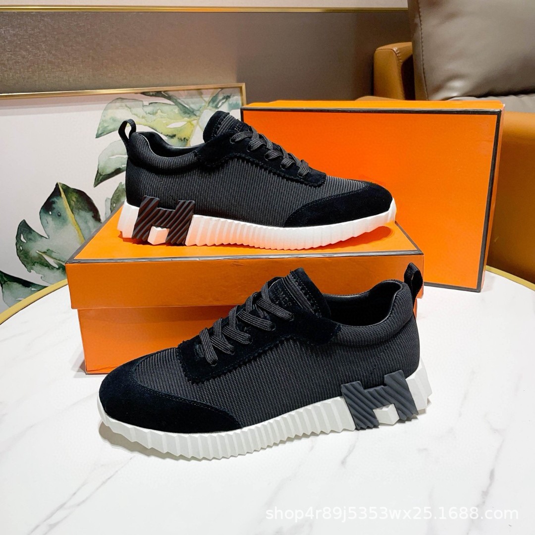 欧美新款H家休闲情侣运动鞋飞织真皮透气舒适系带拼色跑步鞋