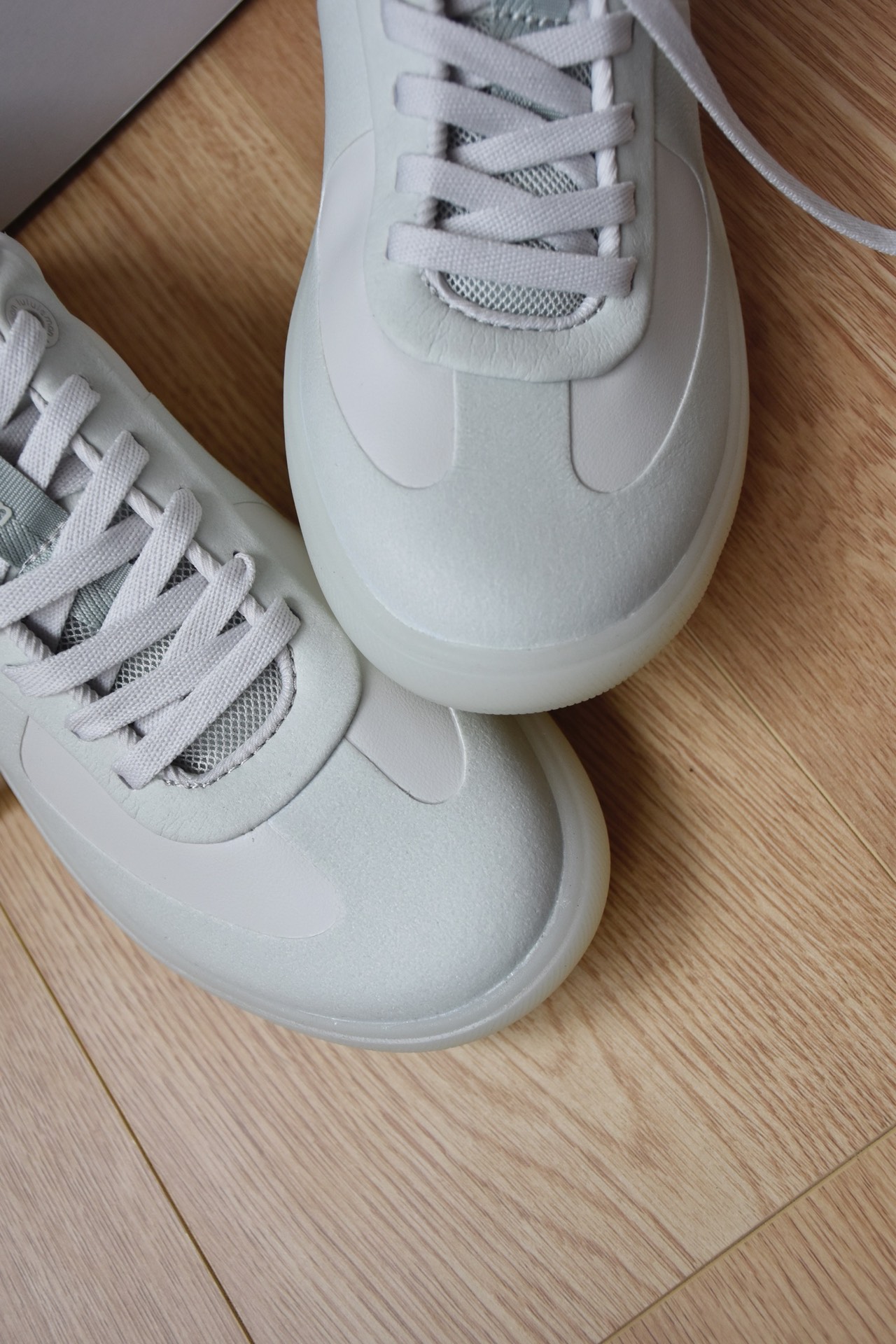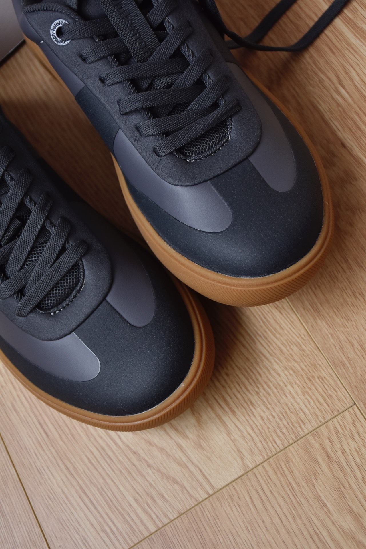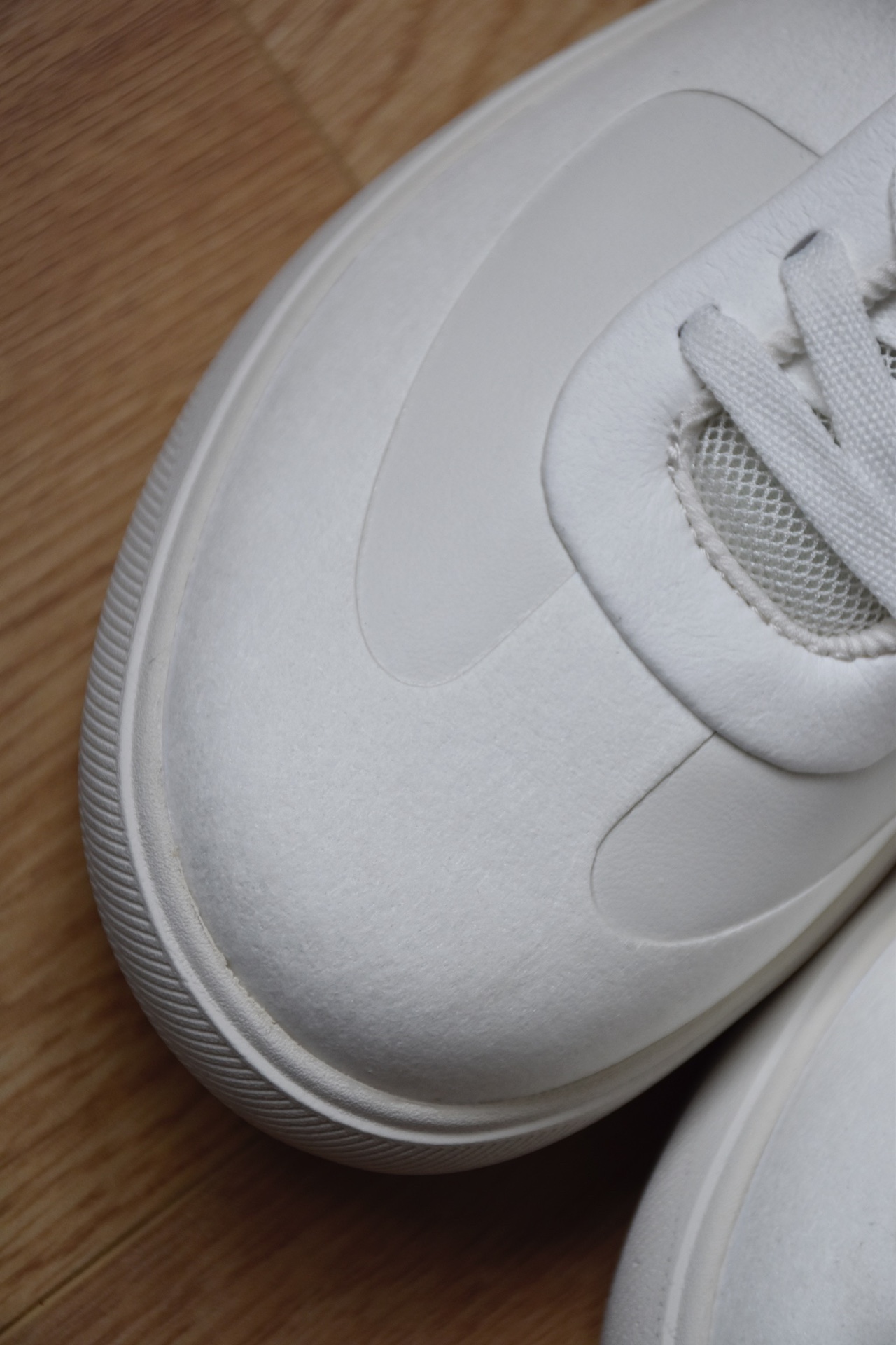 鞋面采用两种材质拼接,前半部分采用热熔压胶处理,无任何缝线,保留了鞋身的整体性 这种设计不仅美观,还增强了鞋的耐用性和舒适性