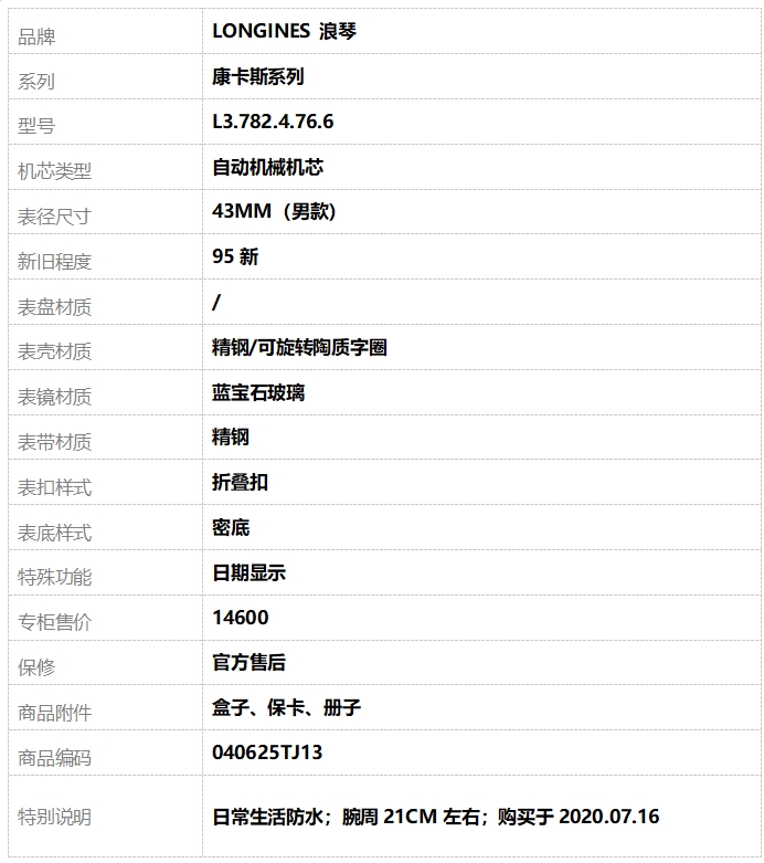 【95新】LONGINES浪琴康卡斯系列L3.782.4.76.6自动机械机芯43MM(男款)日期显示040625TJ13