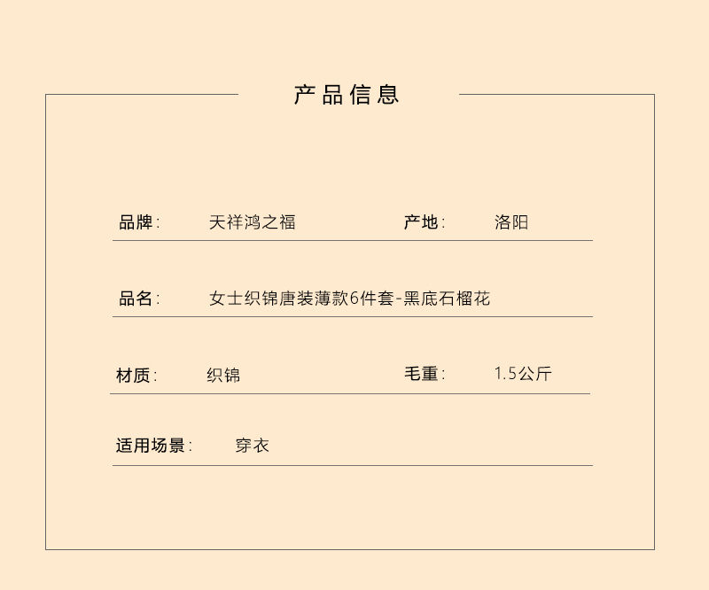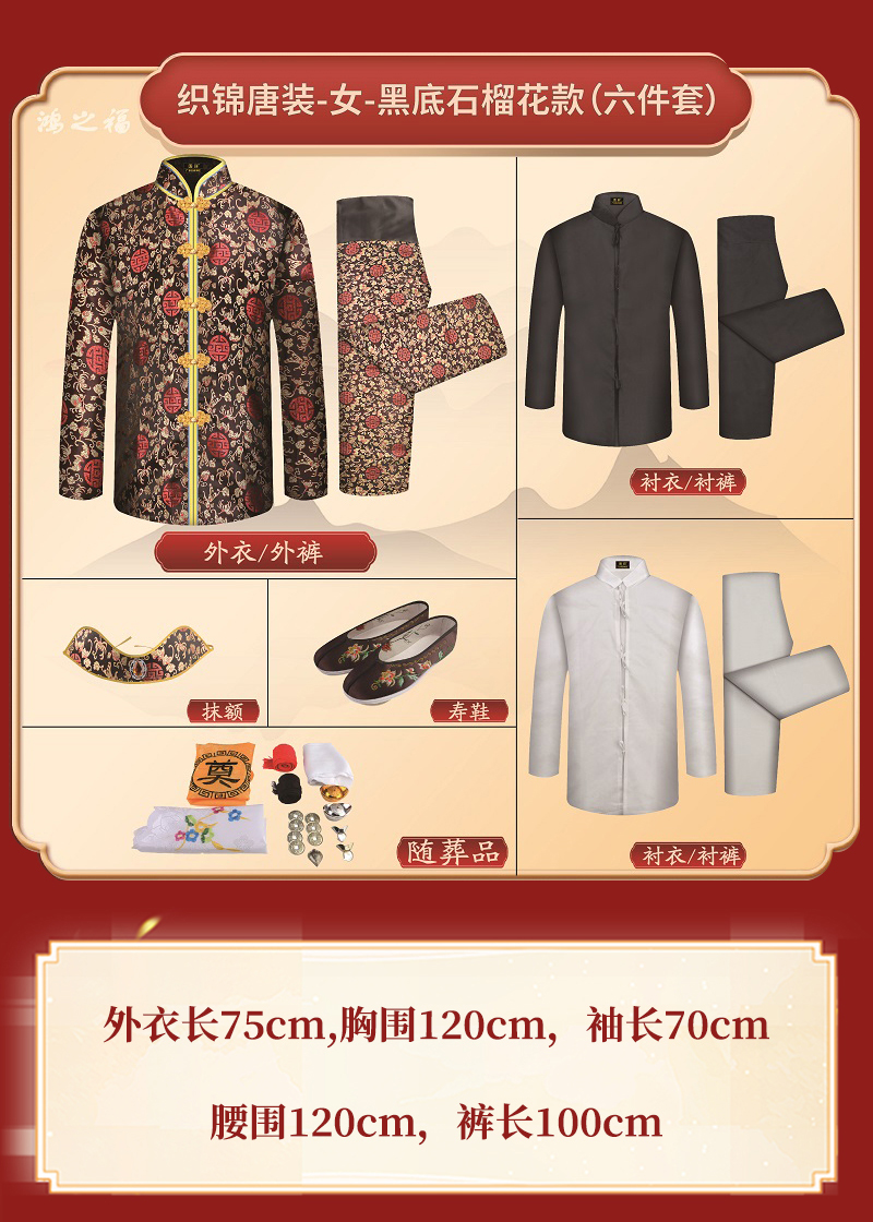 女士薄款织锦唐装黑底红石榴花6件套寿衣寿服套装