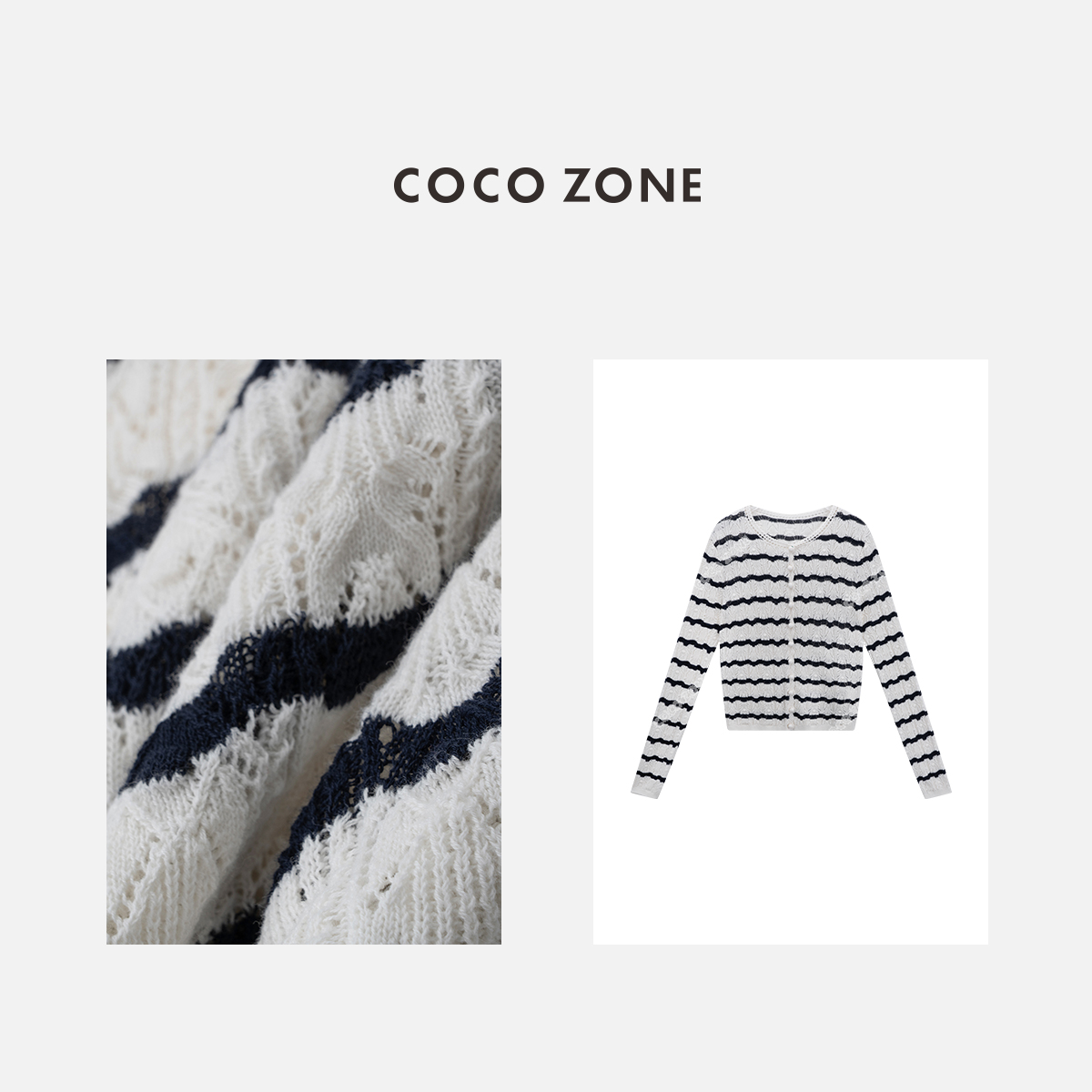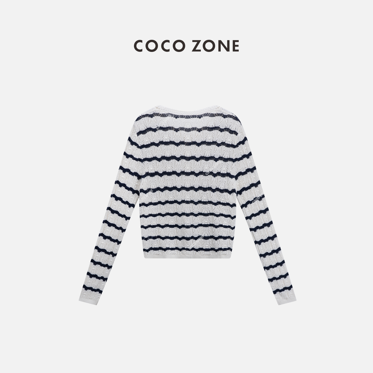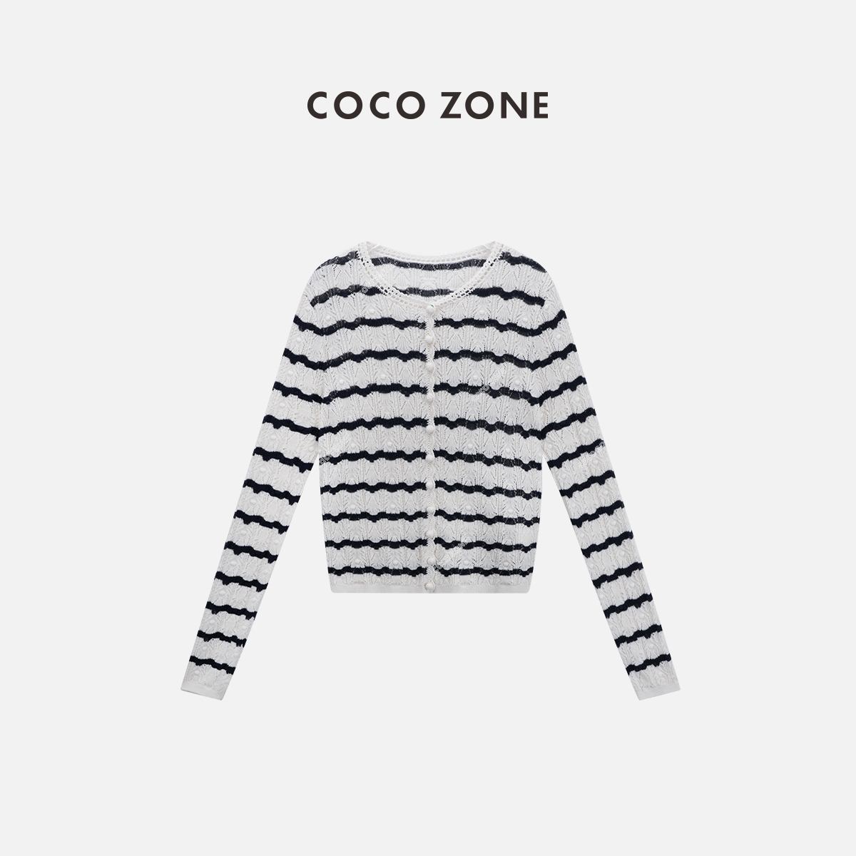 COCO ZONE ”迪迪小姐“ 复古镂空条纹针织衫长袖单排扣上衣CC2B0986