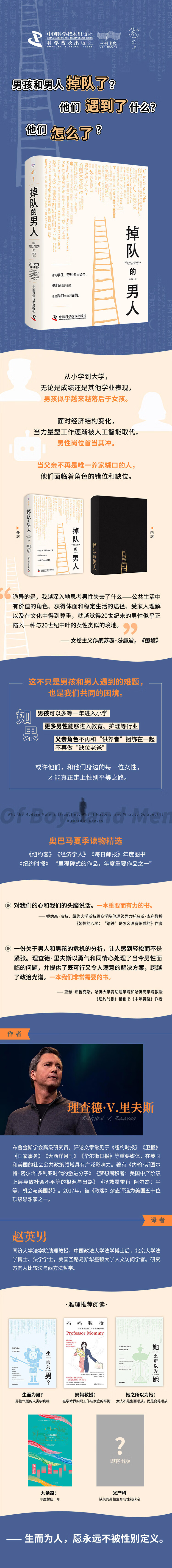 目录前言 从一筹莫展的父亲到忧心忡忡的政策专家第一部分 男性困境第一章 女孩为王:男孩在教育中落后第二章 打工人布鲁斯:男性在劳动力市场的地位正在下降第三章 错位老爸:父亲在家庭中失去了自己的传统角色第二部分 双重劣势第四章 德怀特的眼镜:黑人男孩和男人面临严峻挑战第五章 阶层天花板:贫穷的男孩和男人正在苦苦挣扎第六章 非应答者:政策对男孩和男人并不奏效第三部分 生物学与文化第七章 制造男性:先天与后天因素都很重要第四部分 政治困境第八章 进步主义的盲点:政治左翼不肯接受现实第九章 勃然大怒:政治右翼想要时光倒流第五部分 怎么办第十章 给男孩穿上红衫:男孩需要多等一年进入课堂第十一章 男性可以从事“HEAL”行业:让男性从事属于未来的工作第十二章 父亲的新面孔:作为独立社会制度的父亲身份结语