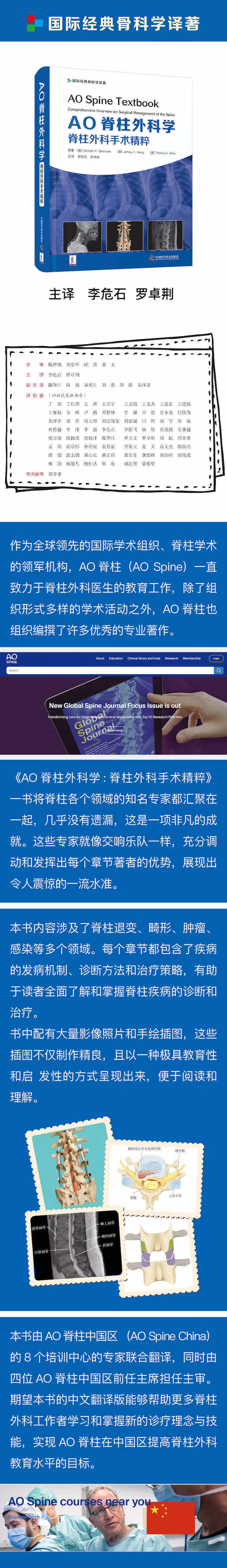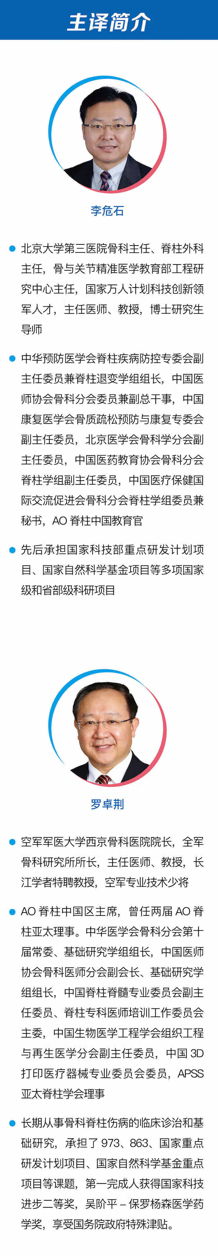 李危石 北京大学第三医院骨科主任、脊柱外科主任,骨与关节精准医学教育部工程研究中心主任,国家万人计划科技创新领军人才,主任医师、教授,博士研究生导师。中华预防医学会脊柱疾病防控专委会副主任委员兼脊柱退变学组组长,中国医师协会骨科分会委员兼副总干事,中国康复医学会骨质疏松预防与康复专委会副主任委员,北京医学会骨科学分会副主任委员,中国医药教育协会骨科分会脊柱学组副主任委员,中国医疗保健国际交流促进会骨科分会脊柱学组委员兼秘书,AO 脊柱中国教育官。先后承担国家科技部重点研发计划项目、国家自然科学基金项目等多项GJ级和省部级科研项目。 罗卓荆 空军军医大学西京骨科医院院长,全军骨科研究所所长,主任医师、教授,长江学者特聘教授,空军专业技术少将。AO 脊柱中国区主席,曾任两届 AO 脊柱亚太理事。中华医学会骨科分会第十届常委、基础研究学组组长,中国医师协会骨科医师分会副会长、基础研究学组组长,中国脊柱脊髓专业委员会副主任委员、脊柱专科医师培训工作委员会主委,中国生物医学工程学会组织工程与再生医学分会副主任委员,中国 3D 打印医疗器械专业委员会委员,APSS 亚太脊柱学会理事。长期从事骨科脊柱伤病的临床诊治和基础研究,承担了 973、863、国家重点研发计划项目、国家自然科学基金重点项目等课题,第一完成人获得国家科技进步二等奖,吴阶平 - 保罗杨森医学药学奖,享受国务院政府特殊津贴。