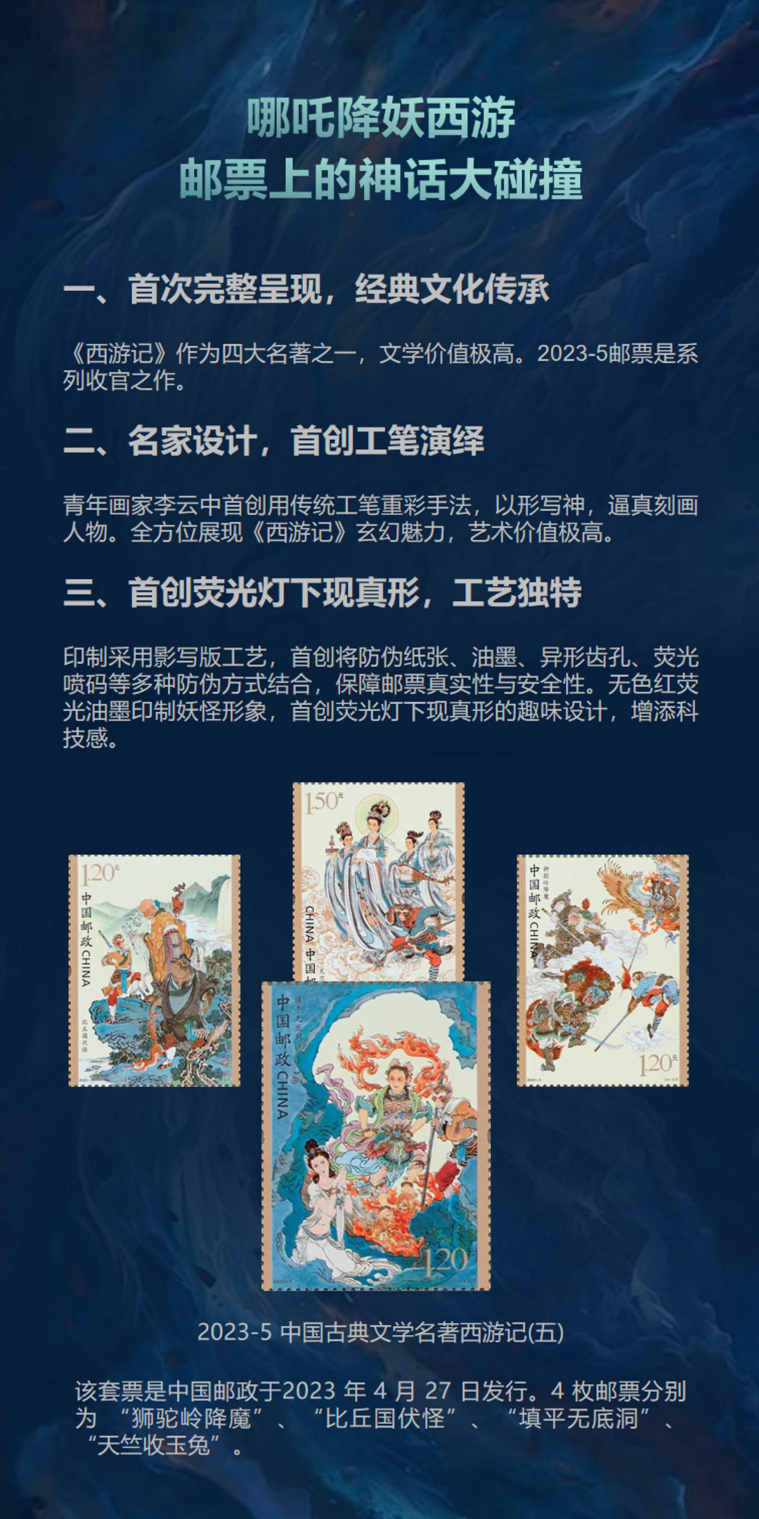 《西游记》作为四大名著之一,文学价值极高。该套票是中国邮政于2023年4月27日发行。4枚邮票分别为“狮驼岭降魔”“比丘国伏怪”“填平无底洞”“天竺收玉兔”,是该系列收官之作。