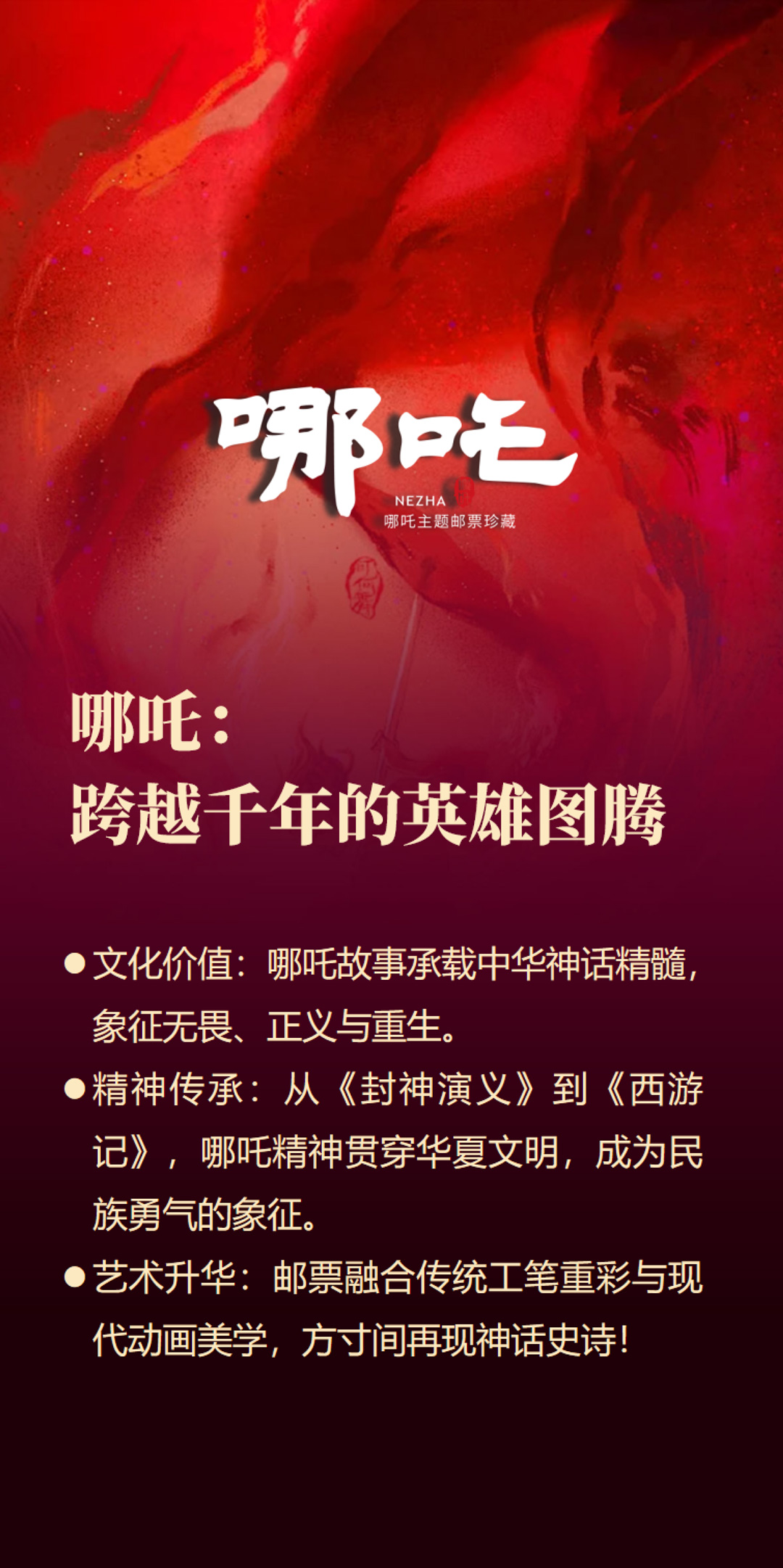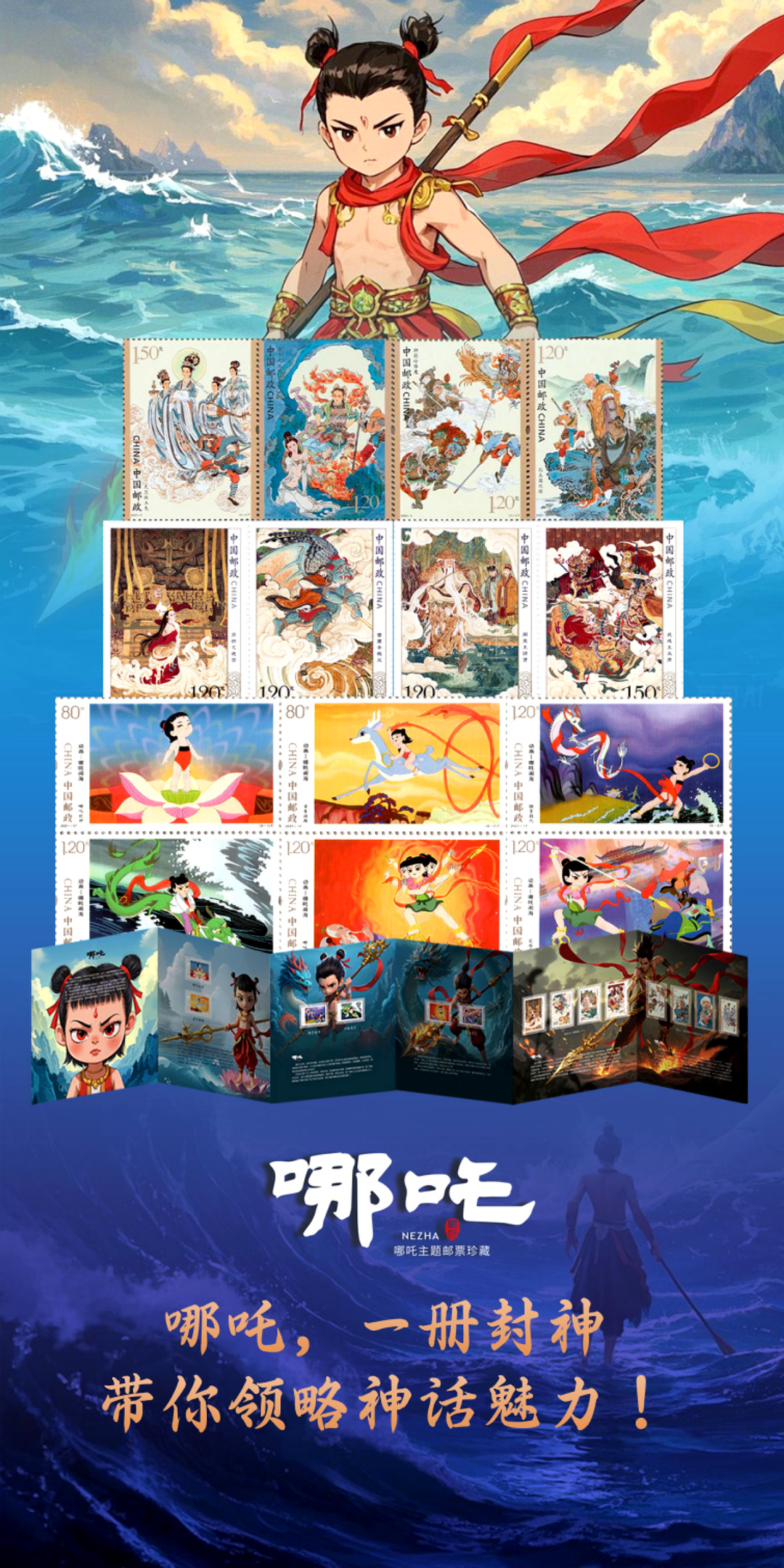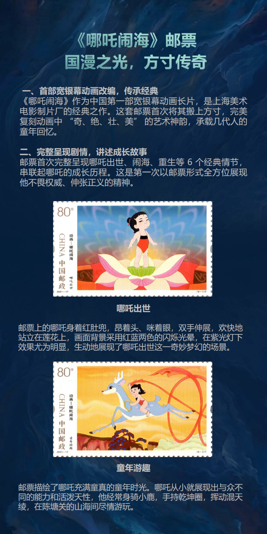 邮票首次完整呈现哪吒出世、闹海、重生等6个经典情节,串联起哪吒的成长历程。