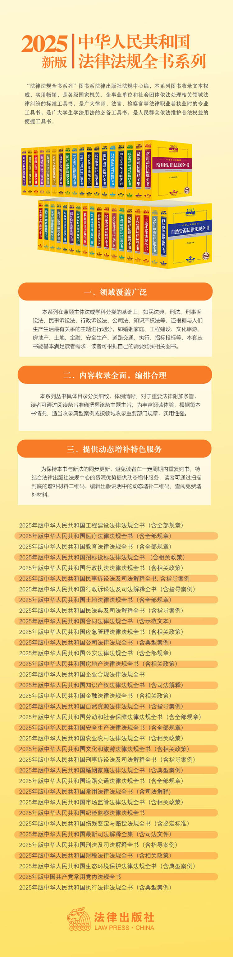 2025年版;法律法规全书系列共35本,具有以下特点: (1)领域覆盖广泛,分册设置实用。本系列在兼顾主体法或学科分类的基础上,设置民法典、刑法、刑事诉讼法、民事诉讼法、行政诉讼法、公司法、知识产权法等分册,同时还根据人们生产生活对应主题,设置婚姻家庭、工程建设、文化旅游、房地产、土地、金融、安全生产、道路交通、执行、招标投标等分册,满足读者不同需求,读者可根据自己的需要购买相关图书。 (2)内容收录全面,编排合理。本系列丛书具体目录分类细致,体例清晰;对于重要法律附加条旨,读者可通过阅读条旨准确把握该条主题主旨;为丰富阅读体验,根据每本书情况,适当收录典型案例或按领域收录重要部门规章,实用性强。 (3)提供动态增补特色服务。为保持本书与新法的同步更新,避免读者在一定周期内重复购书,特结合法律出版社法规中心的资源优势提供动态增补服务,读者可通过扫描封底的增补材料二维码、编辑出版说明中的动态增补二维码,查阅免费增补材料。 2025年版;法律法规全书系列分册如下: 1. 978_7_5197_9735_5 2025年版中华人民共和国工程建设法律法规全书:含全部规章 2. 978_7_5197_9739_3 2025年版中华人民共和国教育法律法规全书:含全部规章 3. 978_7_5197_9747_8 2025年版中华人民共和国招标投标法律法规全书:含相关政策 4. 978_7_5197_9765_2 2025年版中华人民共和国行政诉讼法及司法解释全书:含指导案例 5. 978_7_5197_9731_7 2025年版中华人民共和国土地法律法规全书:含全部规章 6. 978_7_5197_9726_3 2025年版中华人民共和国合同法律法规全书:含示范文本 7. 978_7_5197_9746_1 2025年版中华人民共和国应急管理法律法规全书:含相关政策 8. 978_7_5197_9761_4 2025年版中华人民共和国公司法律法规全书:含典型案例 9. 978_7_5197_9760_7 2025年版中华人民共和国房地产法律法规全书:含相关政策 10. 978_7_5197_9741_6 2025年版中华人民共和国企业合规法律法规全书 11. 978_7_5197_9763_8 2025年版中华人民共和国劳动和社会保障法律法规全书:含全部规章 12. 978_7_5197_9734_8 2025年版中华人民共和国安全生产法律法规全书:含全部规章 13. 978_7_5197_9740_9 2025年版中华人民共和国农业农村法律法规全书:含相关政策 14. 978_7_5197_9828_4 2025年版中华人民共和国文化和旅游法律法规全书:含相关政策 15. 978_7_5197_9784_3 2025年版中华人民共和国医疗法律法规全书:含全部规章 16. 978_7_5197_9738_6 2025年版中华人民共和国纪检监察法律法规全书:含指导性案例 17. 978_7_5197_9742_3 2025年版中华人民共和国伤残鉴定与赔偿法规全书:含鉴定标准 18. 978_7_5197_9745_4 2025年版中华人民共和国行政执法法律法规全书:含相关政策 19. 978_7_5197_9764_5 2025年版中华人民共和国民事诉讼法及司法解释全书:含指导案例 20. 978_7_5197_9750_8 2025年版中华人民共和国刑事诉讼法及司法解释全书:含指导案例 21. 978_7_5197_9728_7 2025年版中华人民共和国民法典及司法解释全书:含指导案例 22. 978_7_5197_9749_2 2025年版中华人民共和国最新司法解释全集:含司法文件 23. 978_7_5197_9737_9 2025年版中华人民共和国婚姻家庭法律法规全书:含典型案例 24. 978_7_5197_9736_2 2025年版中华人民共和国公安法律法规全书:含全部规章 25. 978_7_5197_9759_1 2025年版中华人民共和国道路交通法律法规全书:含全部规章 26. 978_7_5197_9766_9 2025年版中华人民共和国知识产权法律法规全书:含司法解释 27. 978_7_5197_9762_1 2025年版中华人民共和国金融法律法规全书:含相关政策 28. 978_7_5197_9733_1 2025年版中华人民共和国常用法律法规全书:含司法解释 29. 978_7_5197_9744_7 2025年版中华人民共和国刑法及司法解释全书:含指导案例 30. 978_7_5197_9767_6 2025年版中华人民共和国自然资源法律法规全书:含指导案例 31. 978_7_5197_9743_0 2025年版中华人民共和国市场监管法律法规全书:含相关政策 32. 978_7_5197_9758_4 2025年版中华人民共和国财税法律法规全书:含相关政策 33. 978_7_5197_9729_4 2025年版中华人民共和国生态环境保护法律法规全书:含典型案例 34. 978_7_5197_9748_5 2025年版中华人民共和国执行法律法规全书:含典型案例 35. 978_7_5197_6298_8 2025年版中国共产党常用党内法规全书