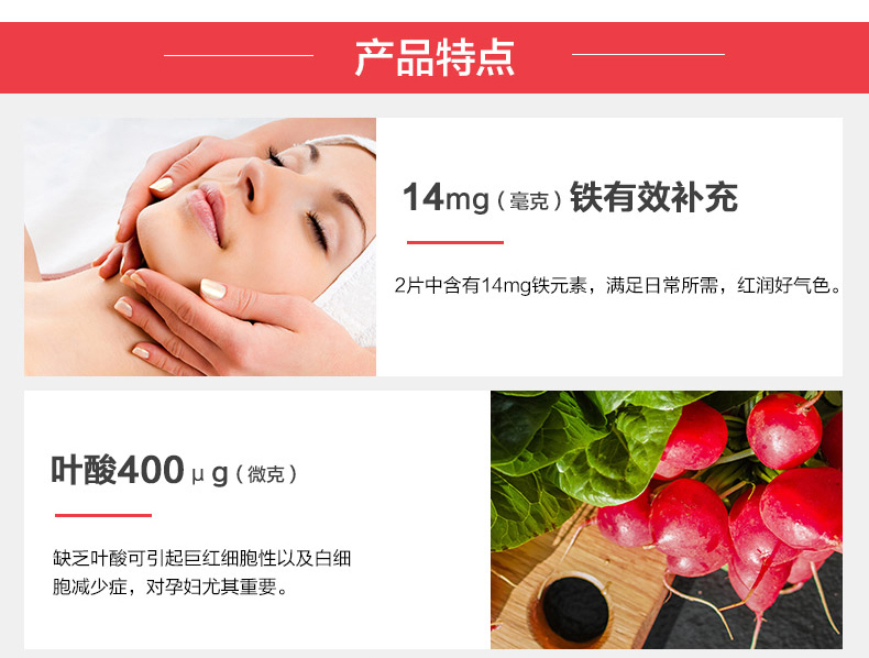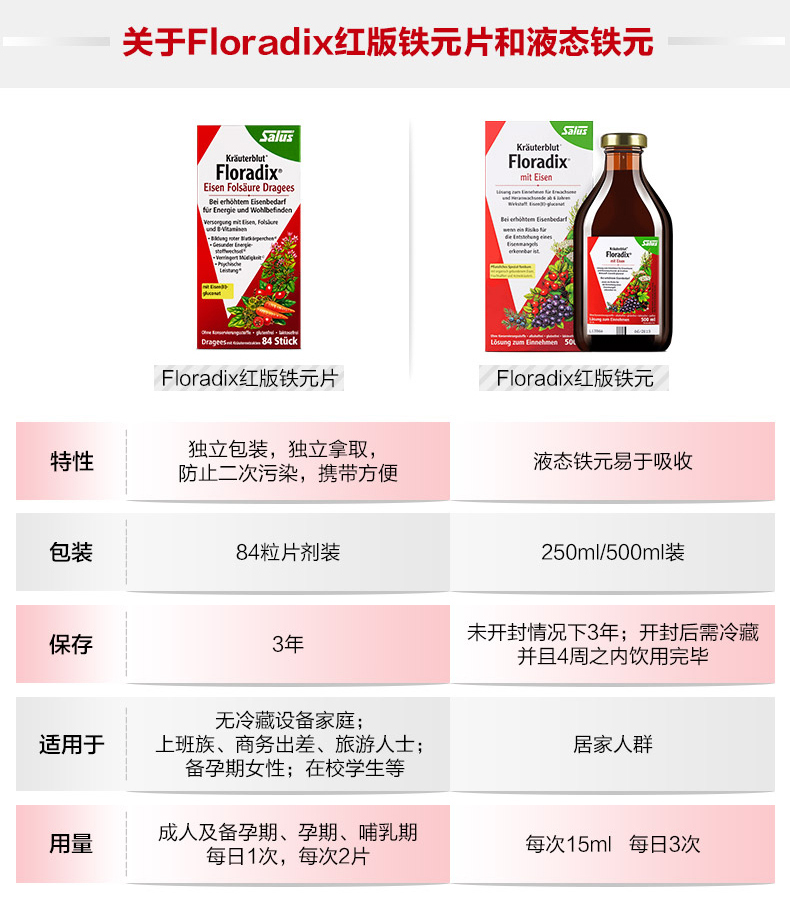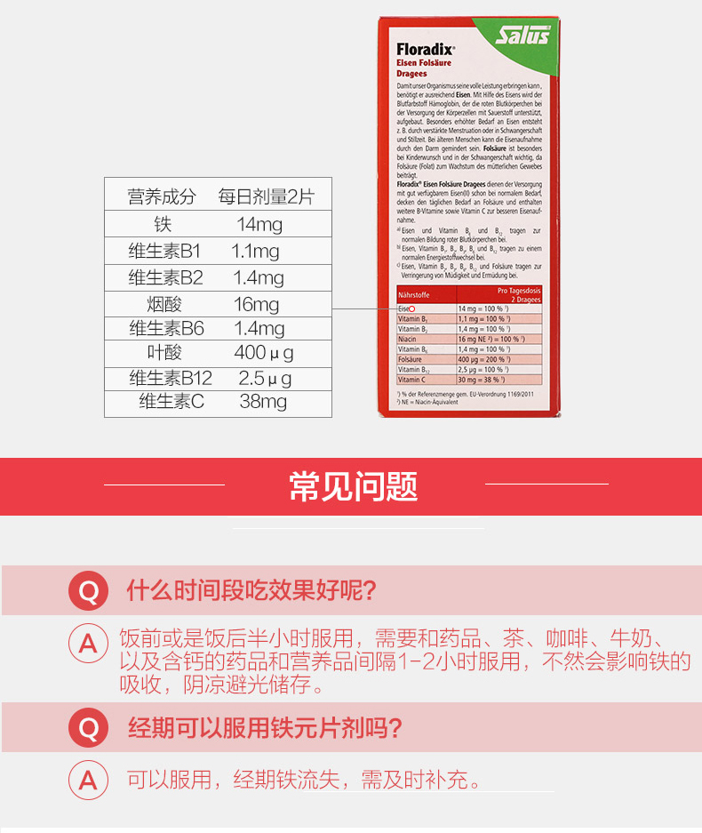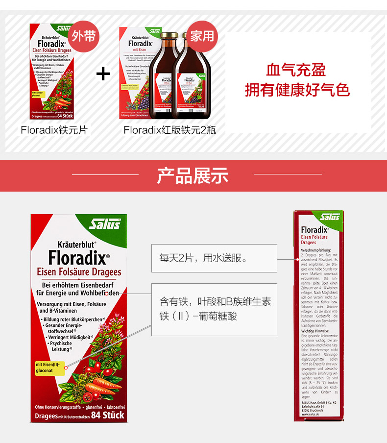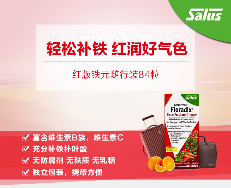 德国Salus进口红铁片铁元叶酸片剂女性孕妇补铁维生素随行装84粒