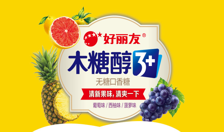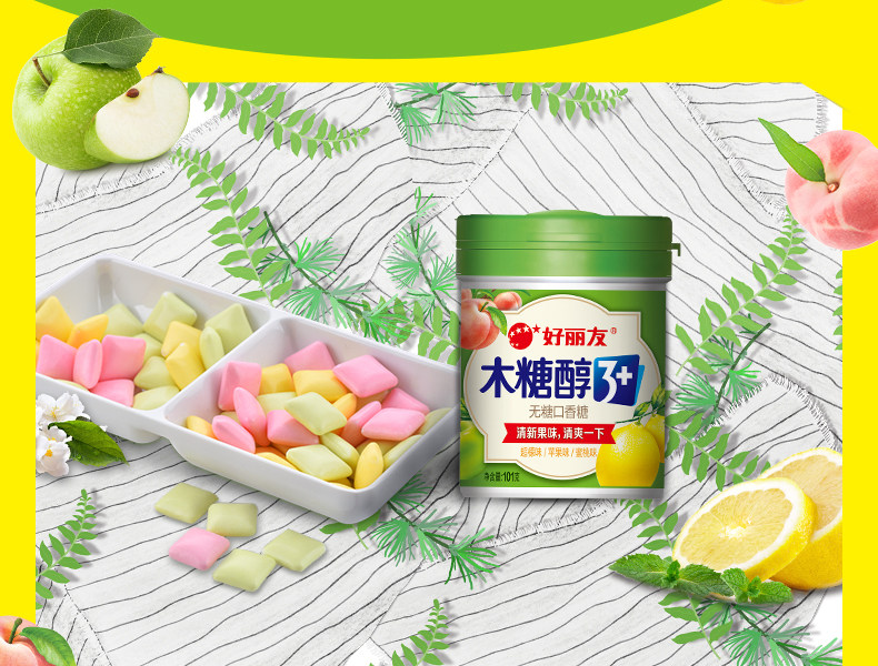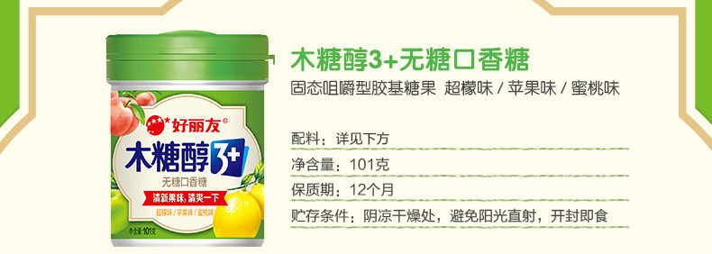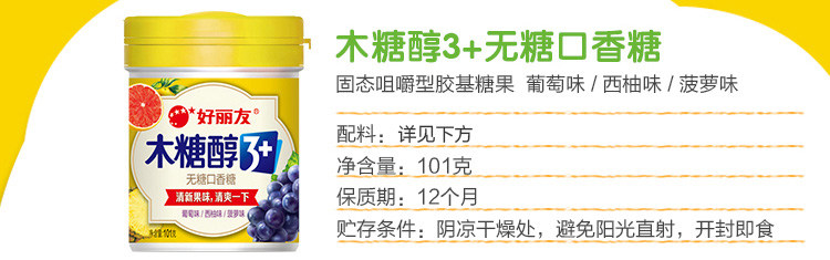好丽友木糖醇无糖口香糖101g/瓶草莓青提香瓜味