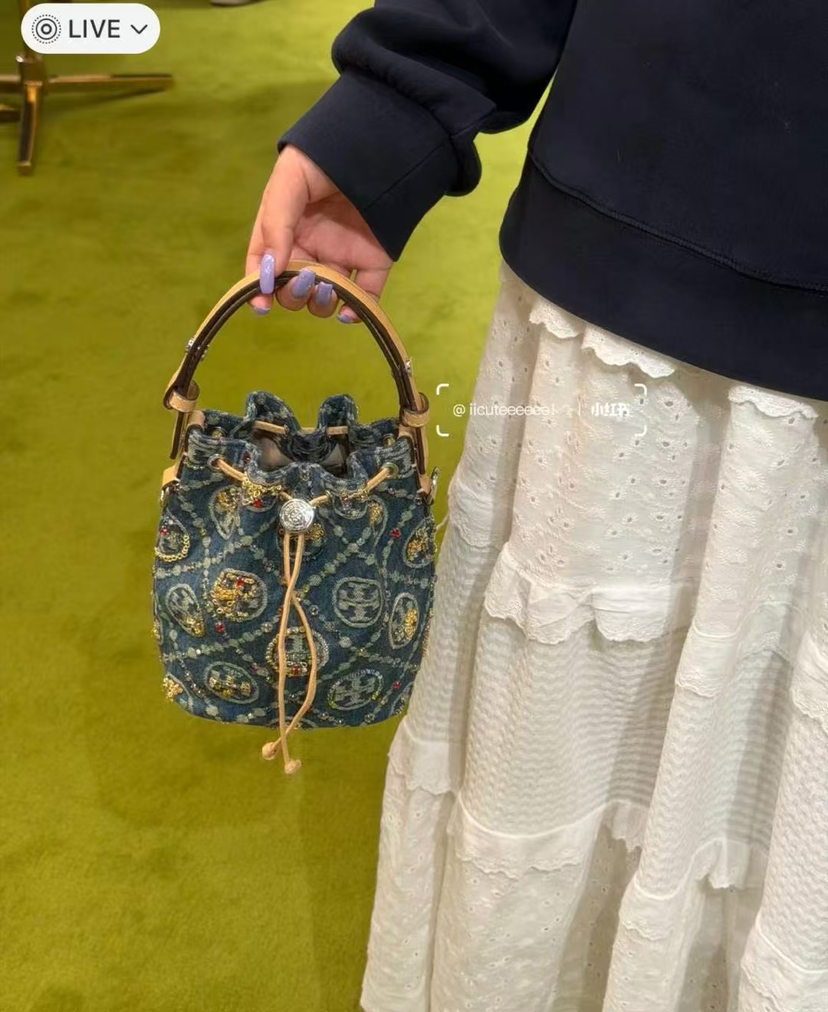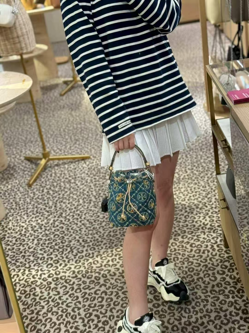 折扣¥3560🇺🇸直邮,Tory burch 专柜限量新款Monogram 小号水桶包,复古牛仔logo镶嵌不规则blingbling的水钻,超级精致!!尺寸约18*14cm